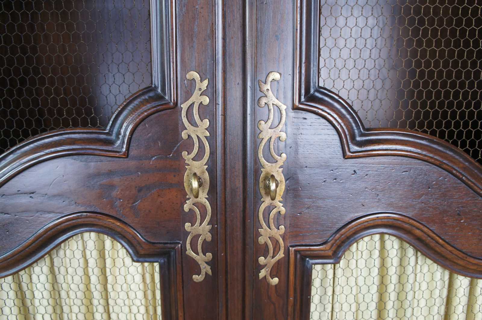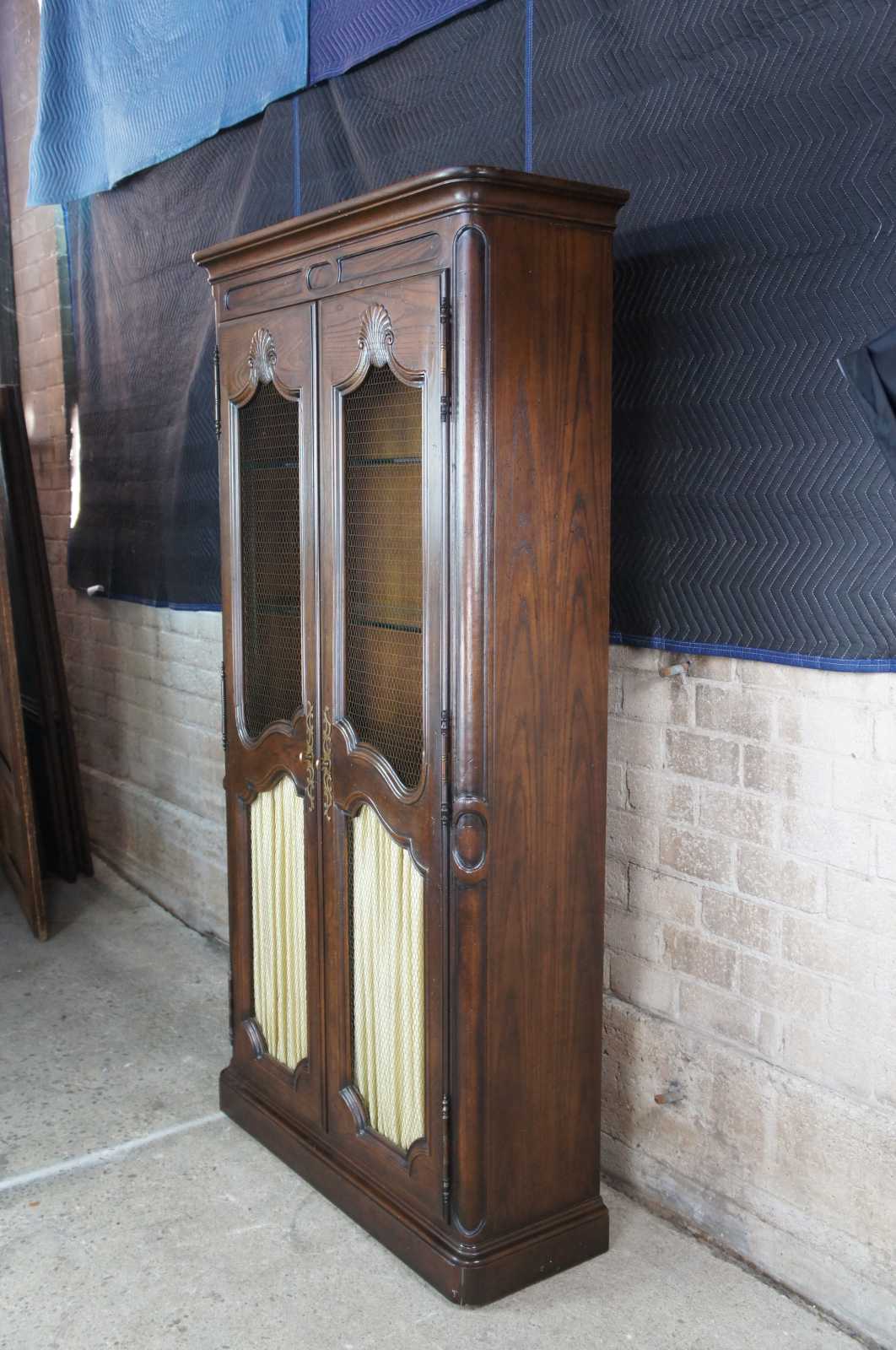 Vintage Henredon lattice door china display or curio cabinet, circa 1980s. Made of oak featuring French country styling with lattice doors and shell motif. Interior illuminates adjustable glass shelving. Includes silk lining for lower doors that can installed to conceal china or collectibles. 49-7001.