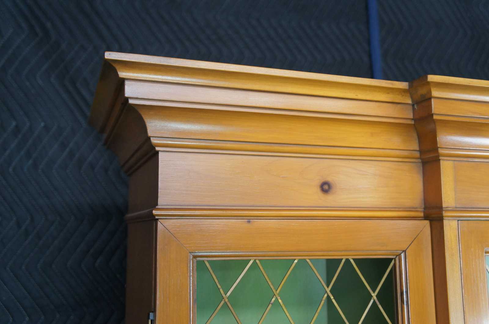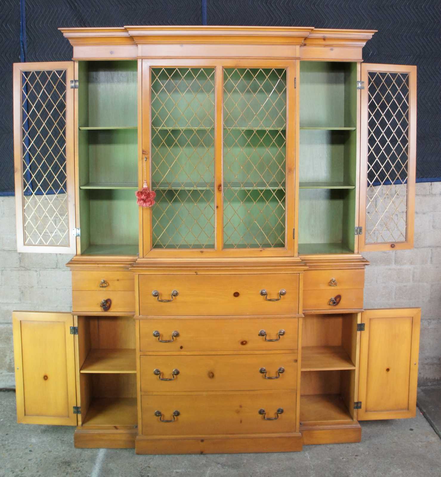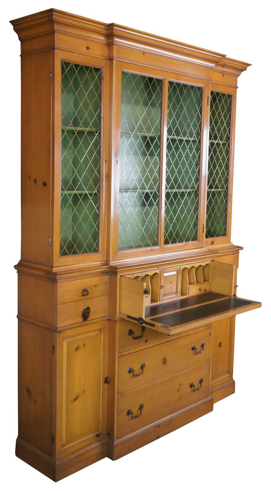 Colonial Manufacturing Company Treasure House breakfront, circa mid 20th century Made from pine featuring drop front leather butler writing surface with multiple cubbies and drawers, with side cabinets, lower drawers, and brass lattice doors with green painted interior. Purchased from the Rike Kumler Co in Dayton Ohio.br