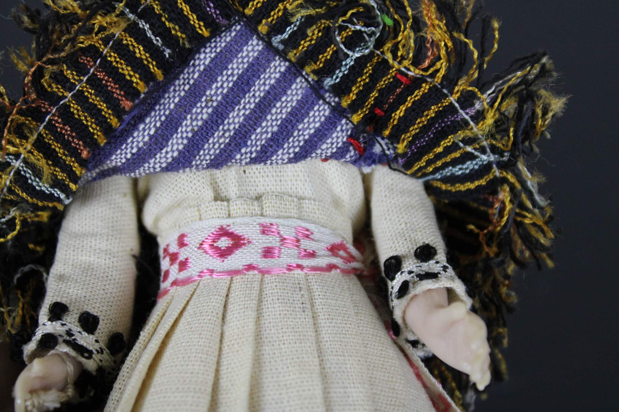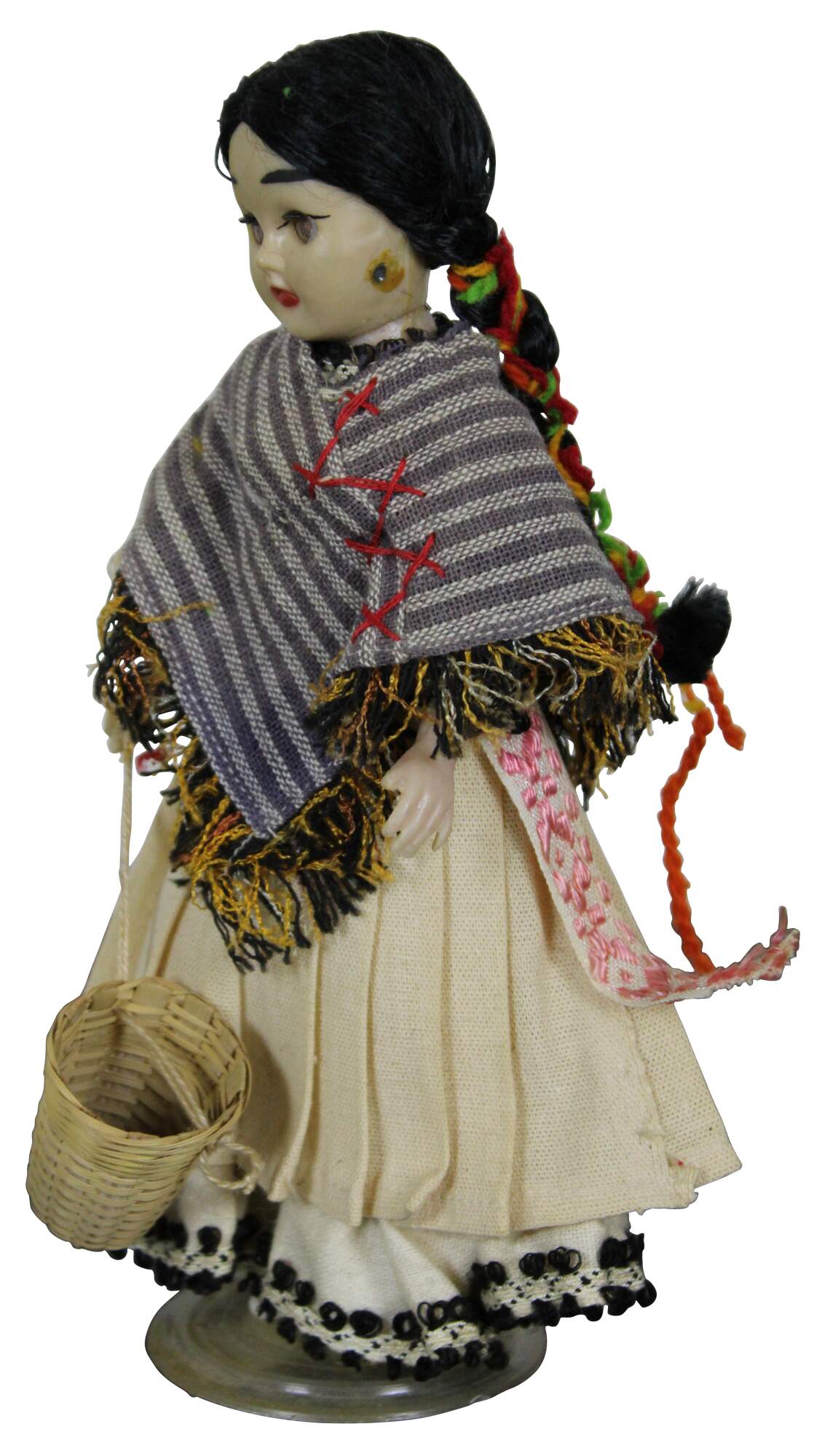 Vintage plastic bodied folk doll in a dress and poncho with braided hair, carrying a basket; marked on the bottom “Mazahuatl Mex.”