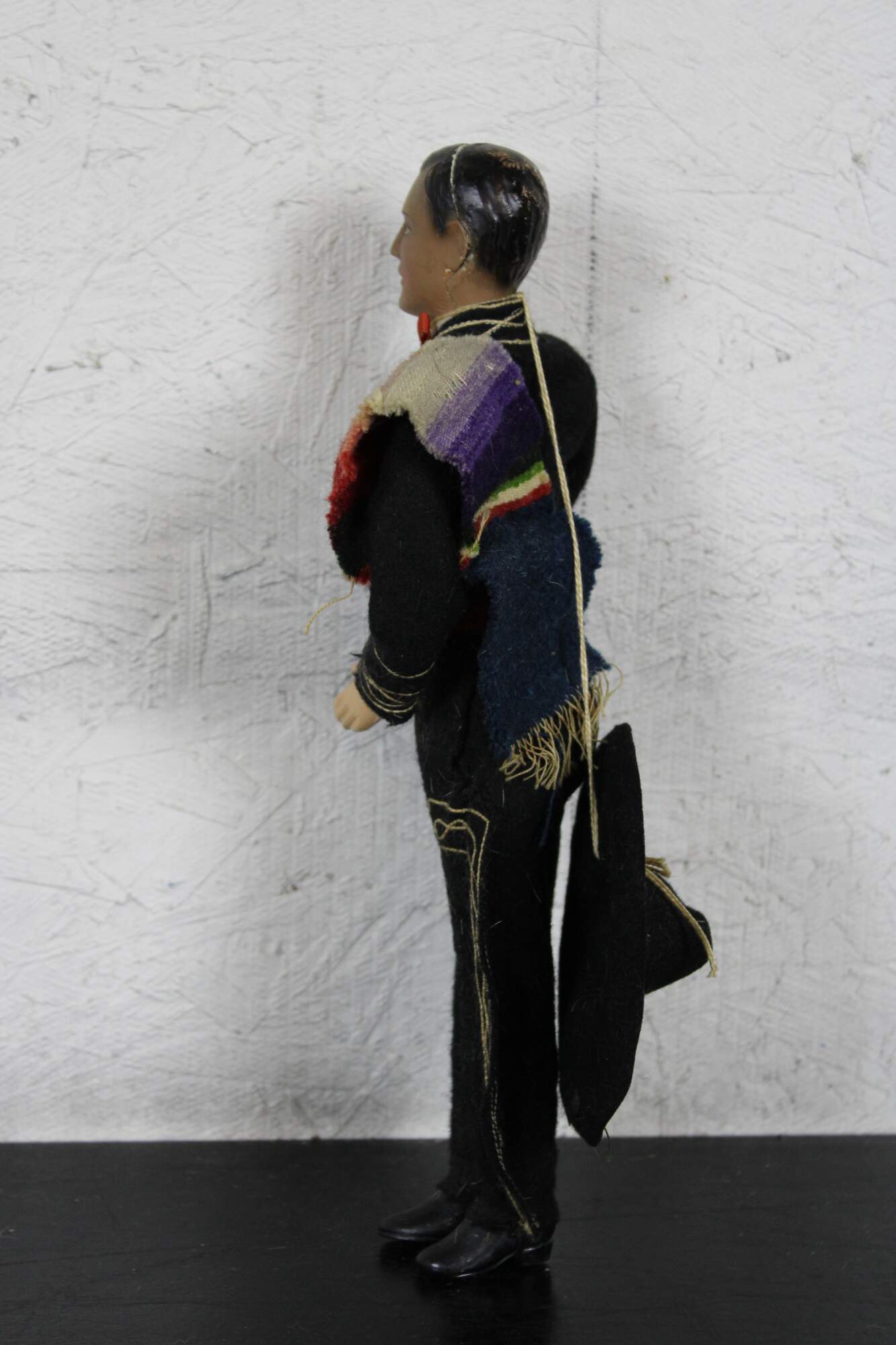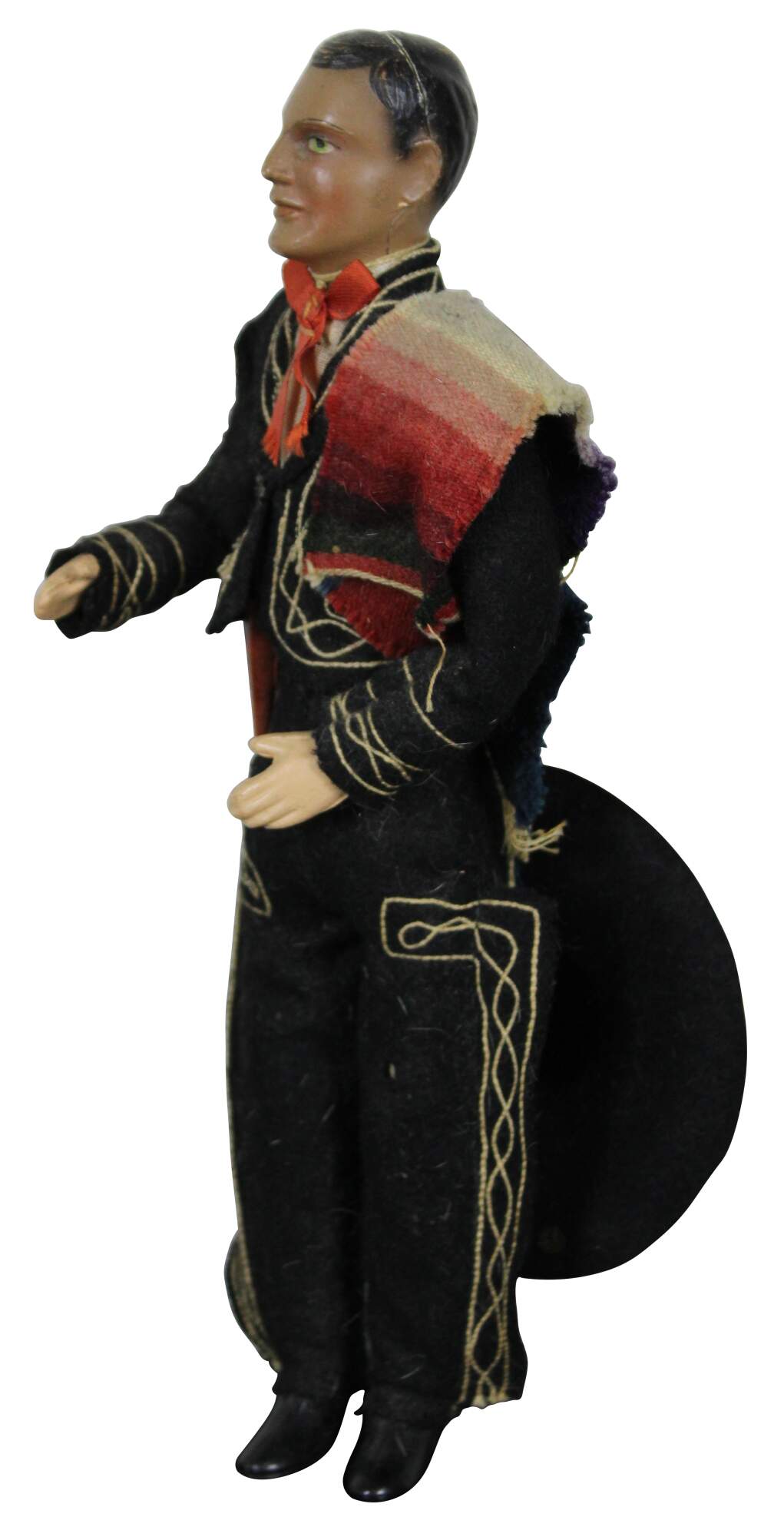 Antique celluloid man doll dressed in a traditional mariachi / charro (horseman’s) outfit in black and gold, with a woven blanket on his shoulder and a six-shooter pistol on his hip.