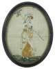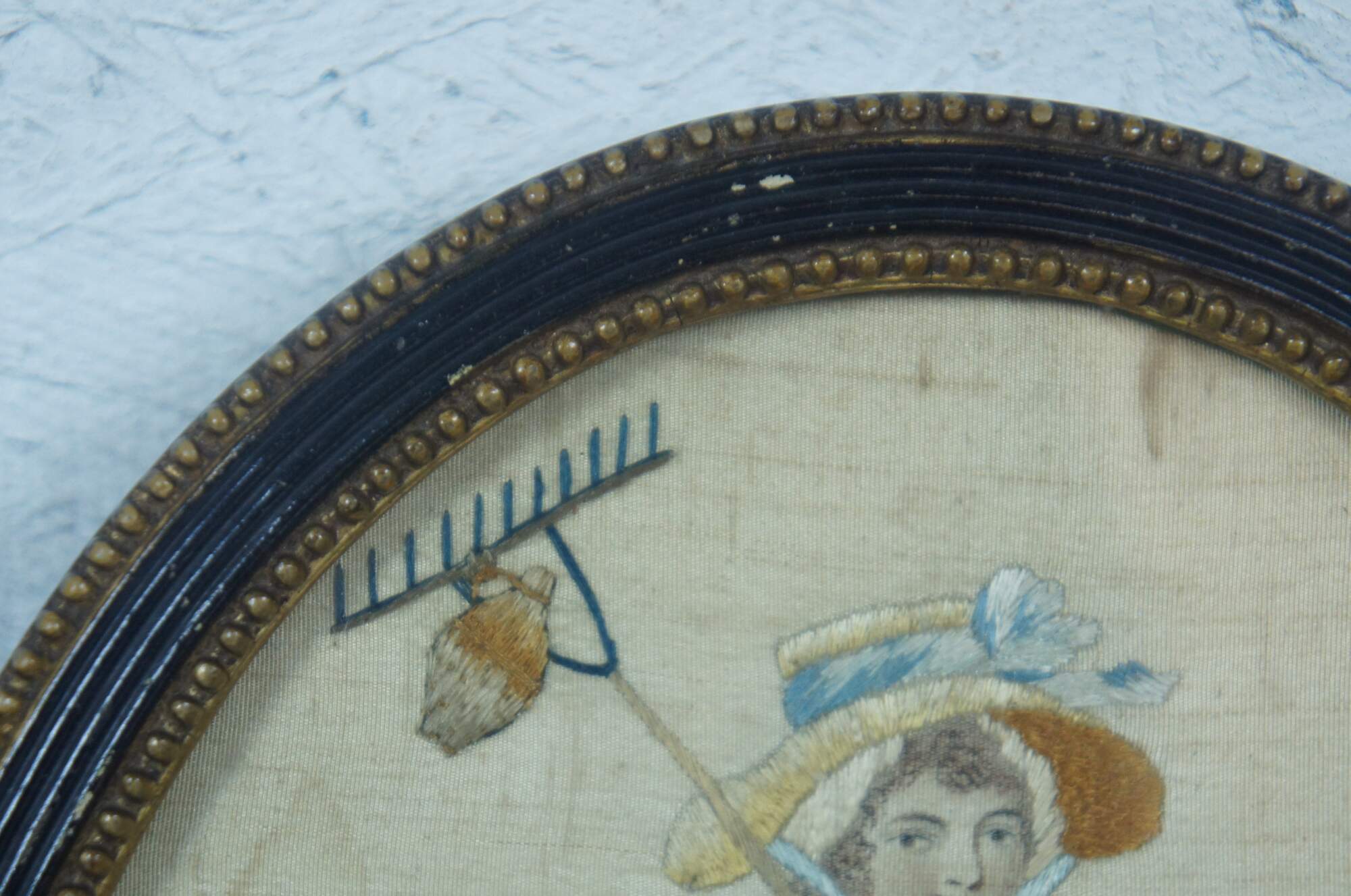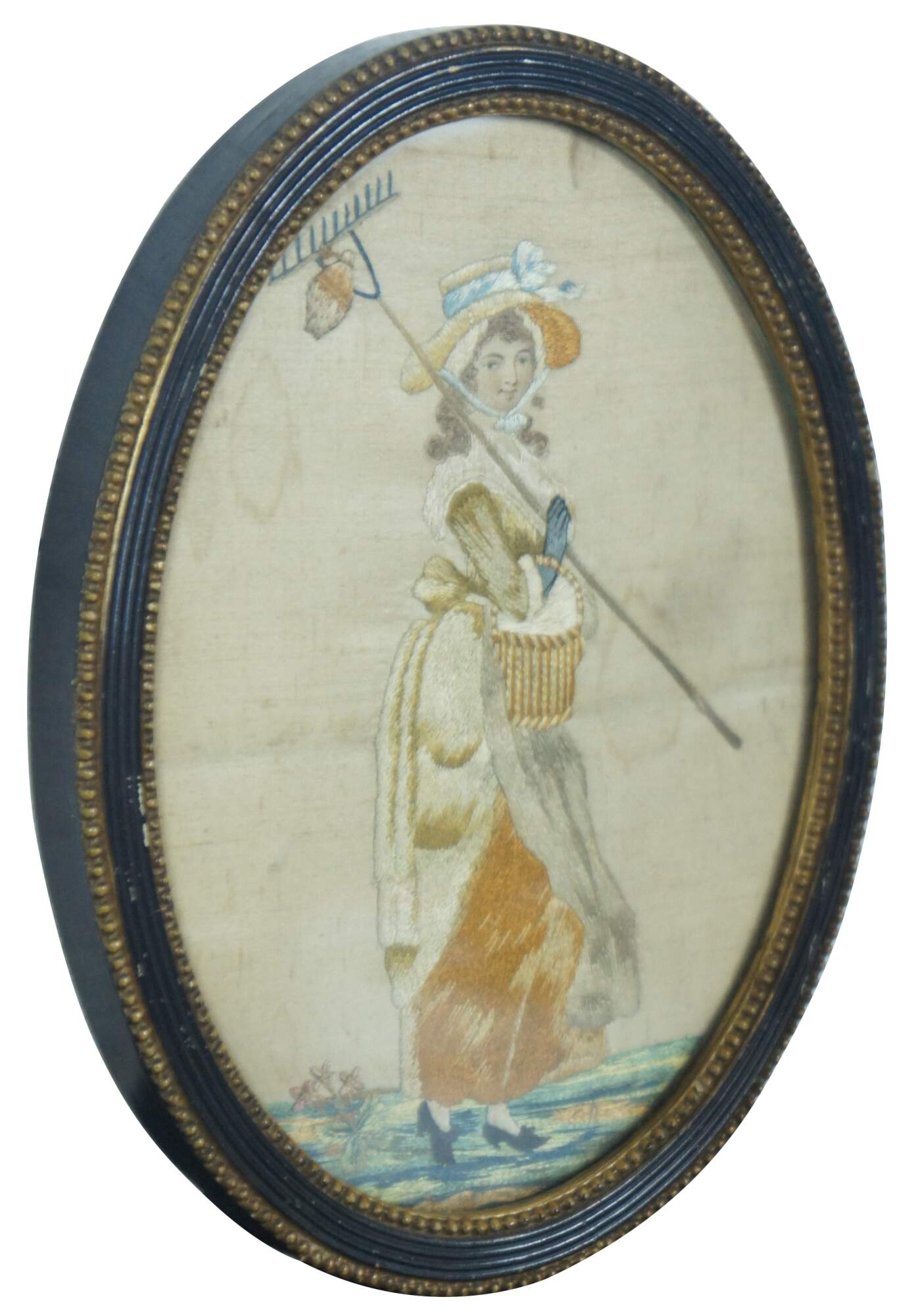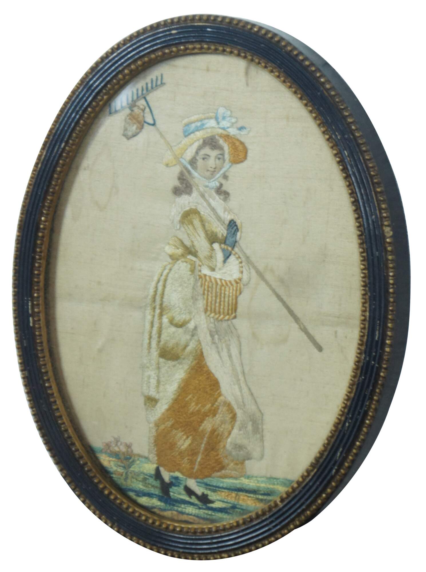 Antique French silk embroidered stumpwork picture of a pastoral woman in a seemingly fine dress and hat, carrying a basket and a rake.