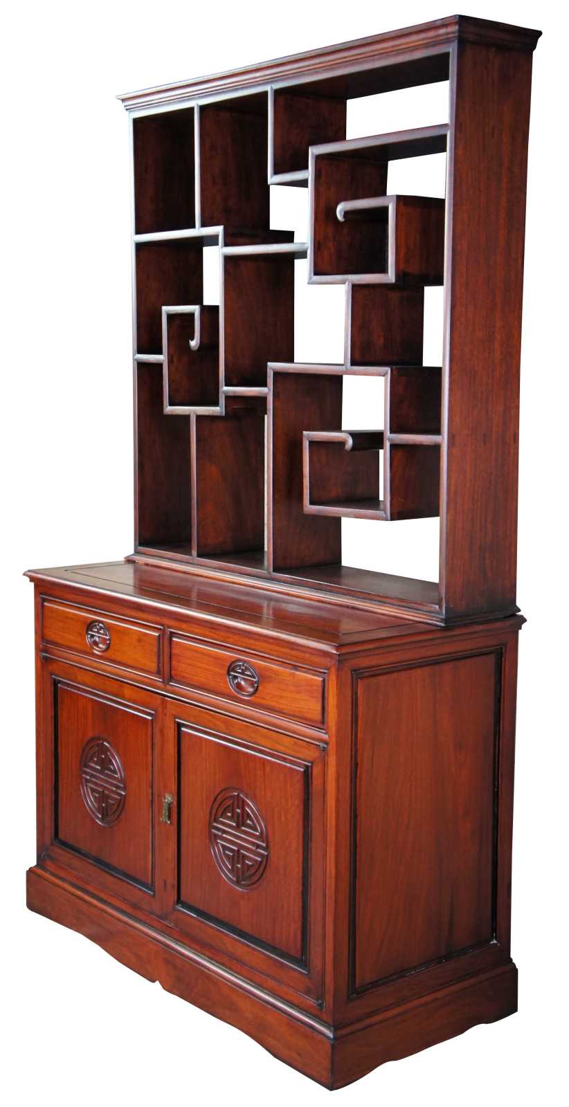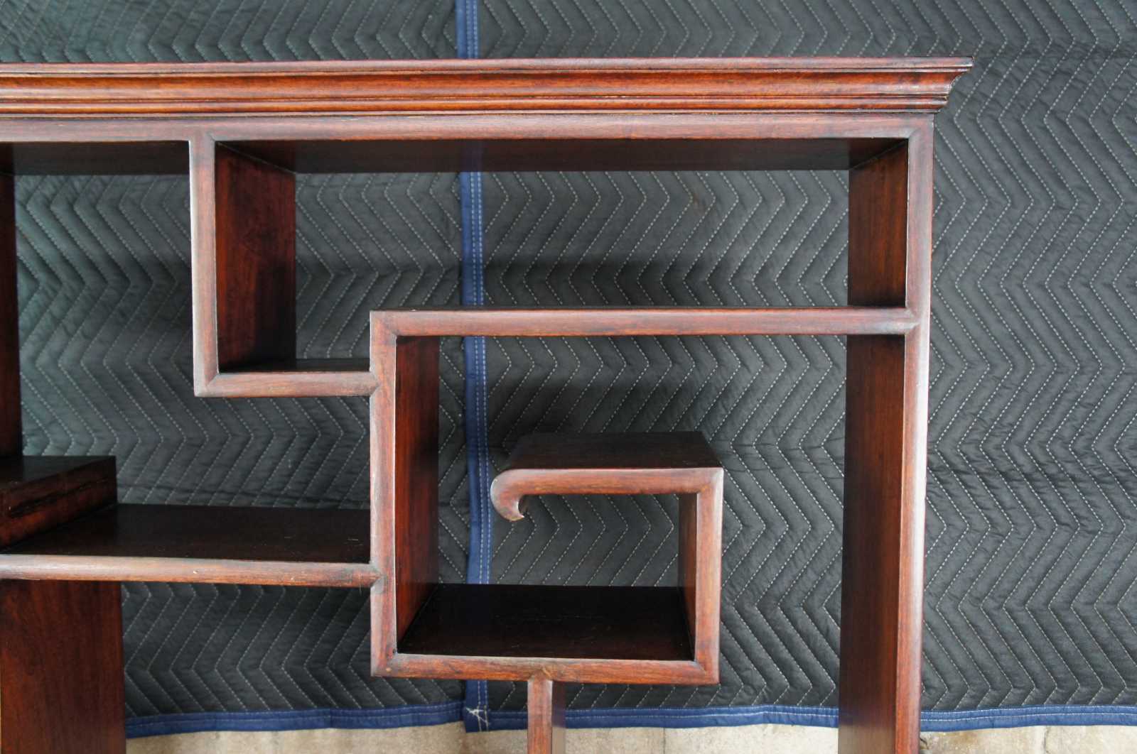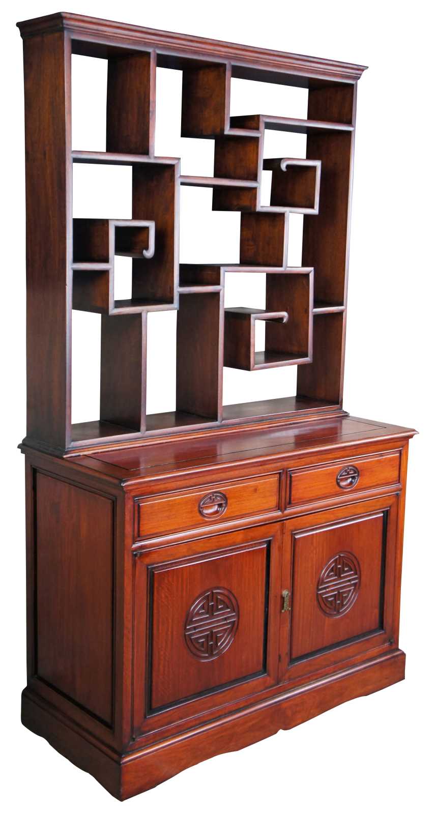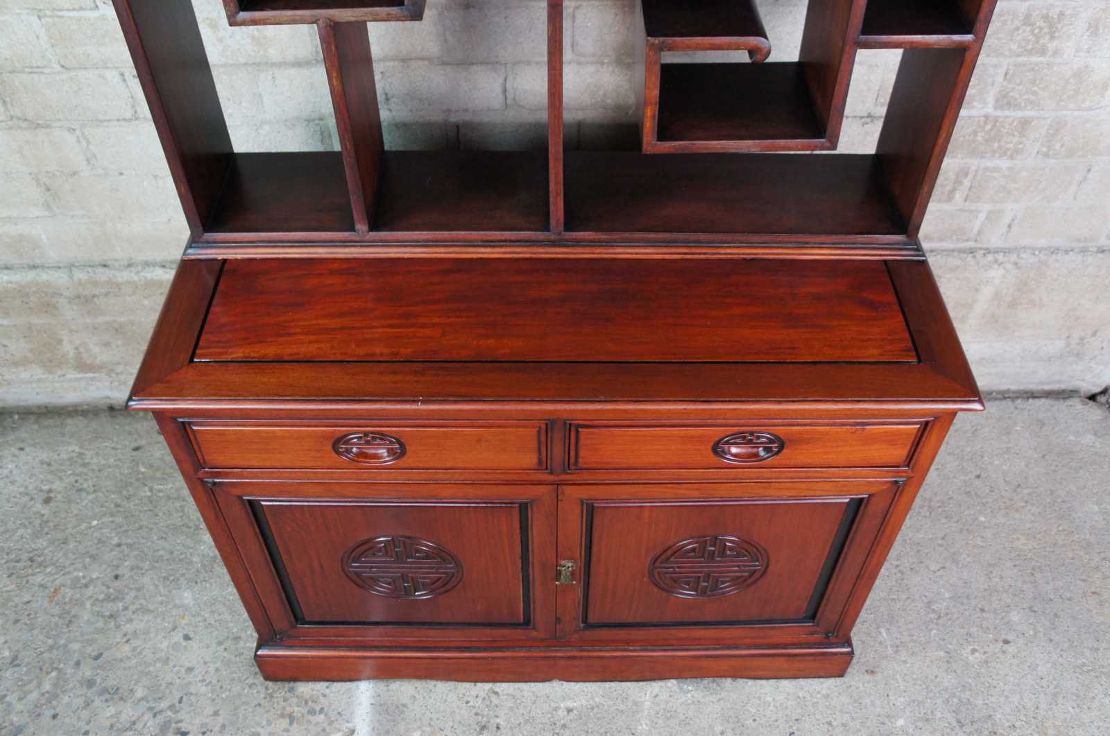 Antique Chinese Chinoiserie Ming Rosewood etagere cabinet. Made of solid rosewood featuring tiered upper bookcase curio shelving with two lower drawers and one cabinet.