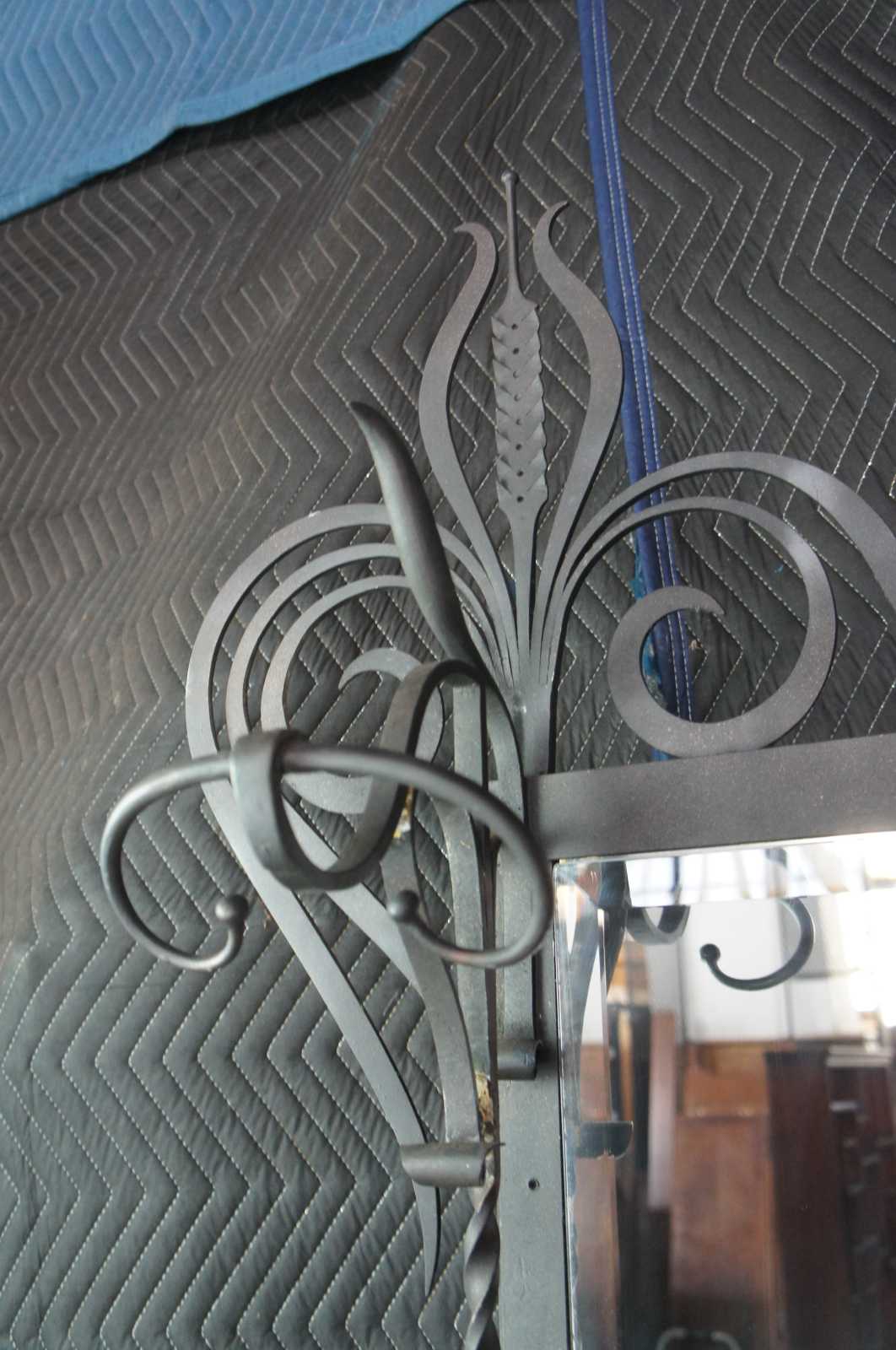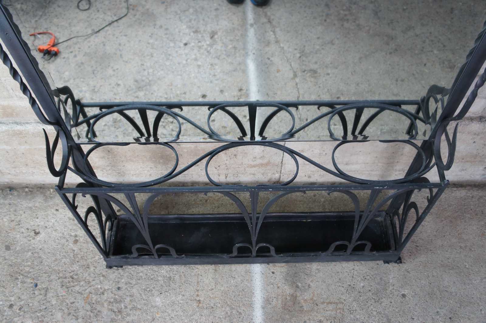 Monumental French hall tree, coat rack or umbrella / cane stand. Made of wrought iron featuring a sleek low profile with scrolled and twisted accents, large beveled mirror, and multiple areas for storage and hanging.