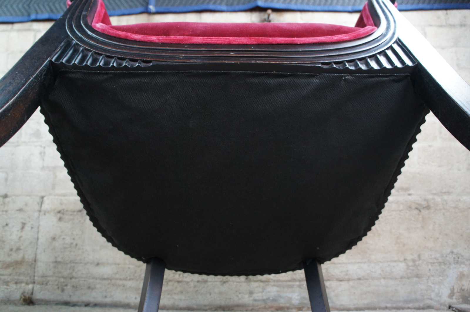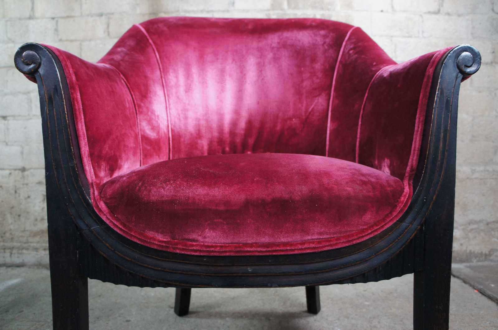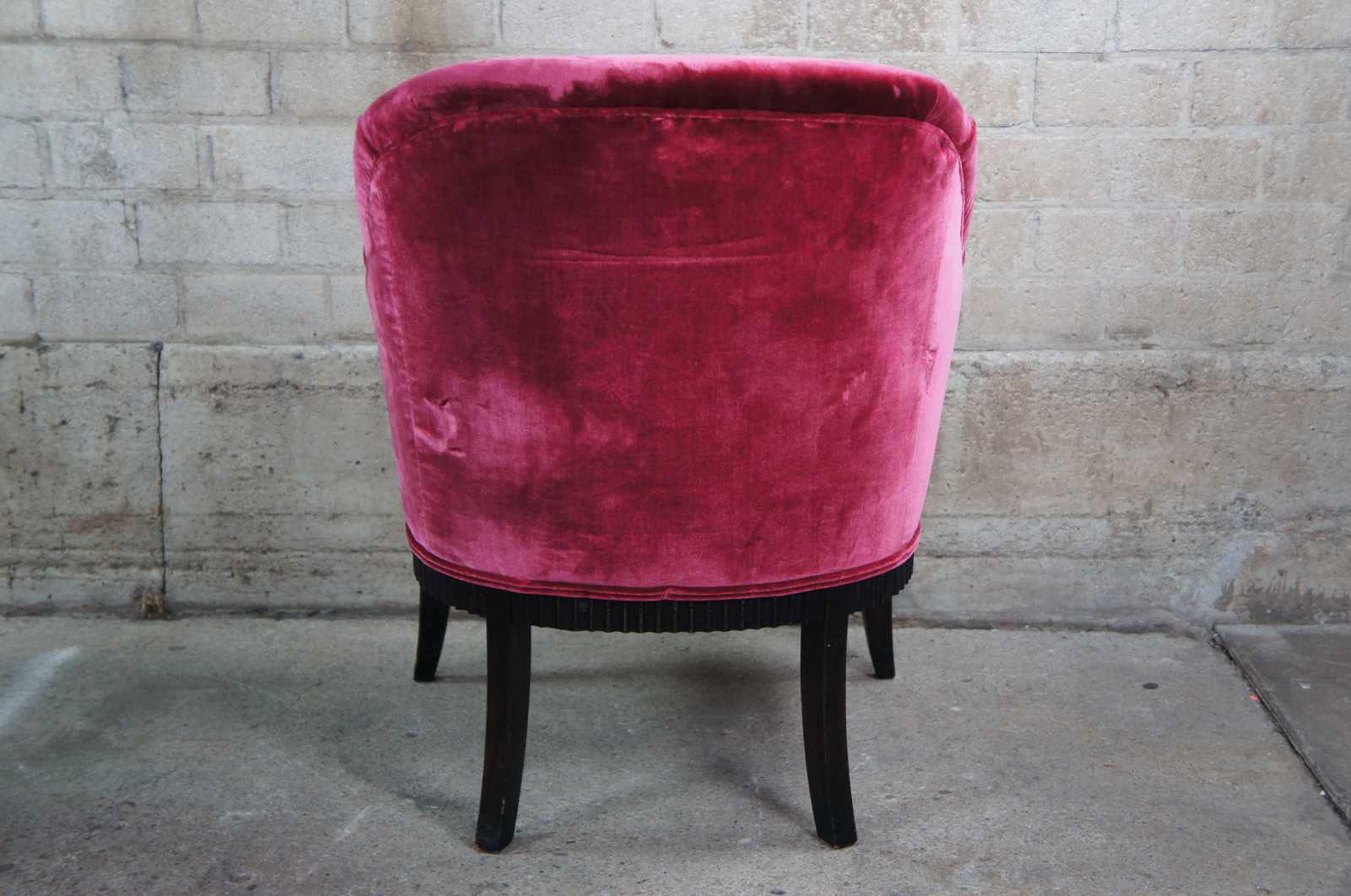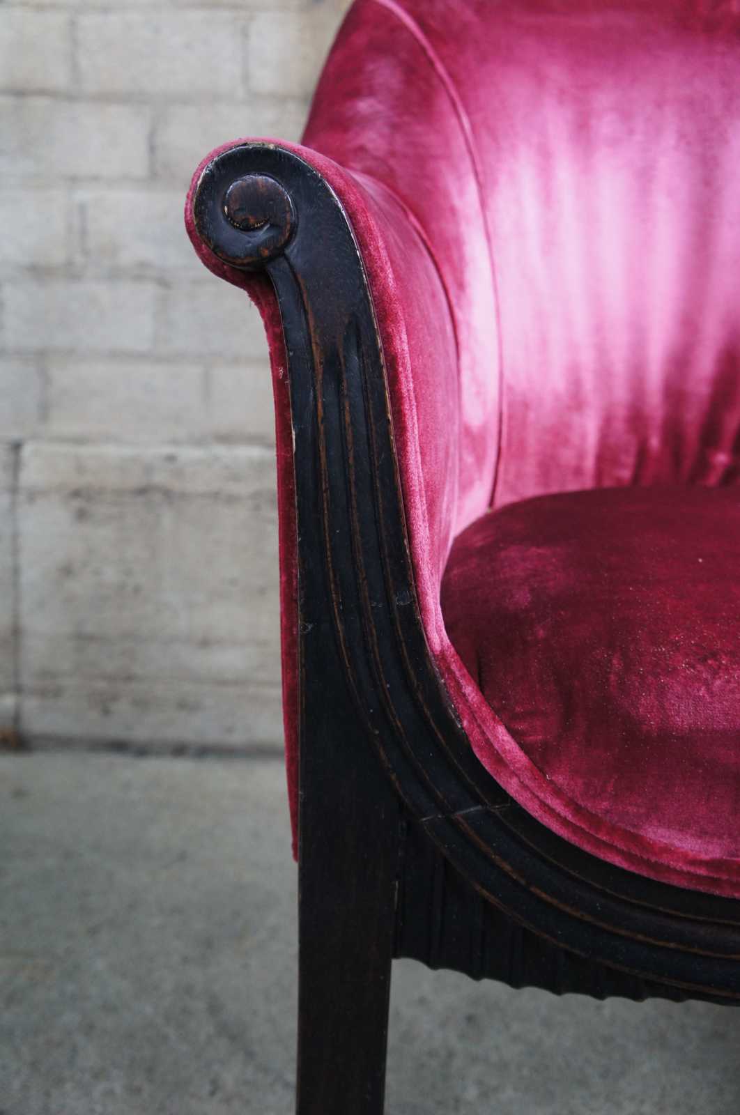 Pair of late Art Deco arm chairs. Made from mahogany with an ebonized frame featuring flared and scrolled arms, pink velvet fabric and a ribbed apron. A nice compliment to your library or living space.