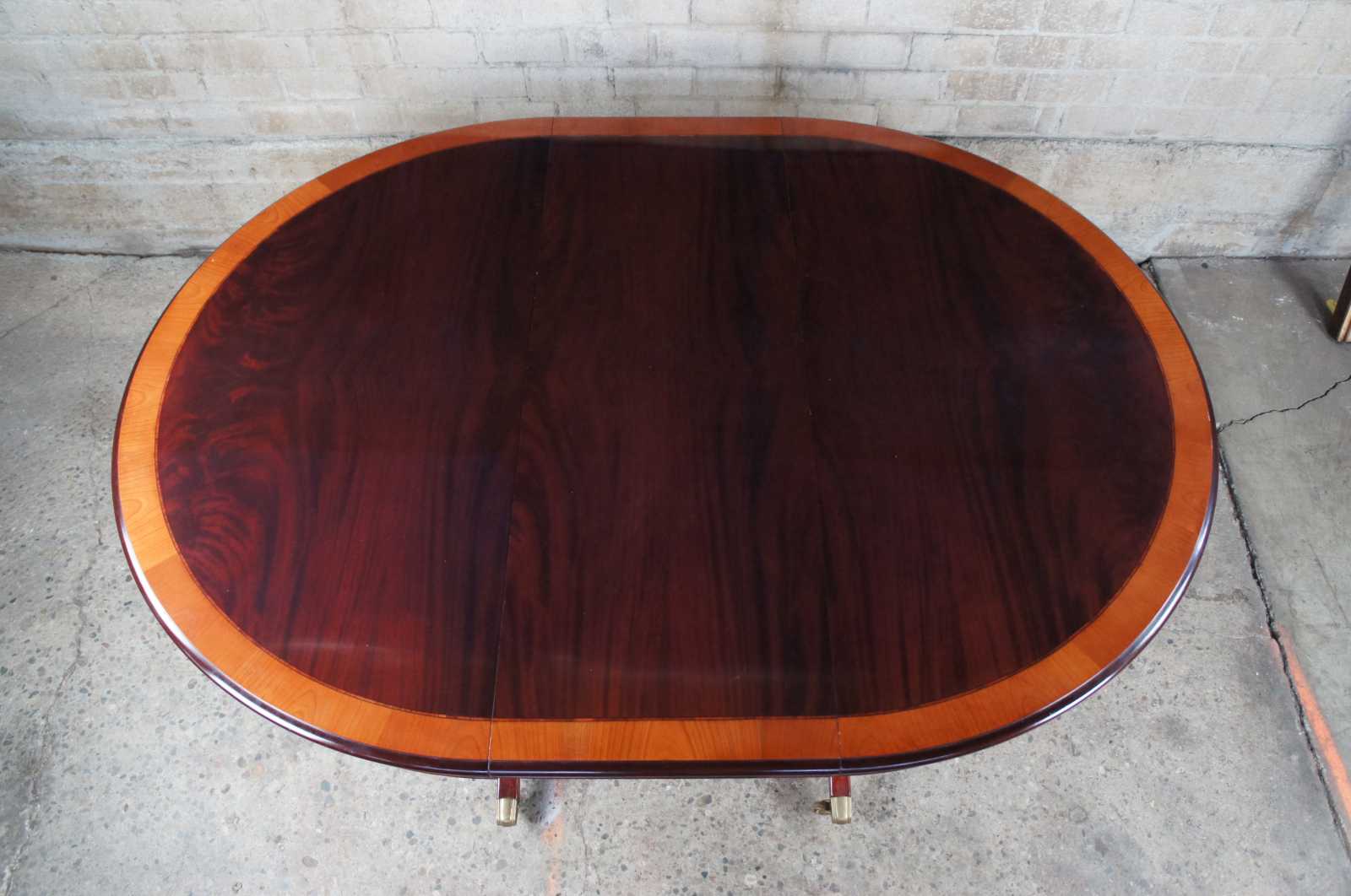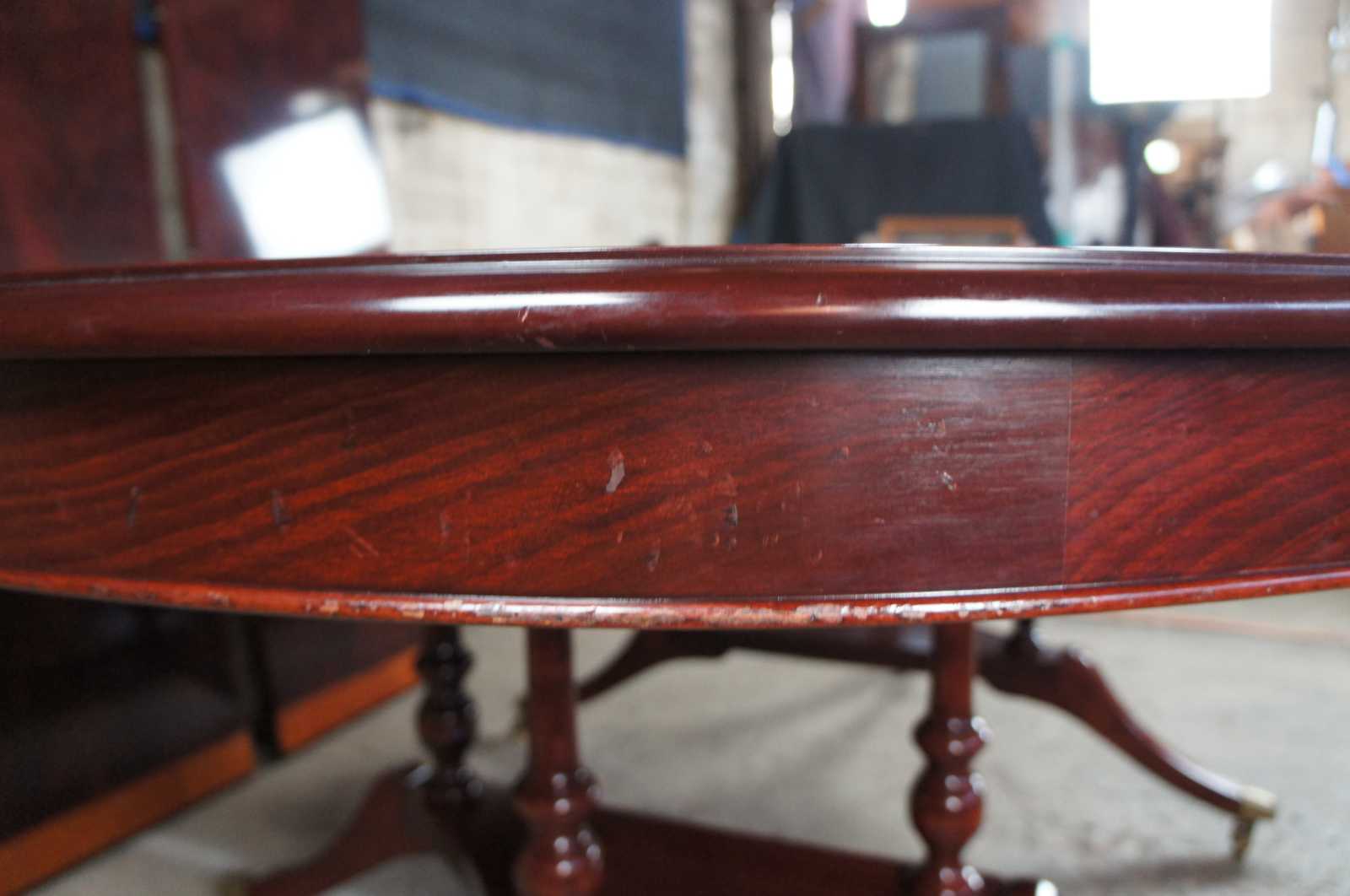Vintage flame mahogany pedestal table featuring round or oval form with banded top, double pedestal base and swivel castors. Attributed to Ethan Allen's 18th Century Collection.