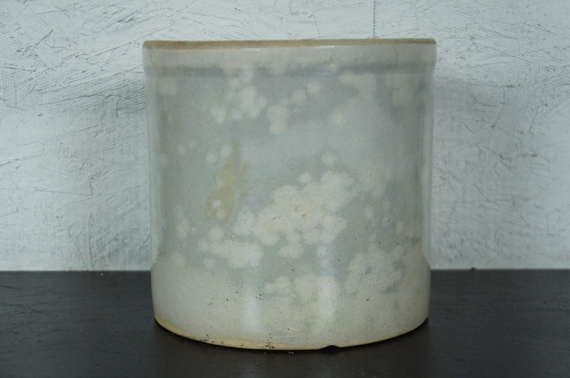 Lot of three antique unmarked plain salt glazed stoneware crocks; estimated 1 gallon capacity.
