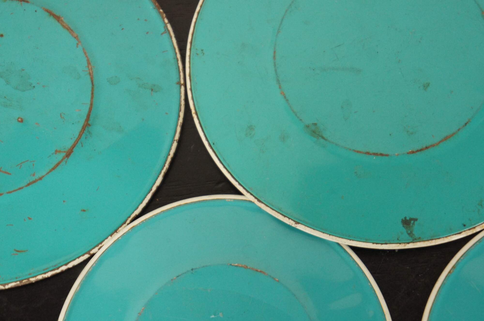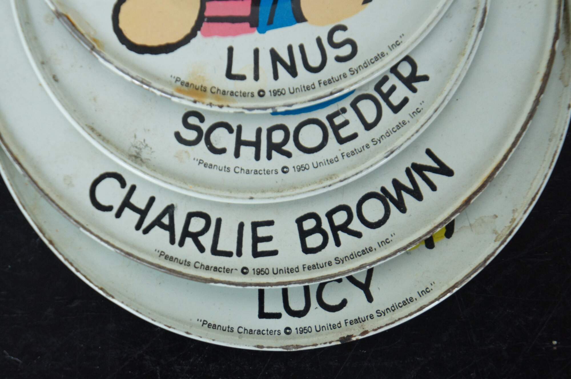 Set of seven 1950s and 1960s tin play plates featuring Peanut’s characters Sally, Lucy, Charlie Brown, Peppermint Patty, Schroeder, Linus, and Frieda.