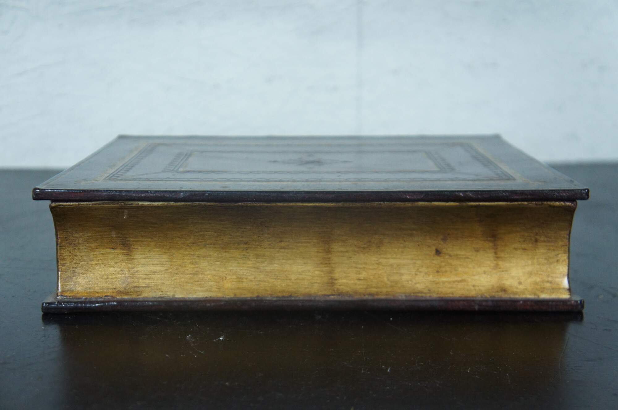 Faux book shaped trinket box finished in oxblood red tooled leather with gold accents and page edges; titled “American History.” attributed to Maitland Smith.