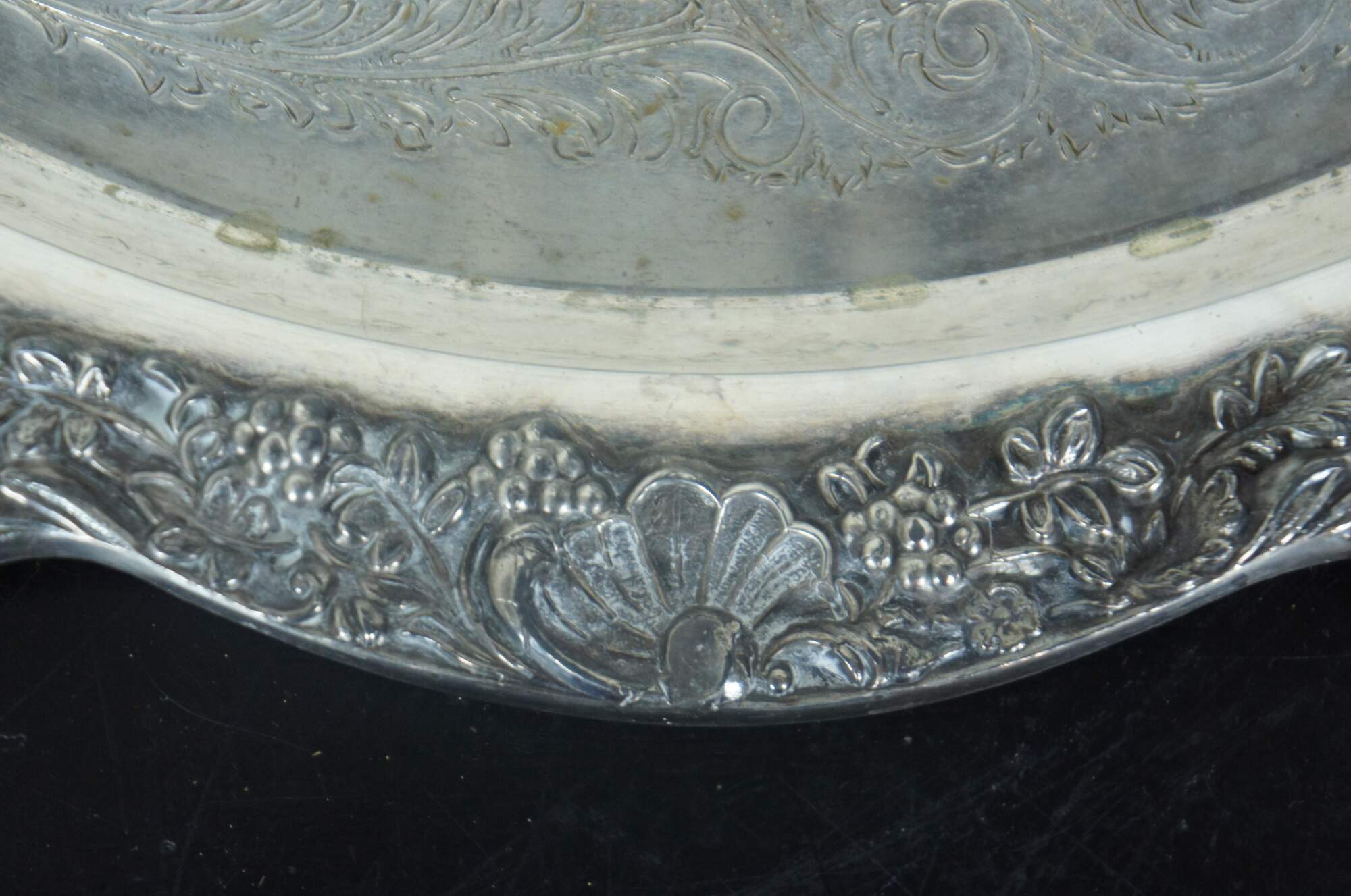 Vintage F. B. Rogers round silver plate serving tray with etched floral and scallop shell pattern in the middle and a border of swirling flowers. “F. B. Rogers Silver Co. was a silversmithing company founded in Shelburne Falls, Massachusetts in 1883. It was acquired by Edmund W. Porter and L.B. West, who incorporated the company and moved manufacturing operations to Taunton, Massachusetts in 1886. For several years, the company was known as West Silver Company, and produced silver products for the William Rogers Manufacturing Company of Hartford, Connecticut. About 1904, West and Porter retired and sold the company to William Davison, Carleton A. Woodward and H.E. Nearing, who changed the company's name back to F.B. Rogers.