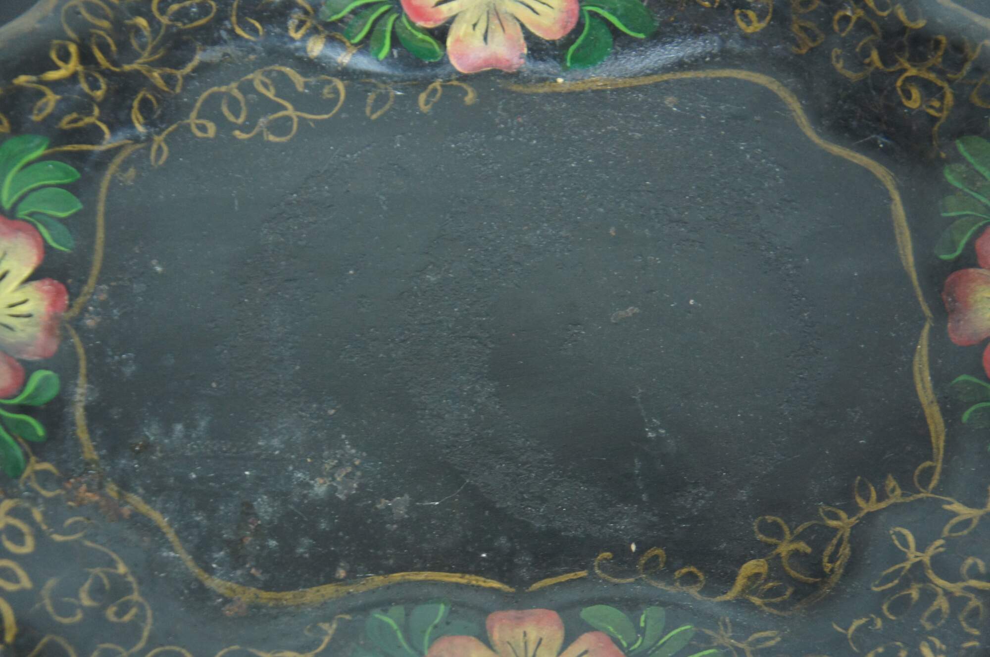 Antique toleware, painted metal serving tray with scalloped edges, painted with a borer of gold swirls and white flower blossoms tinged with pink.