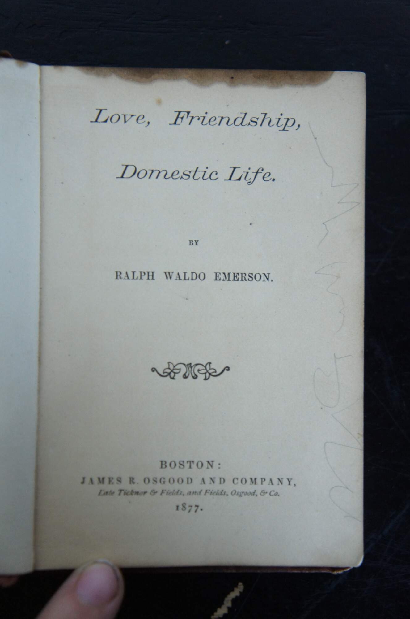 Antique copy of “Love, Friendship, Domestic Life” by Ralph Waldo Emerson, published in the Vest Pocket Series by James R. Osgood & Company, 1877. Bound in oxblood red with gilded letter and black vine designs.