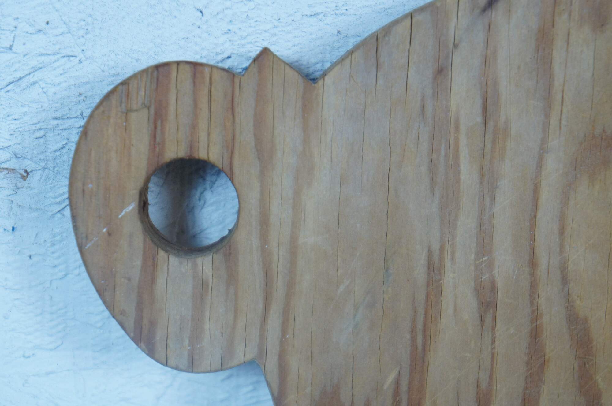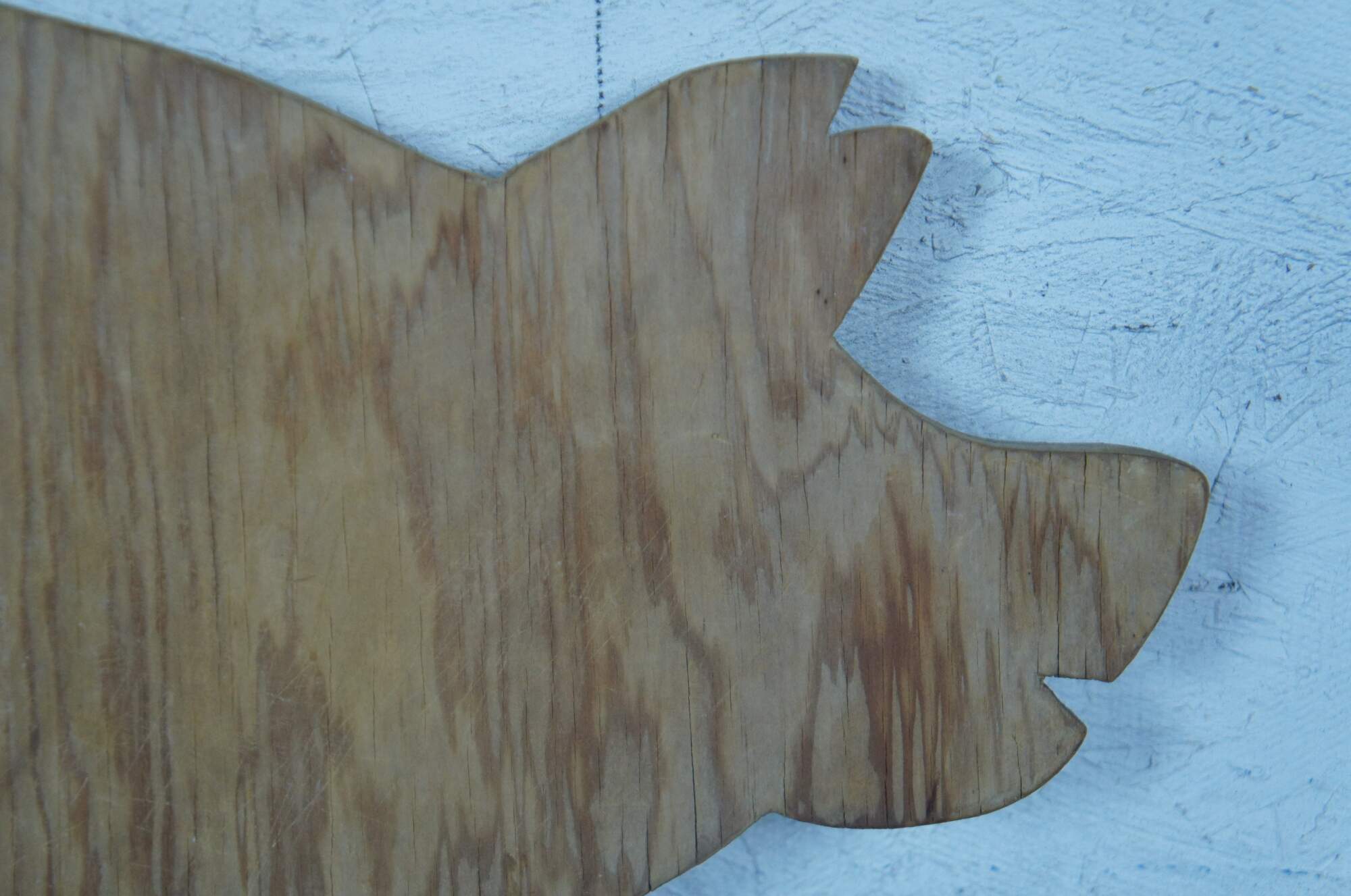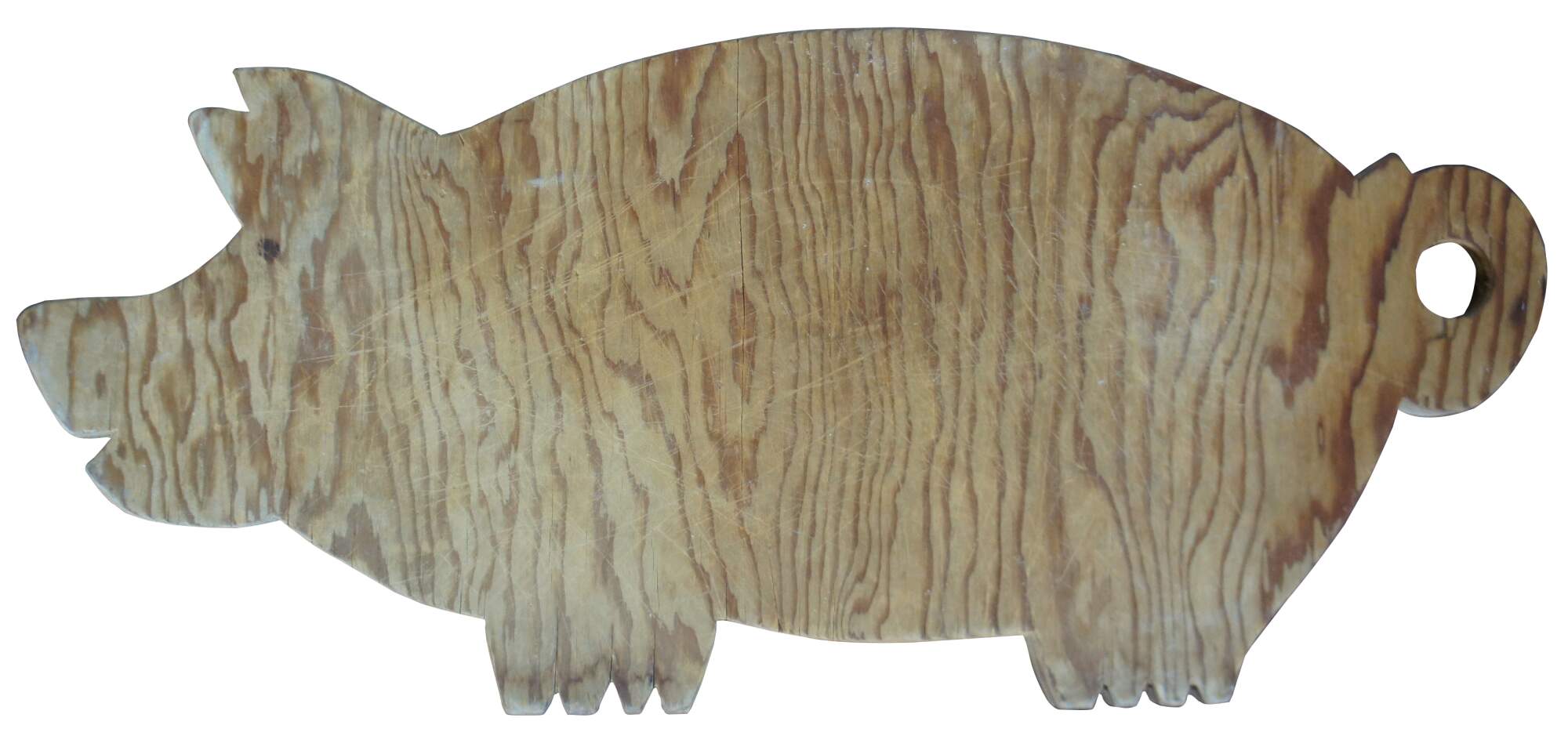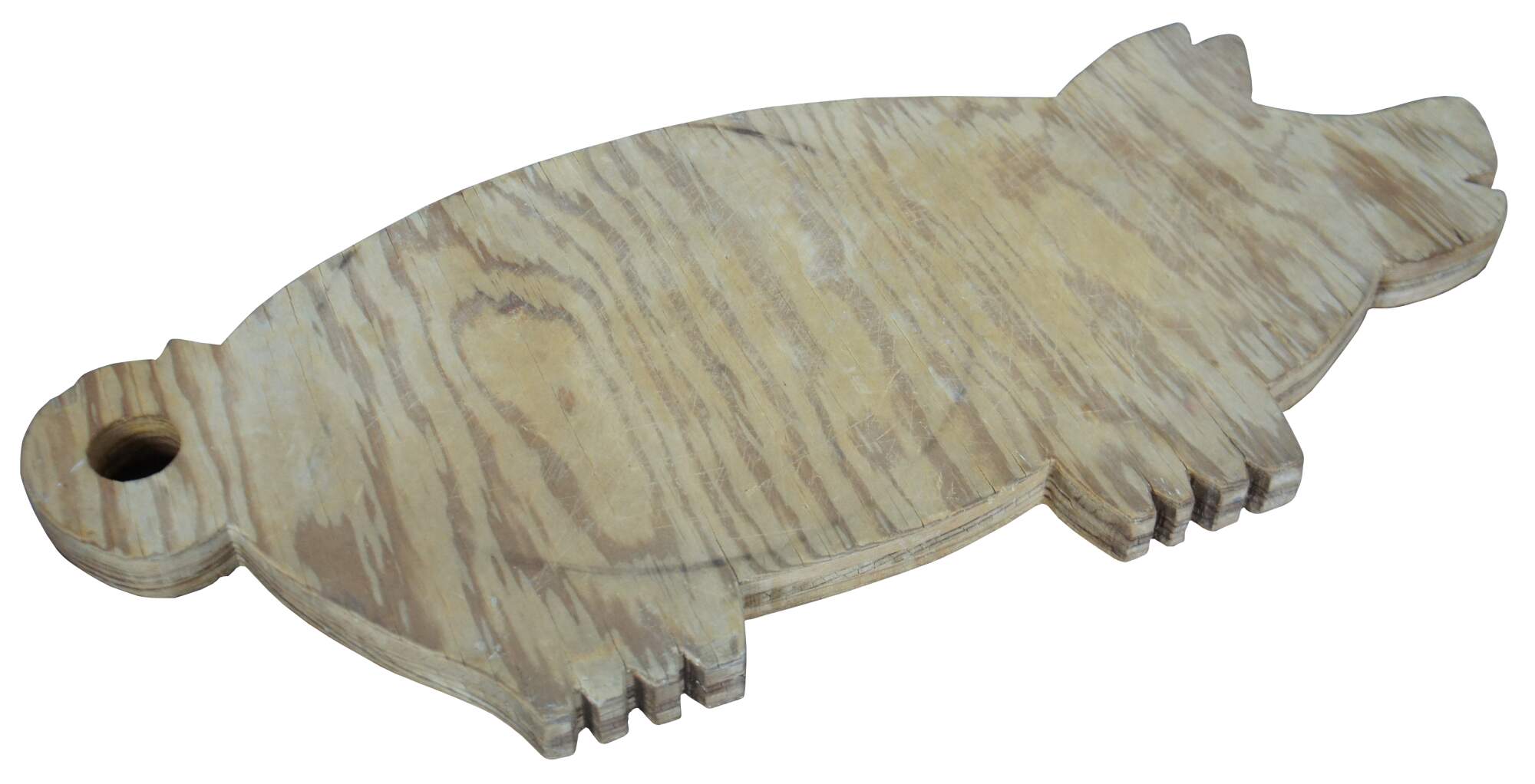 Vintage hand made pig shaped plywood cutting board with tail curled into a ring for hanging.