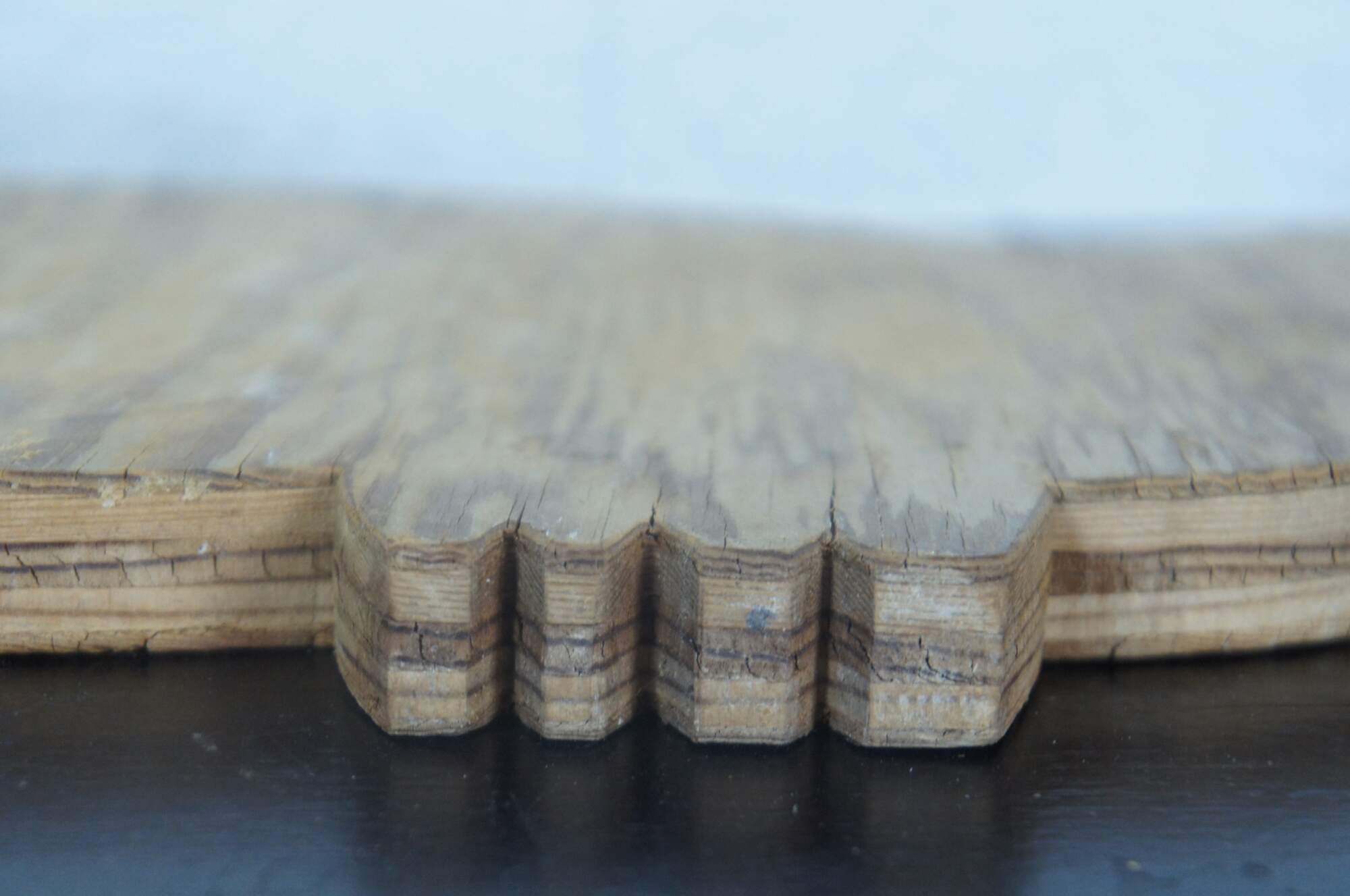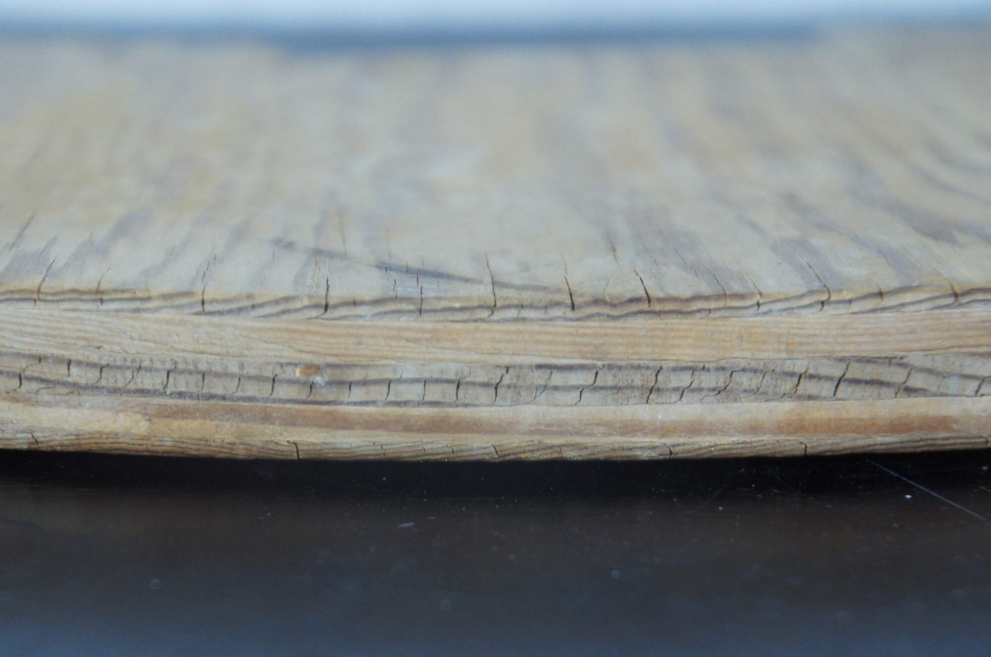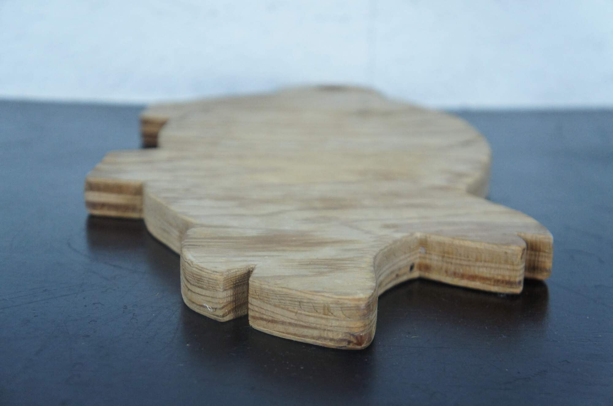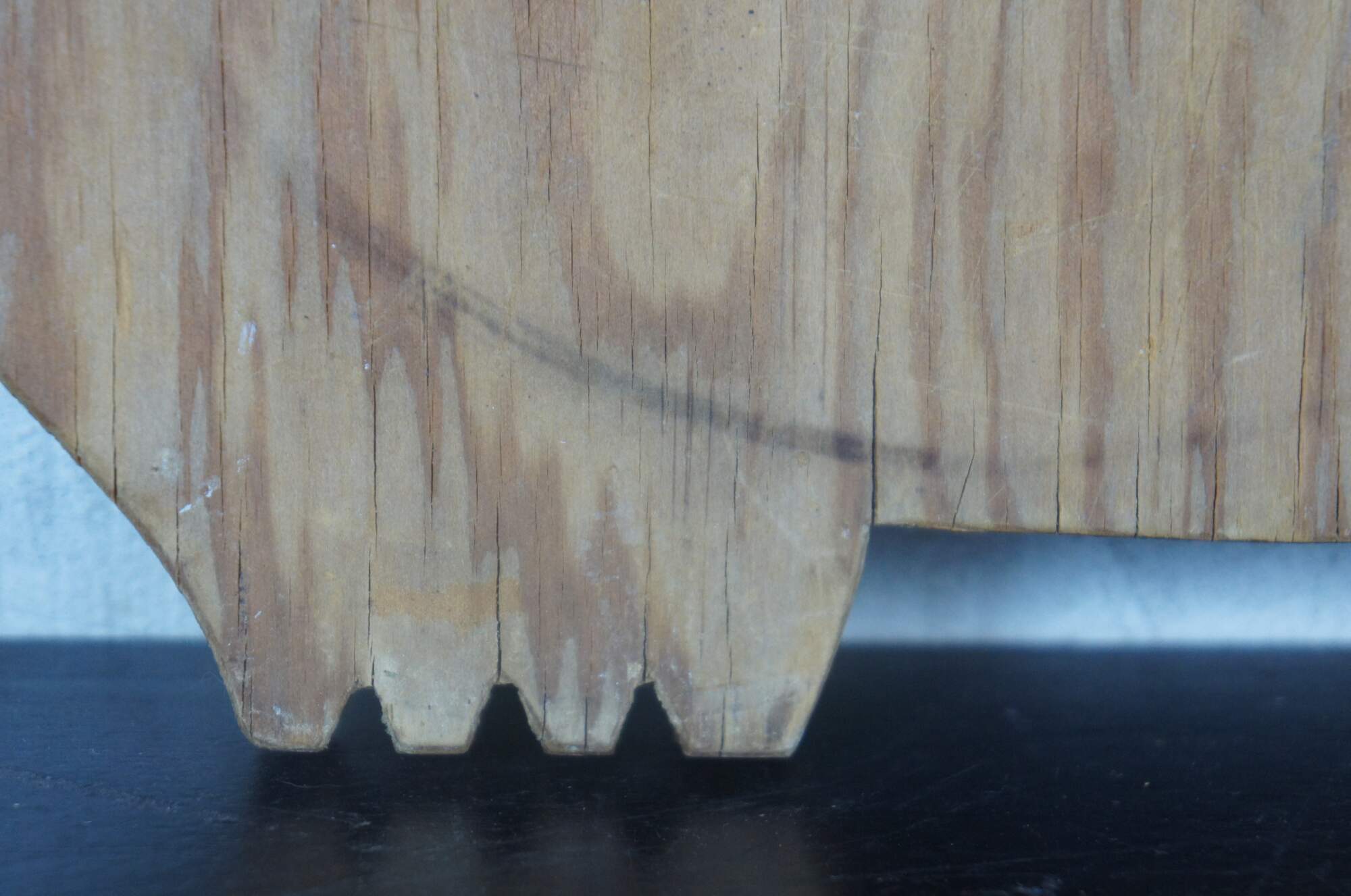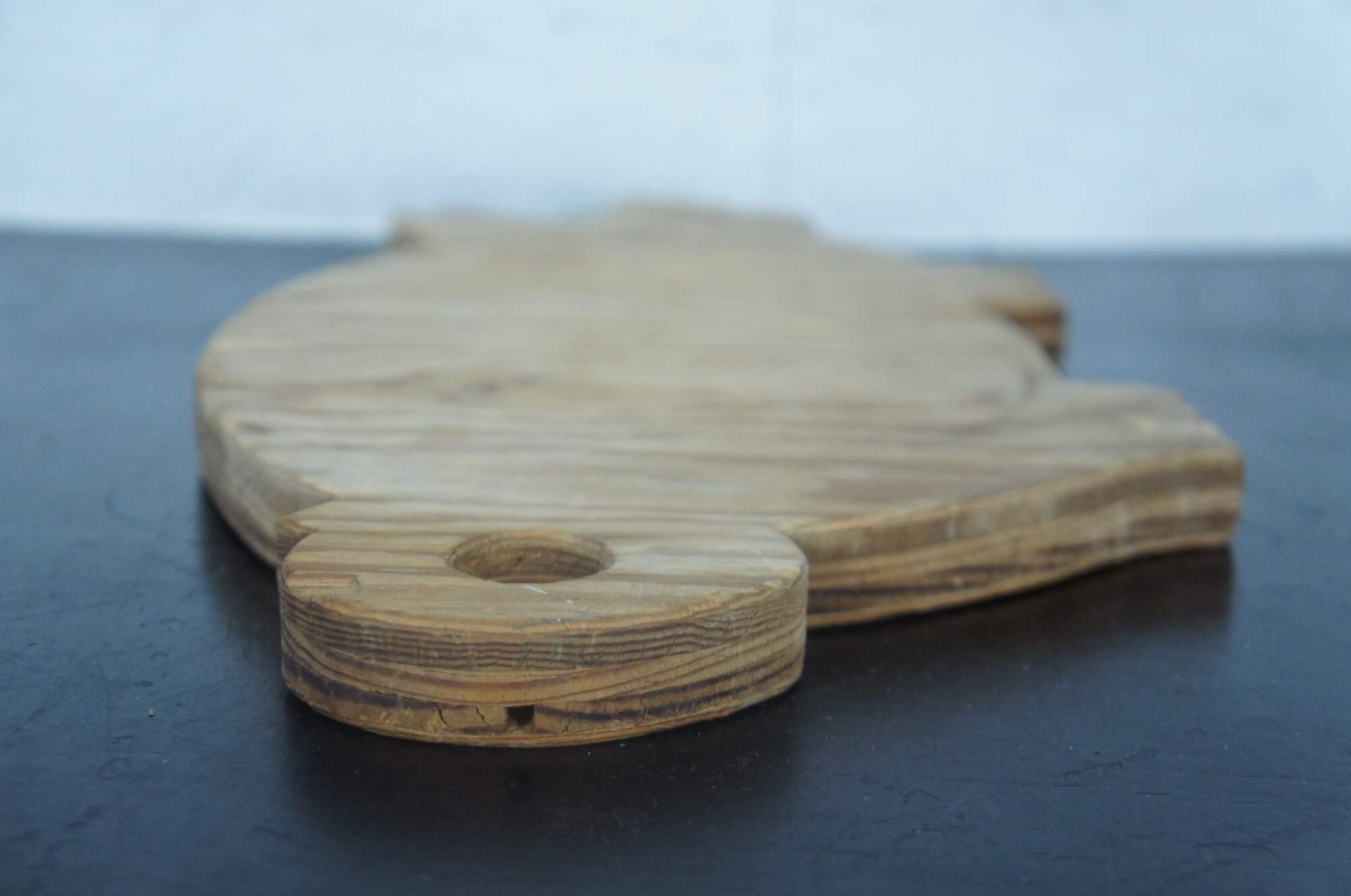 Vintage hand made pig shaped plywood cutting board with tail curled into a ring for hanging.
