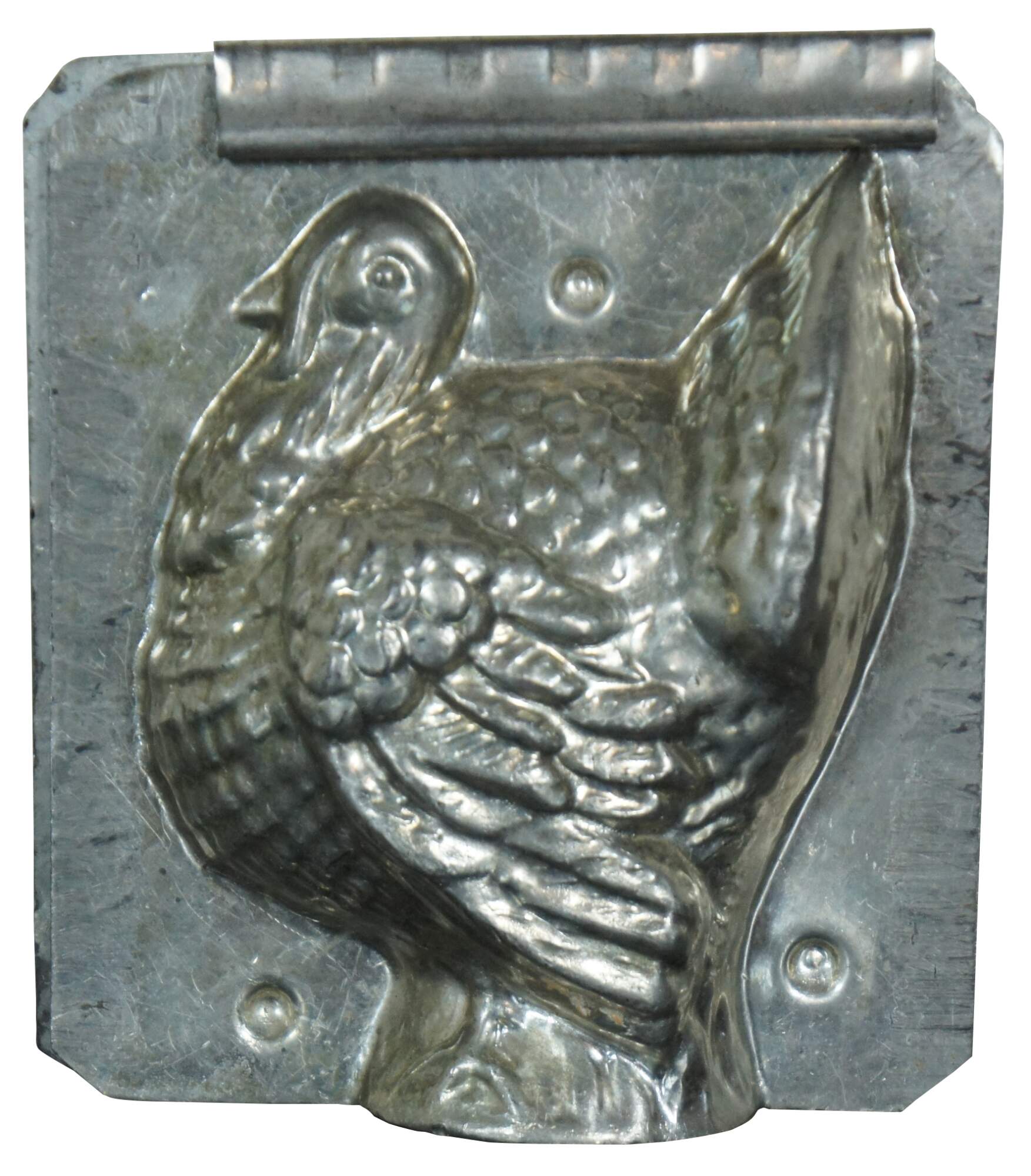 Antique circa 1930’s Eppelsheimer two part tin baking or chocolate mold in the shape of a standing Thanksgiving turkey; includes one original clip.
