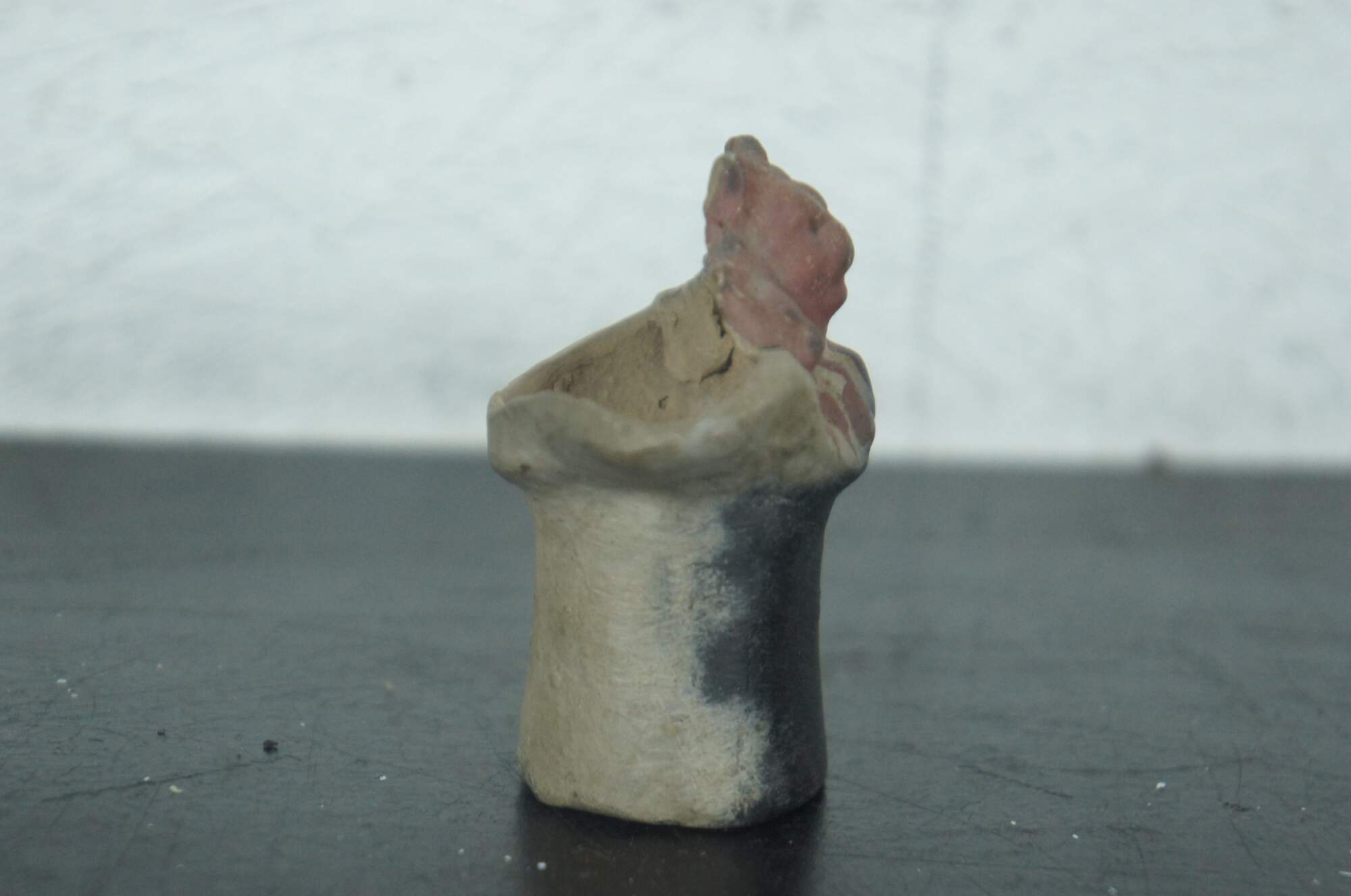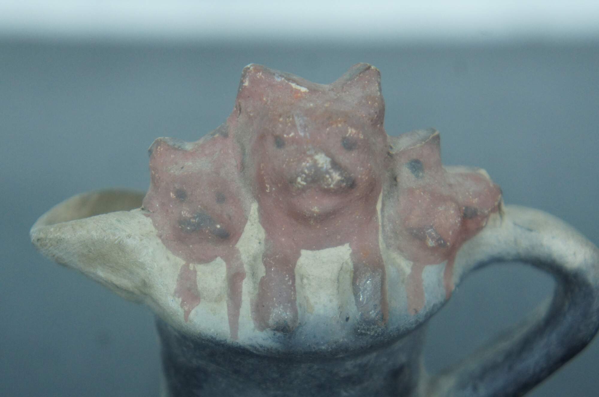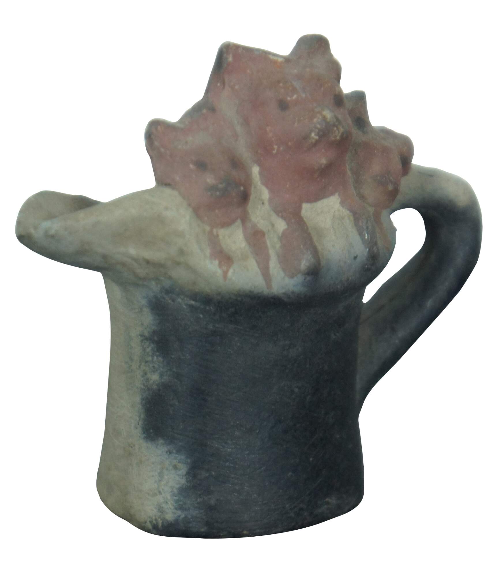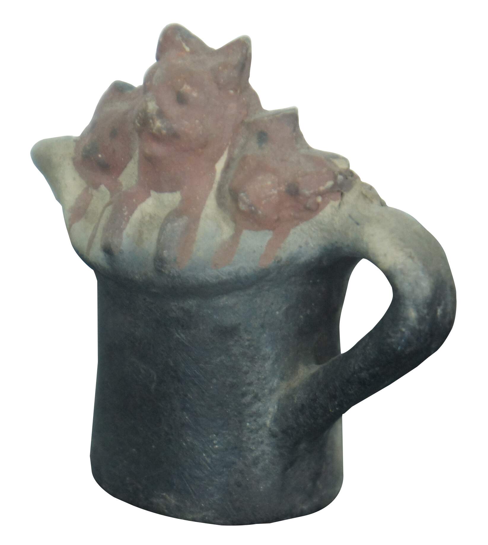Antique miniature earthenware pottery cream pitcher or toby jug partially painted black with the heads and paws of three russet kittens peeking over the rim.