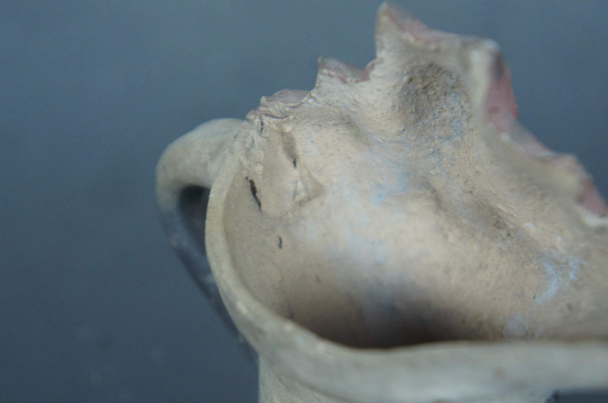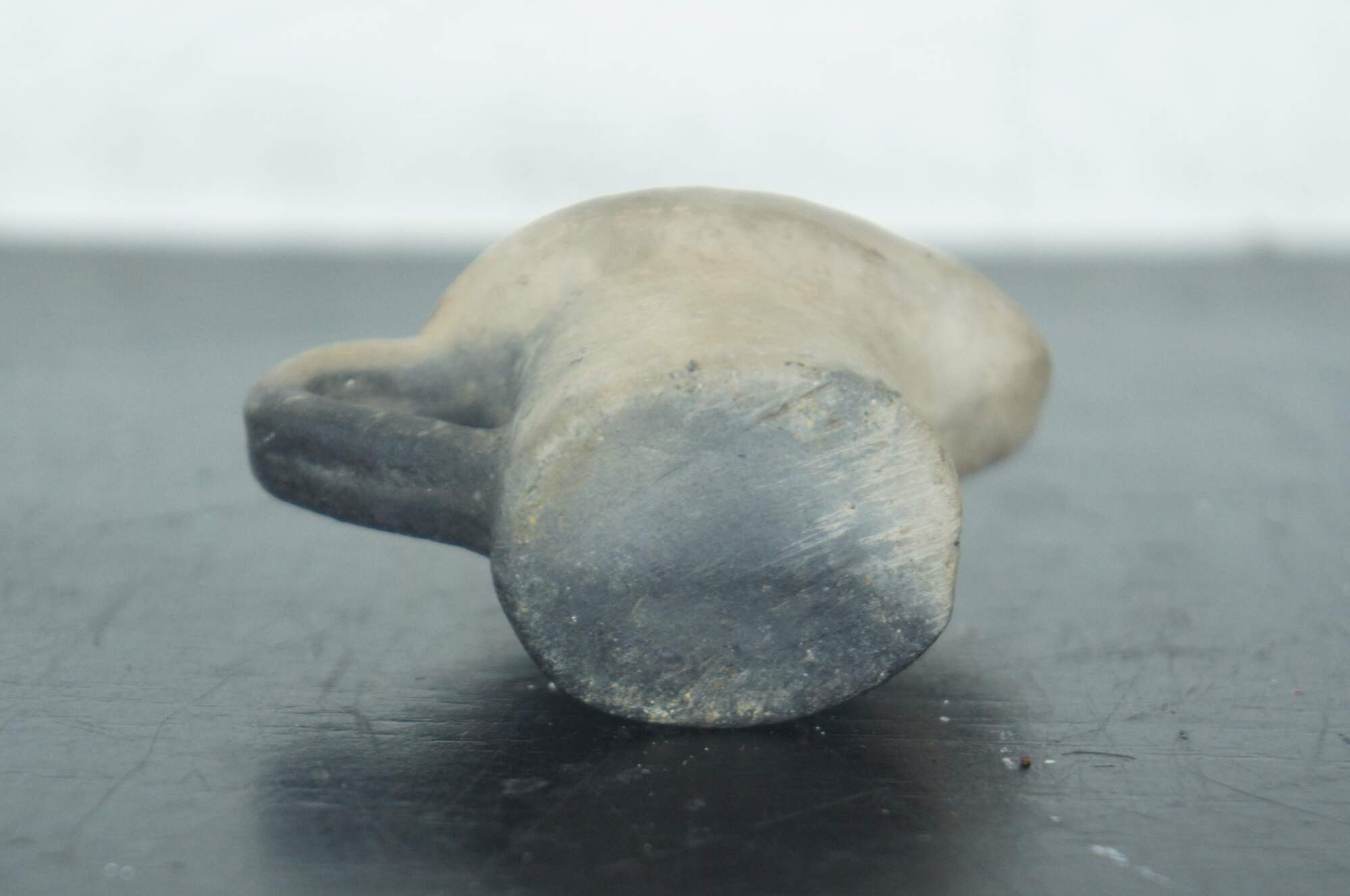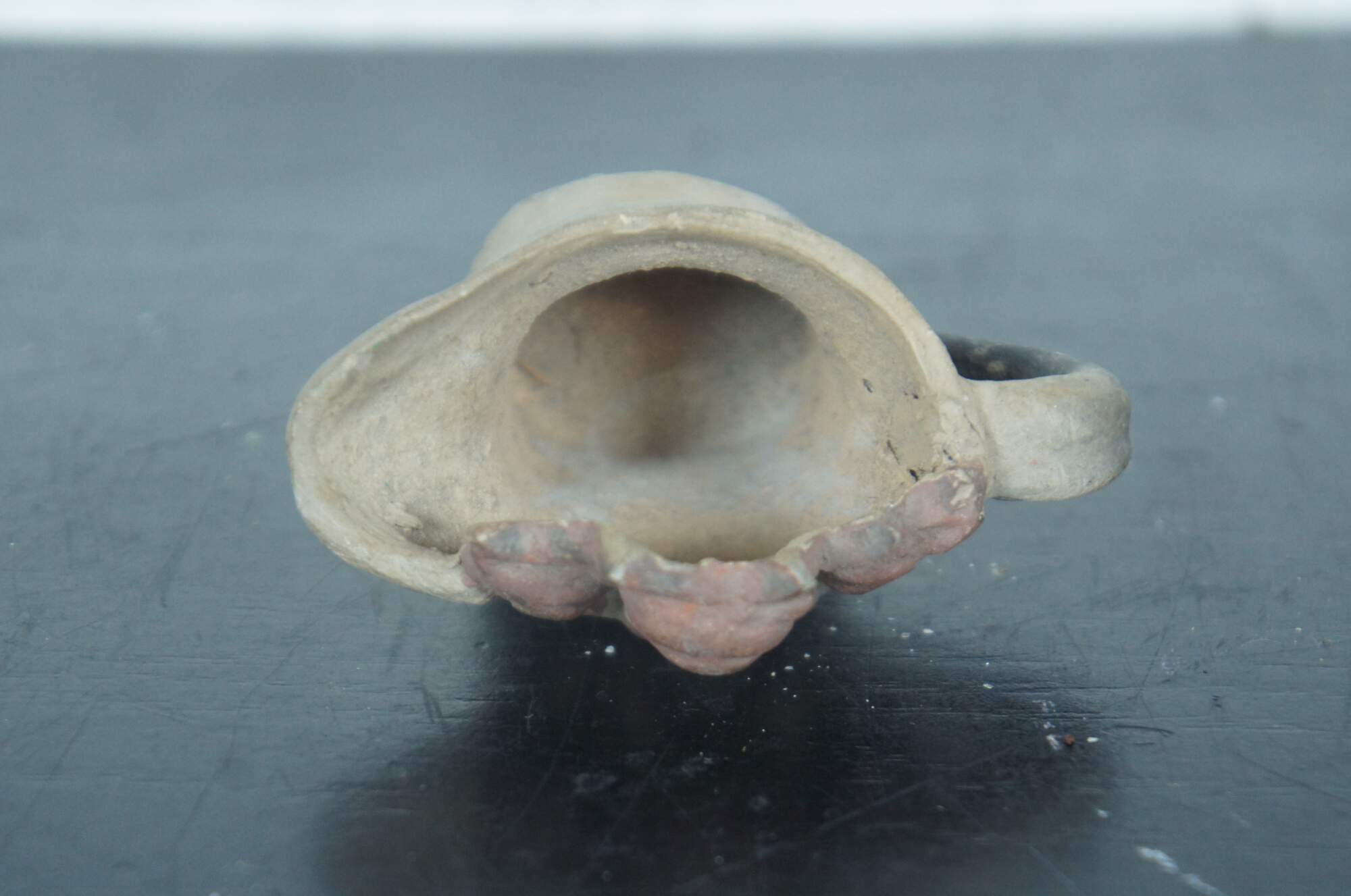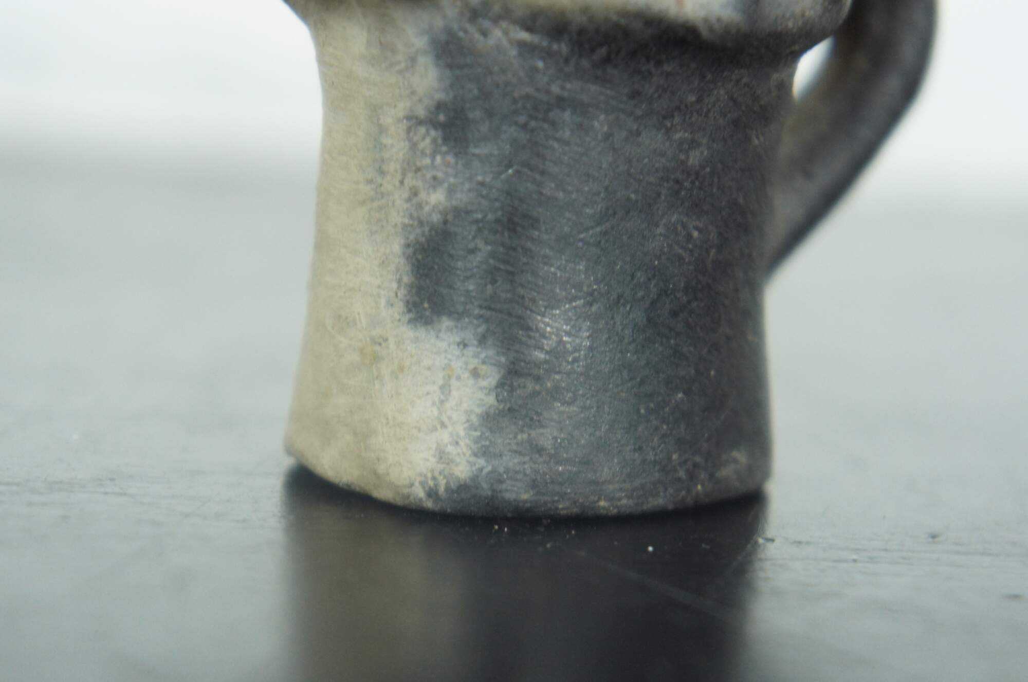 Antique miniature earthenware pottery cream pitcher or toby jug partially painted black with the heads and paws of three russet kittens peeking over the rim.