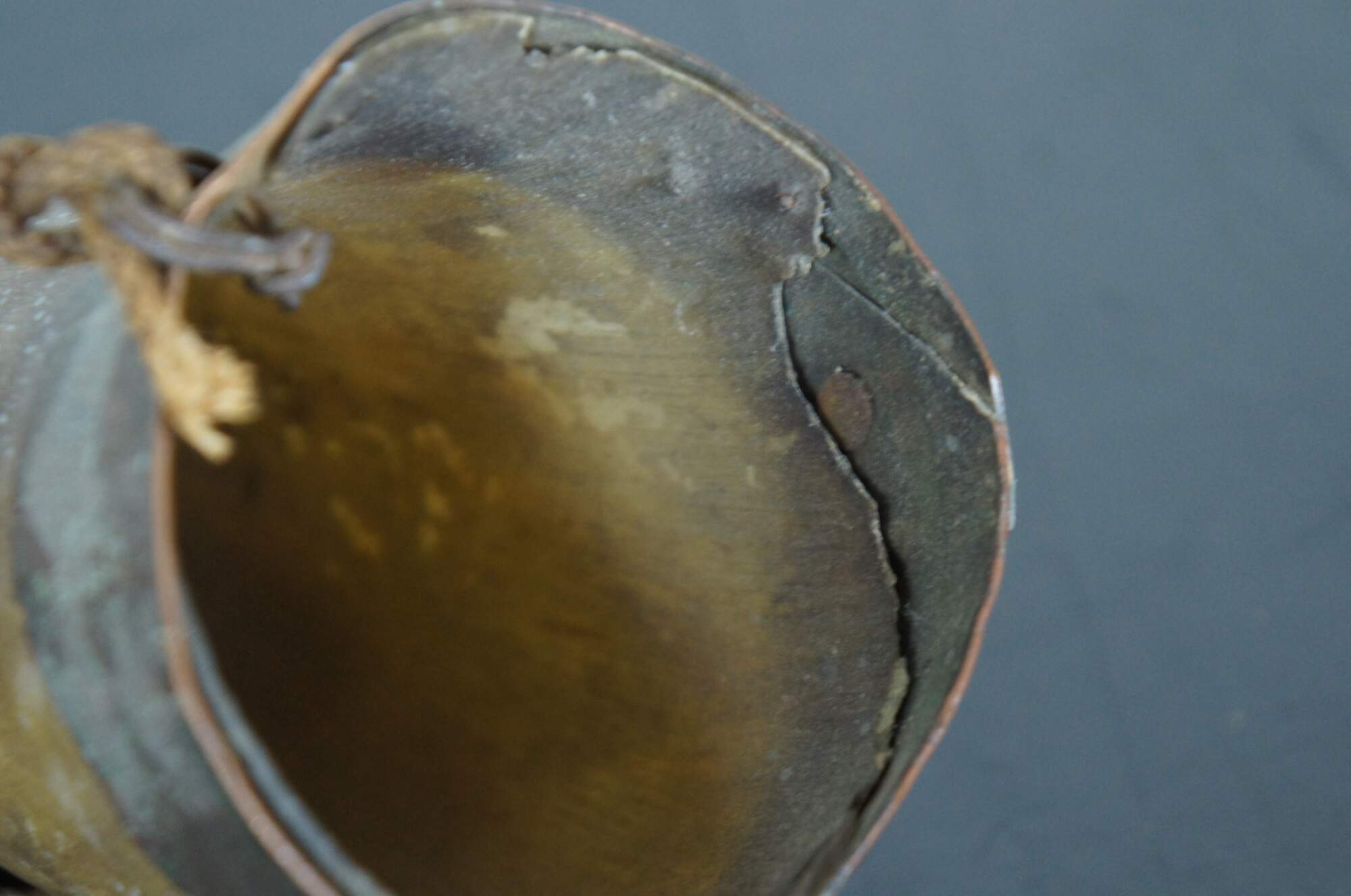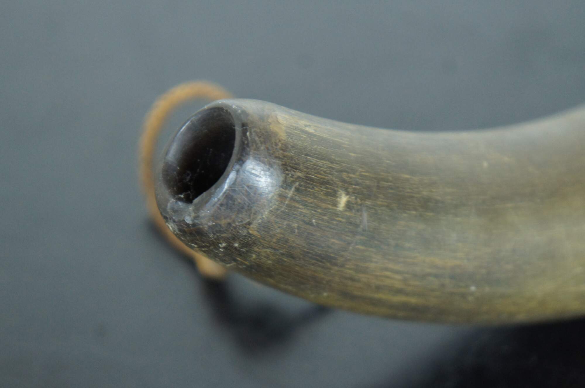 Antique natural horn used for the carrying of black powder. Features a natural curved, slightly spiral shape with a metal band around the larger opening. No stoppers or other hardware.