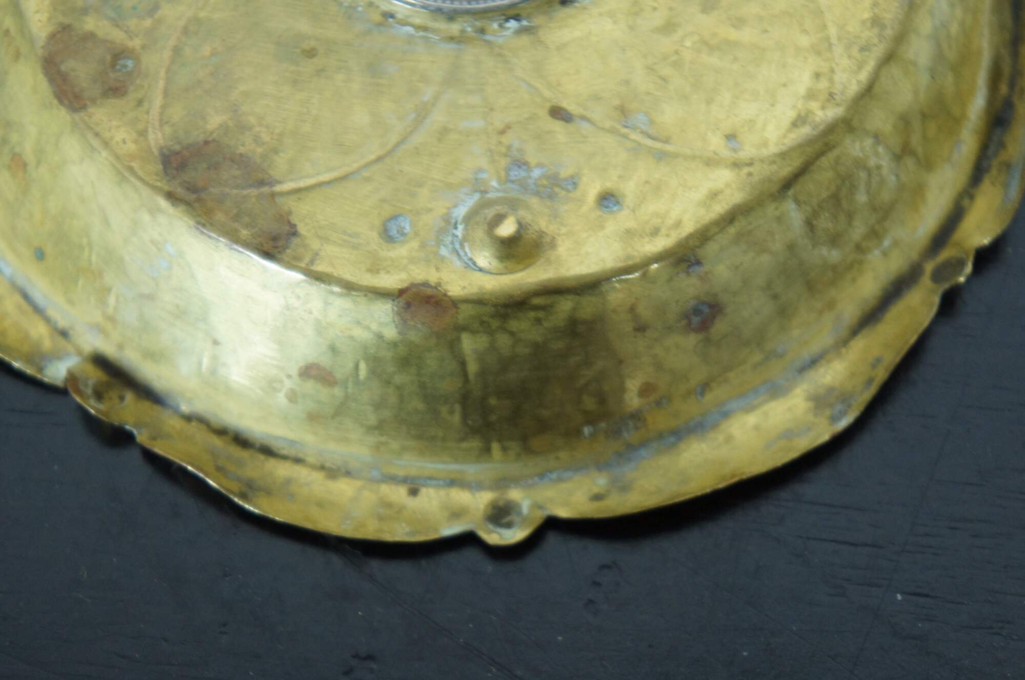 Early 20th century etched brass trinket dish featuring a four petaled flower surrounding an inset 2 kronor Swedish silver coin (exact year worn away); the letters F.C(or G). A. are etched along one side.