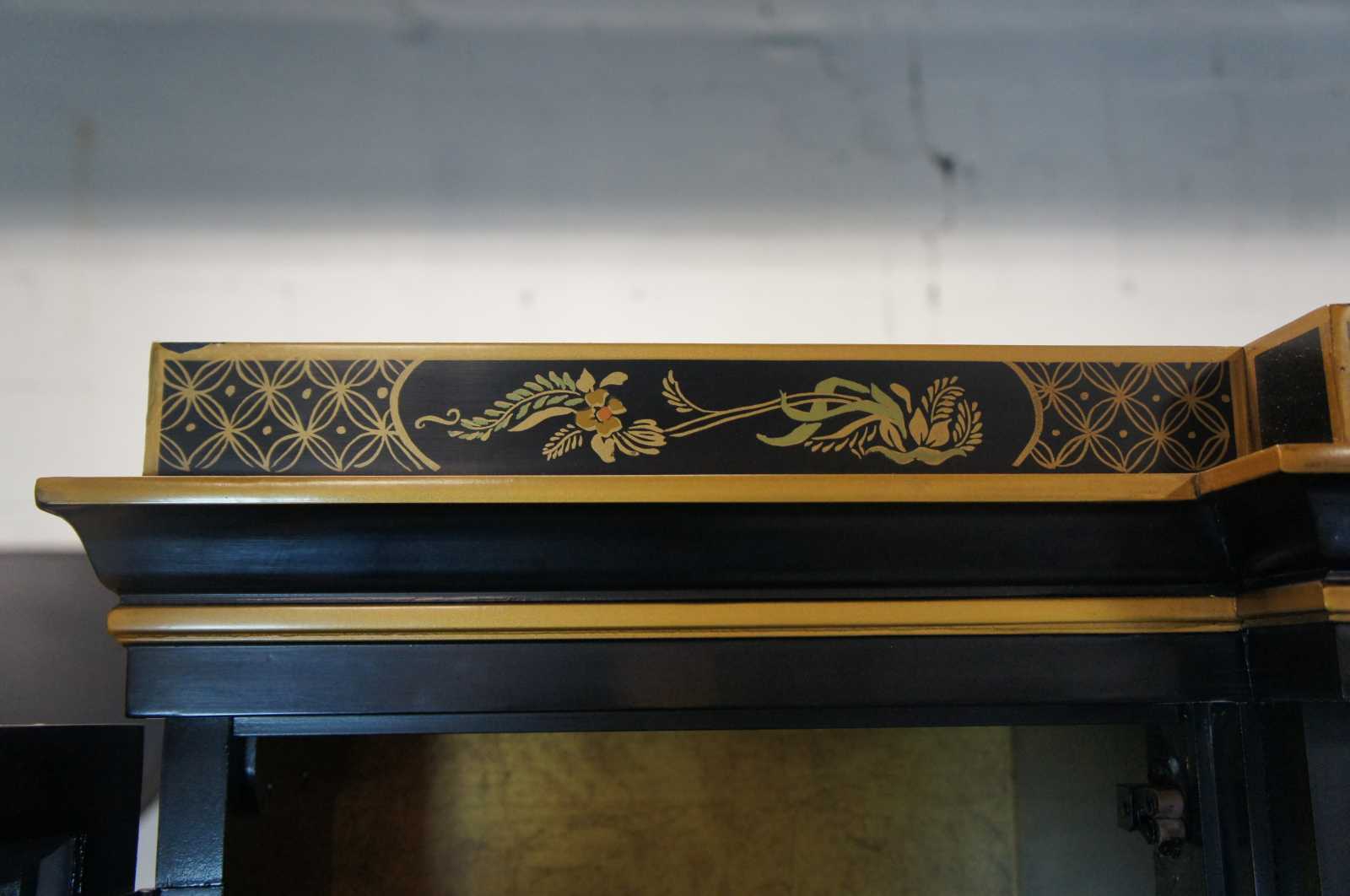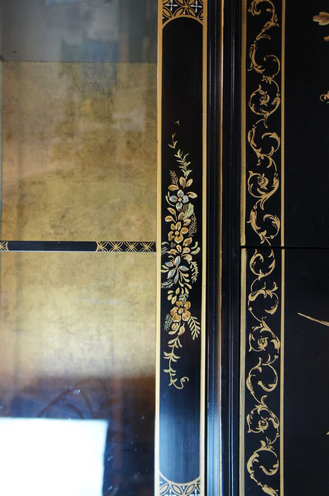 Drexel Heritage Et Cetera display cabinet 582-536, circa 1978. Features Chinoiserie japanned (black lacquer) hand painted motif with gold detail showing a landscape of florals / flowers, animals / birds, and butterfly. The cabinet is lit from above and includes an elegant gold leaf backing.