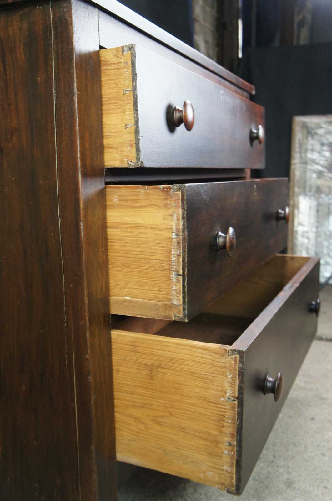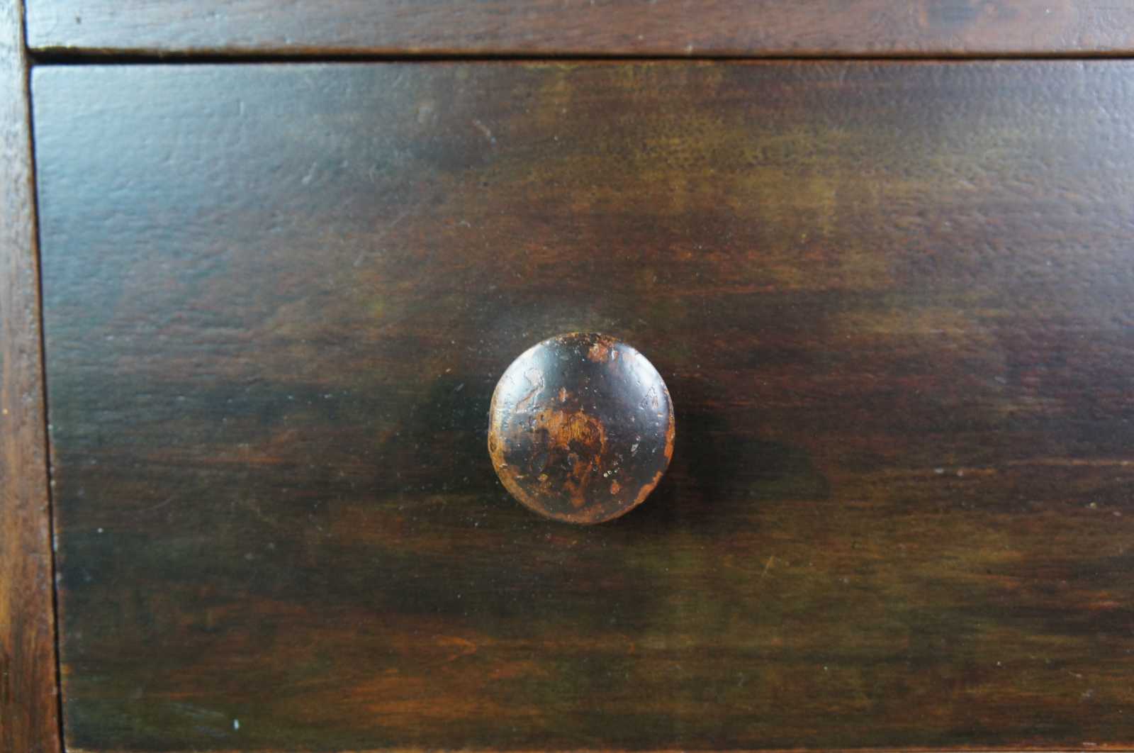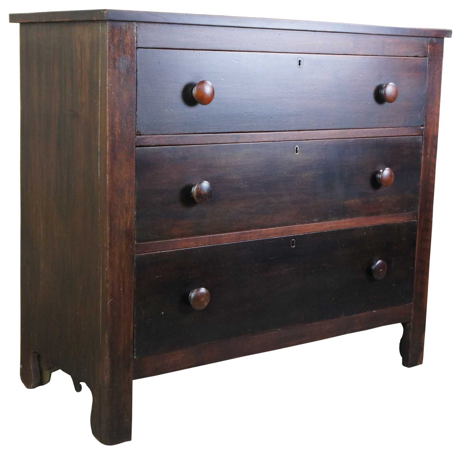 Antique 19th century chest of drawers or dresser. Made of walnut featuring three large hand dovetailed drawers with turned knobs and brass keyholes.