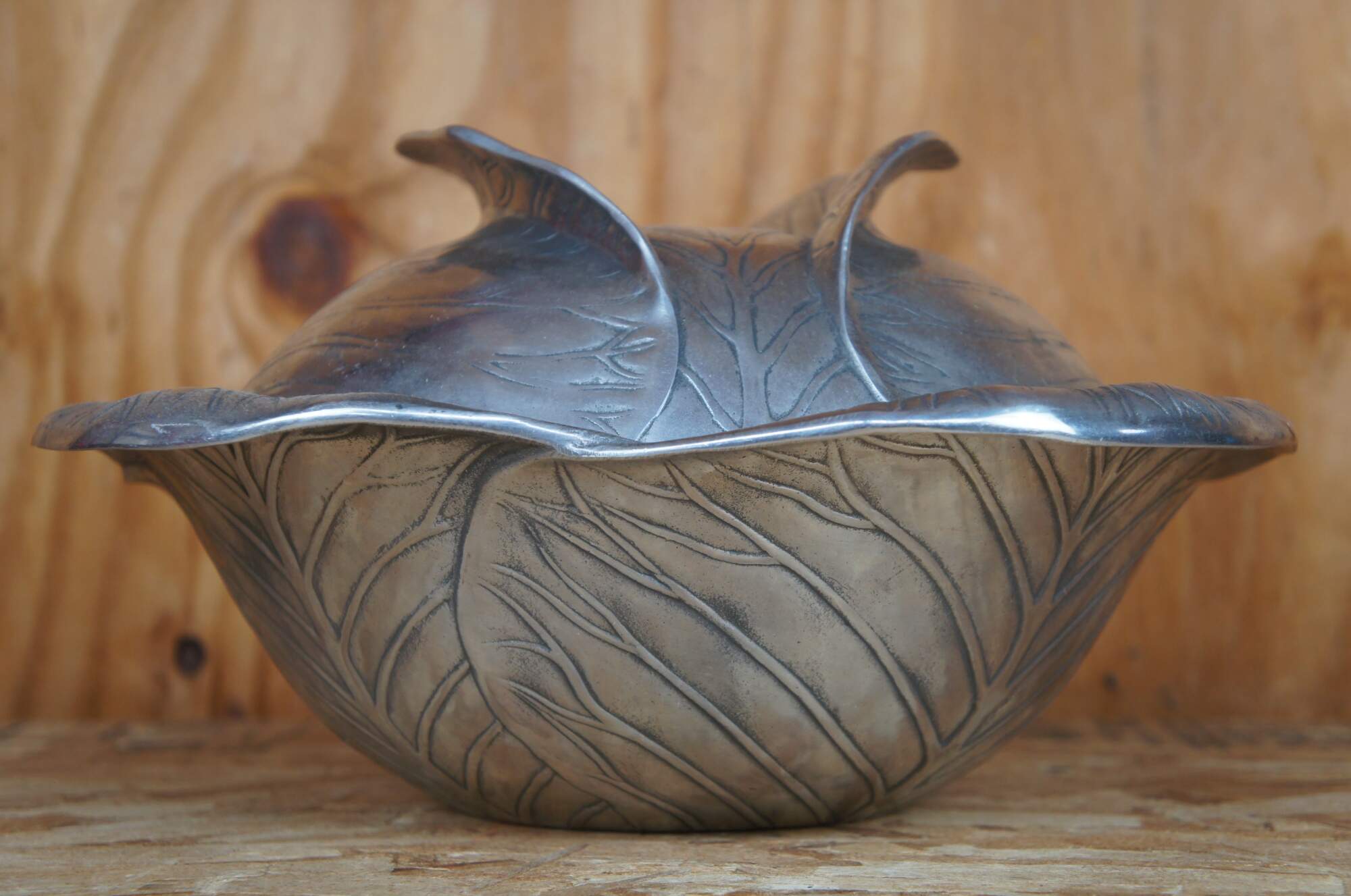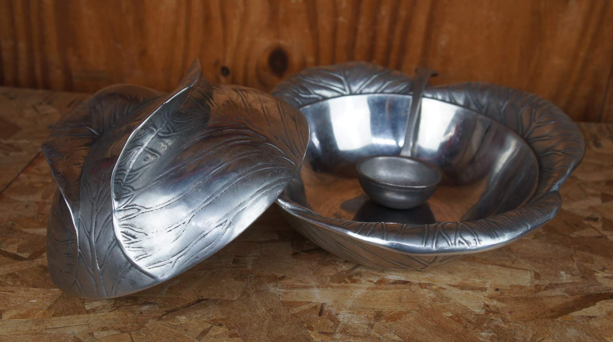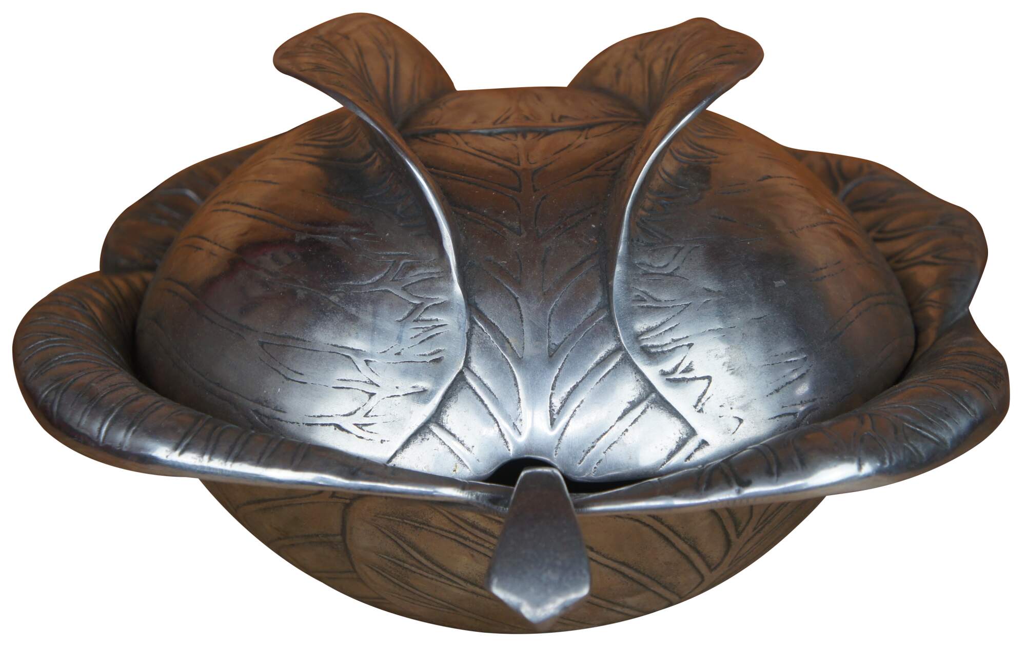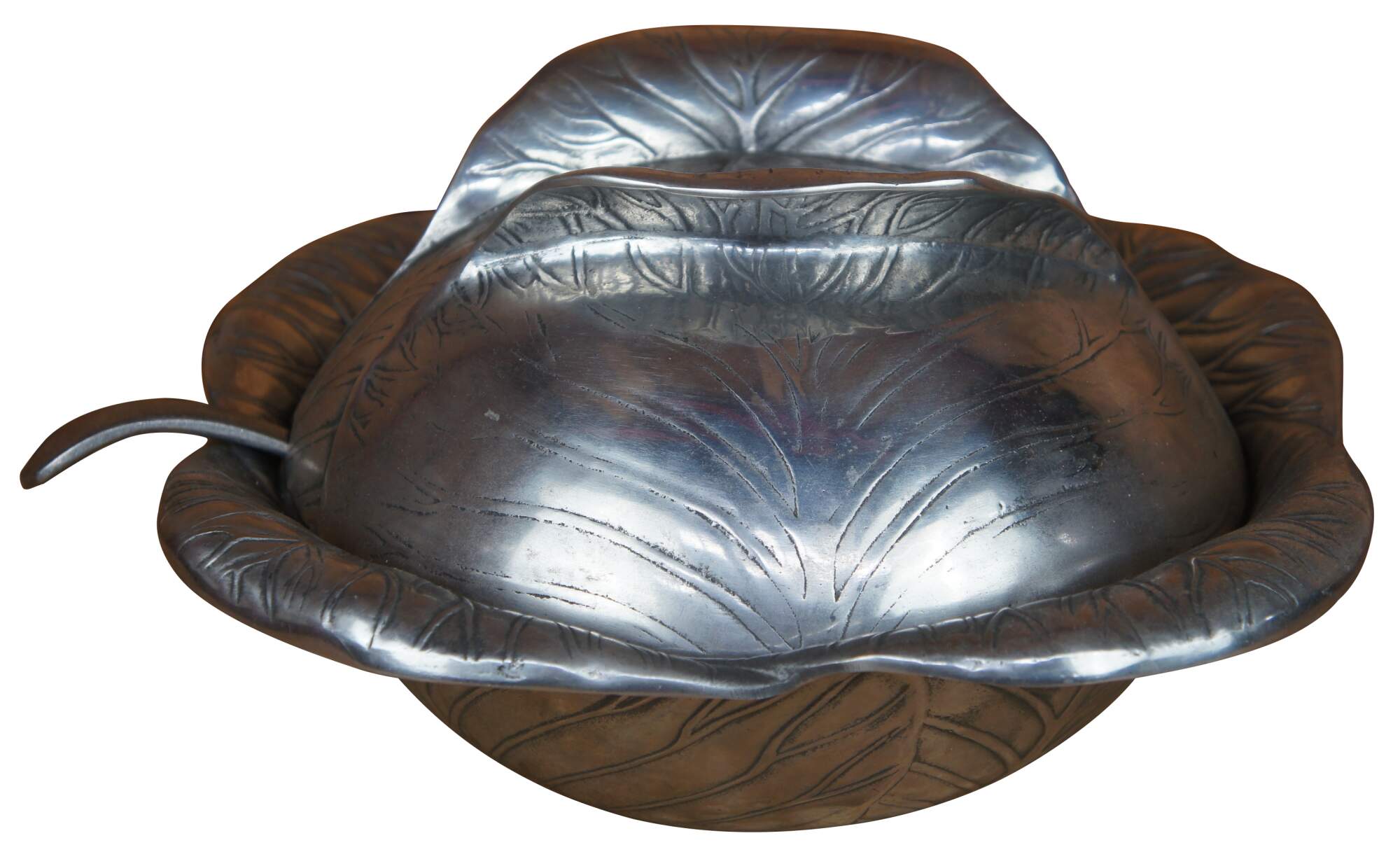 1970s Vintage soup tureen by Arthur Court designs features an aluminum finish in the shape of a head of cabbage with notched lid and ladle.