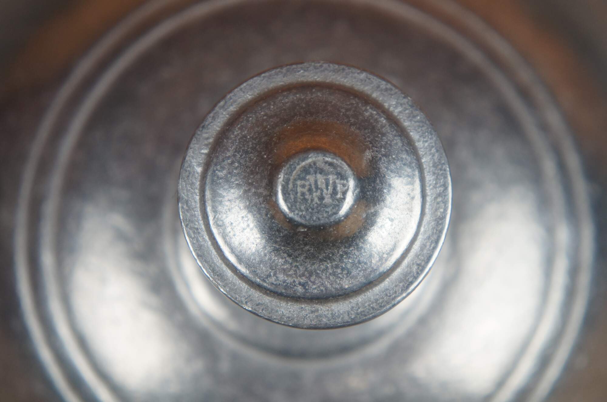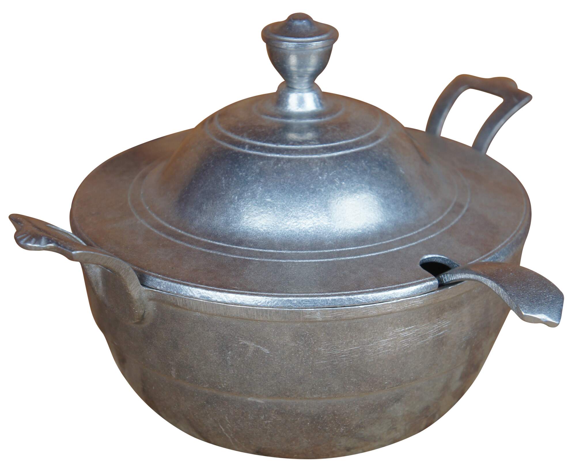 Pewter or aluminum dish with ladle and notched lid by Wilton Armetale in their plough pattern.
