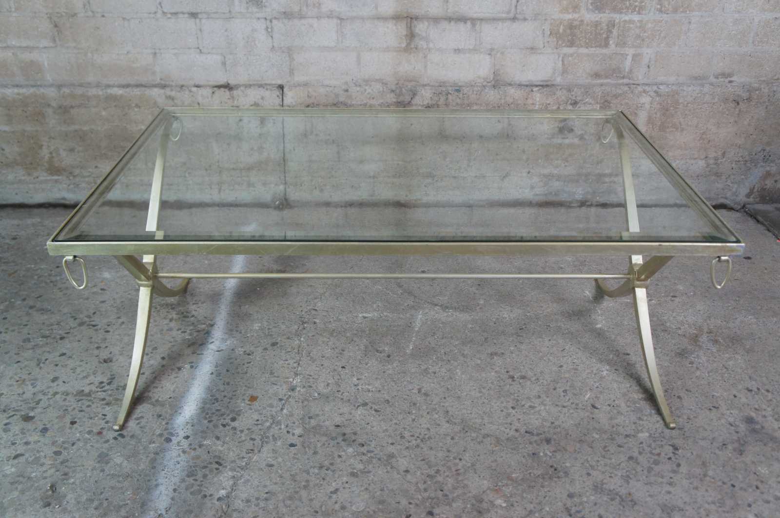 Barbara Barry for Baker Furniture iron and glass coffee table featuring rectangular form supported by an iron frame with hanging rings at each corner of the apron, x-form legs, and a round stretcher support. Champagne color finish.