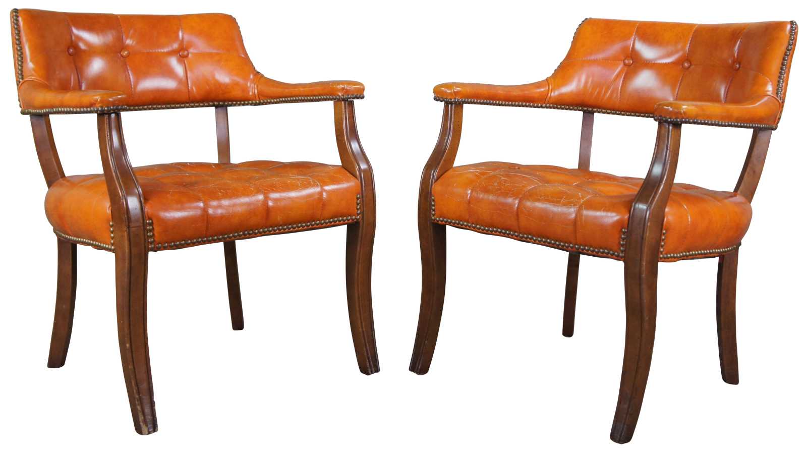 Pair of mid century orange vinyl tufted barrek back chairs. Features a a naturally distressed frame and brass nailhead trim.