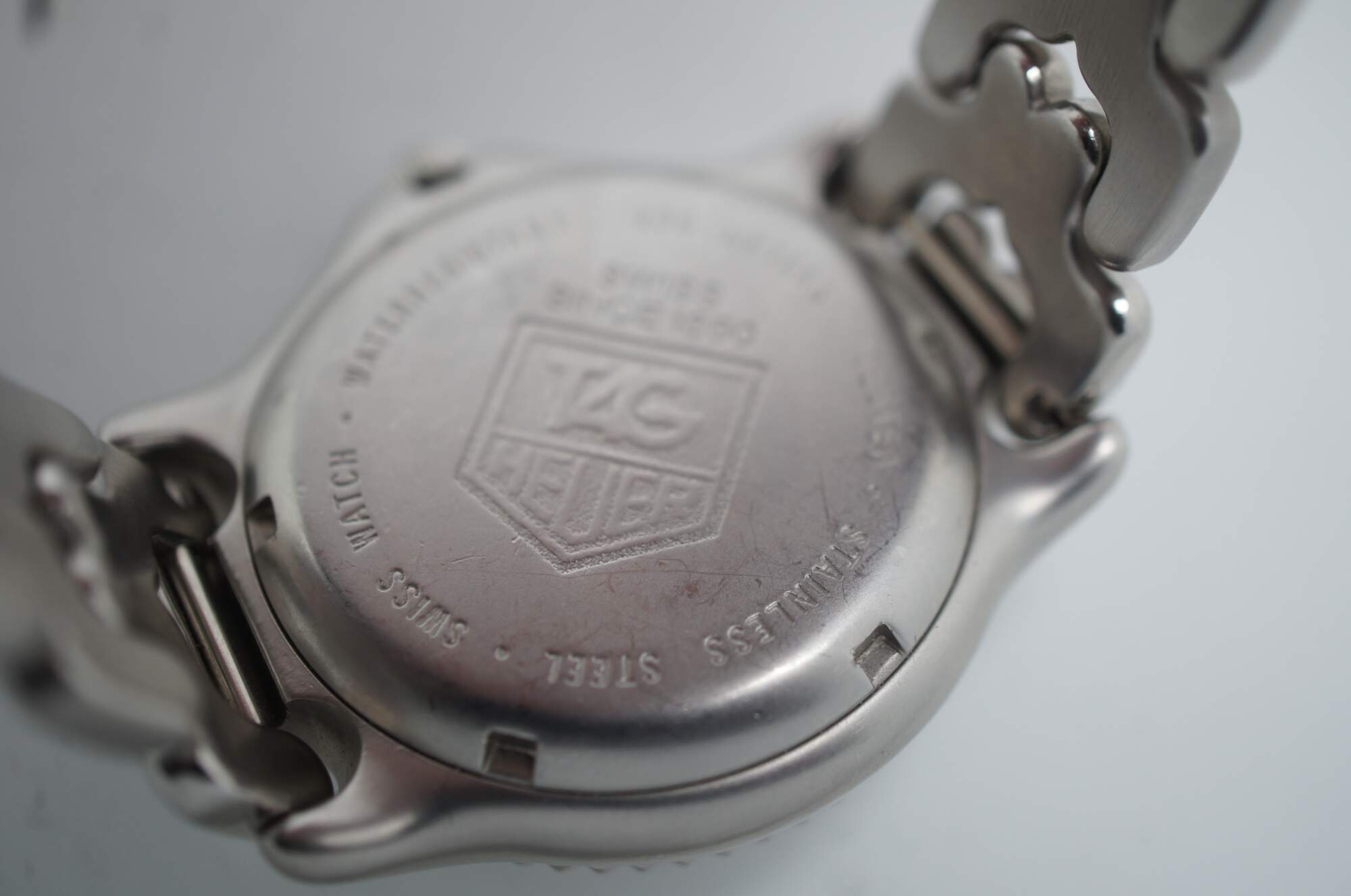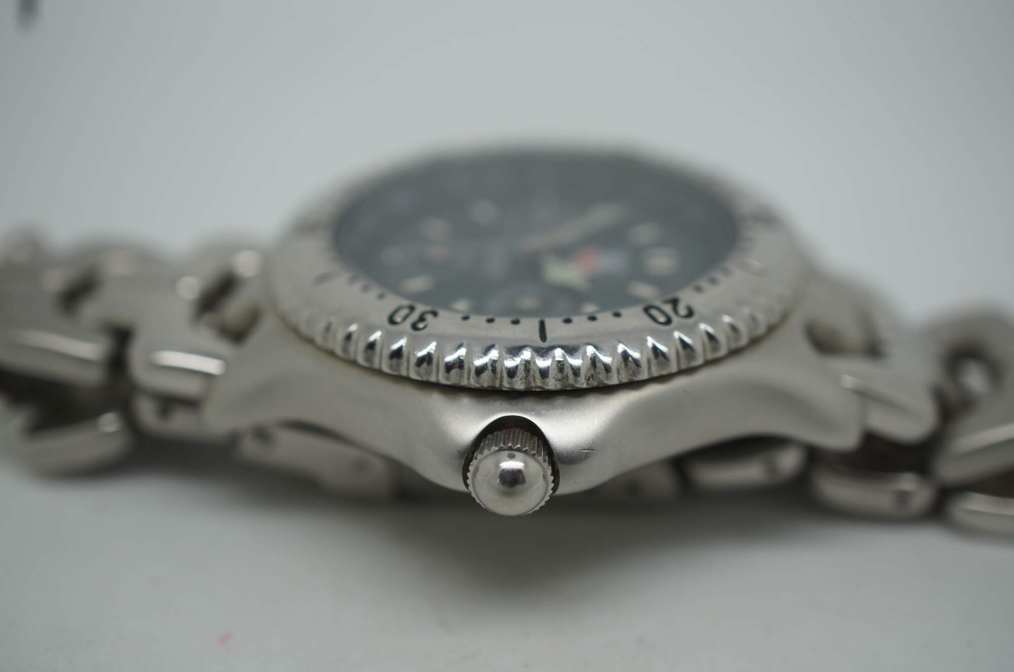 Tag Heuer chronograph wristwatch with tachymetre, stainless steel case and band, water resistant to 200 meters.
