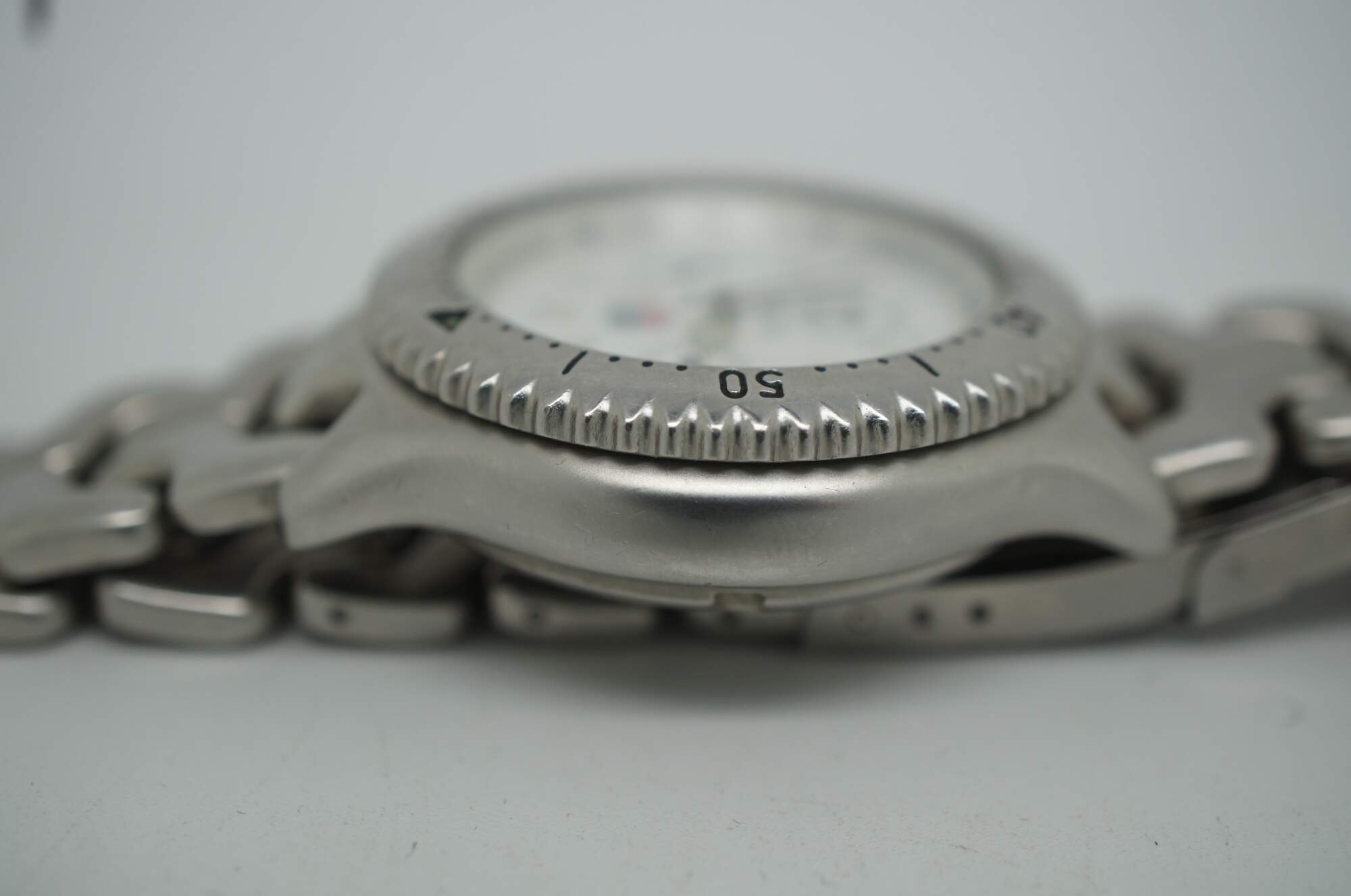 Tag Heuer Professional watch with stainless steel case and band, perpetual calendar on the face, and tachymetre, water resistant 200 meters.