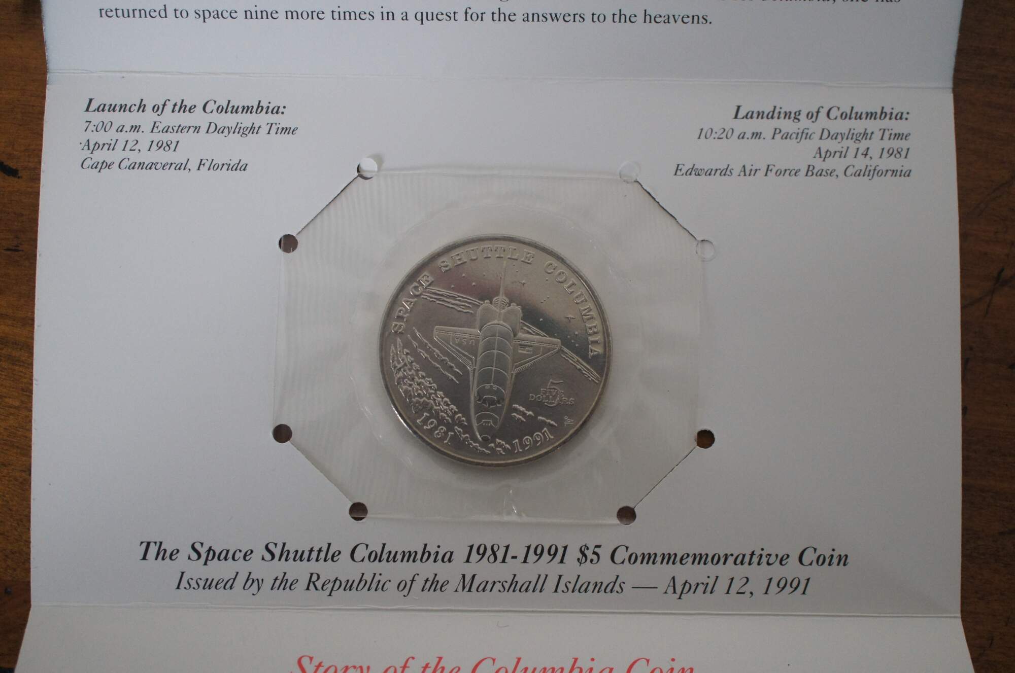2 Available – Space Shuttle Columbia 1981-1991 $5 Commemorative Coin and original envelope, issues by the Republic of the Marshall Islands – April 12, 1991.