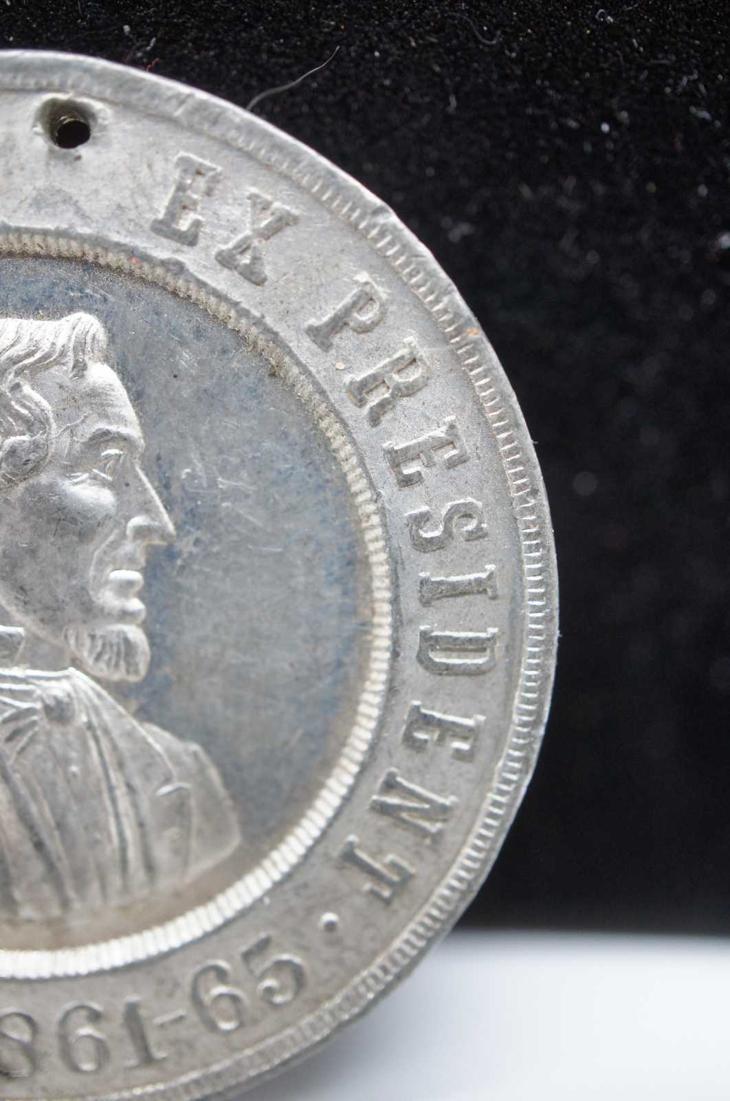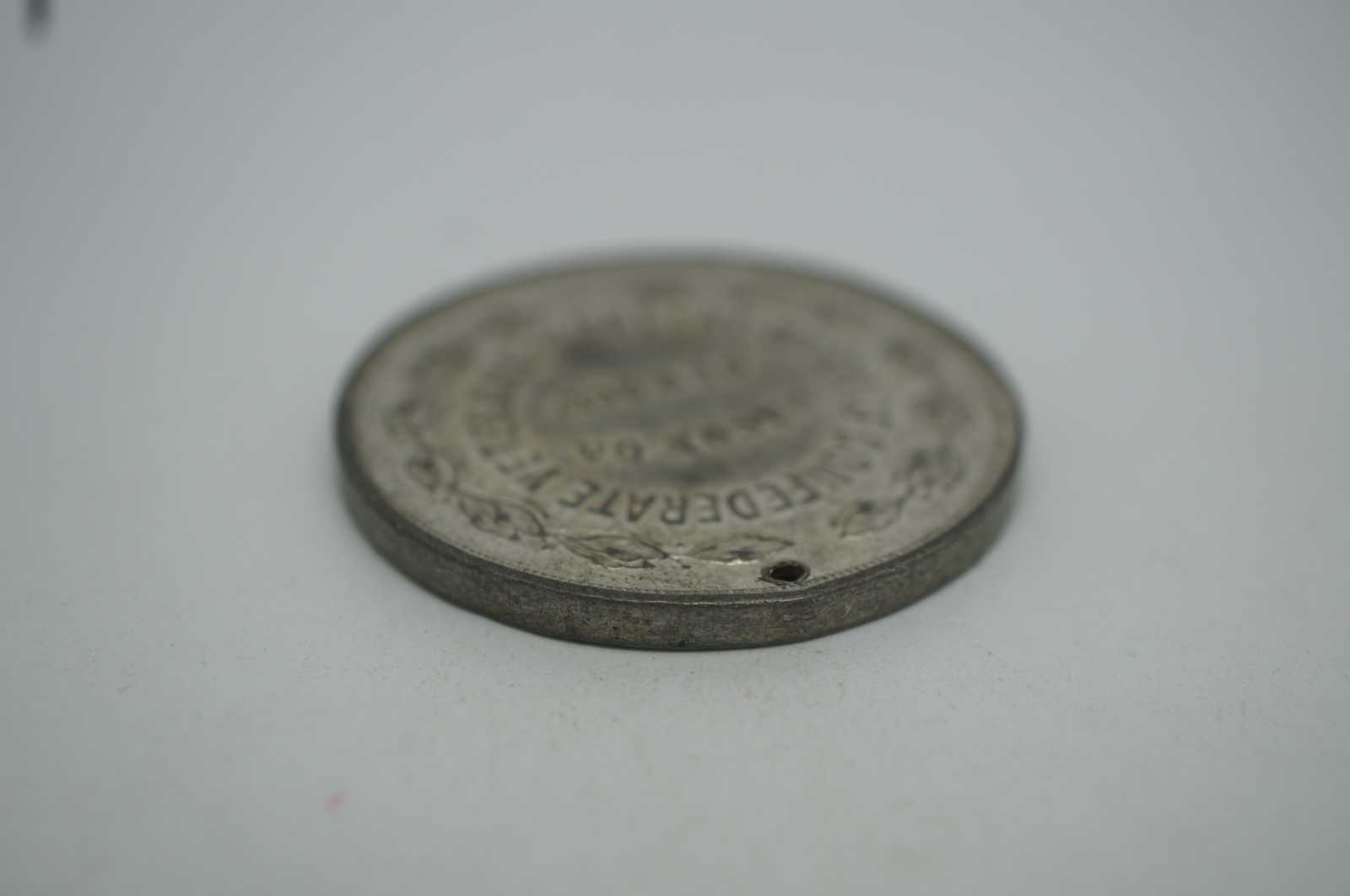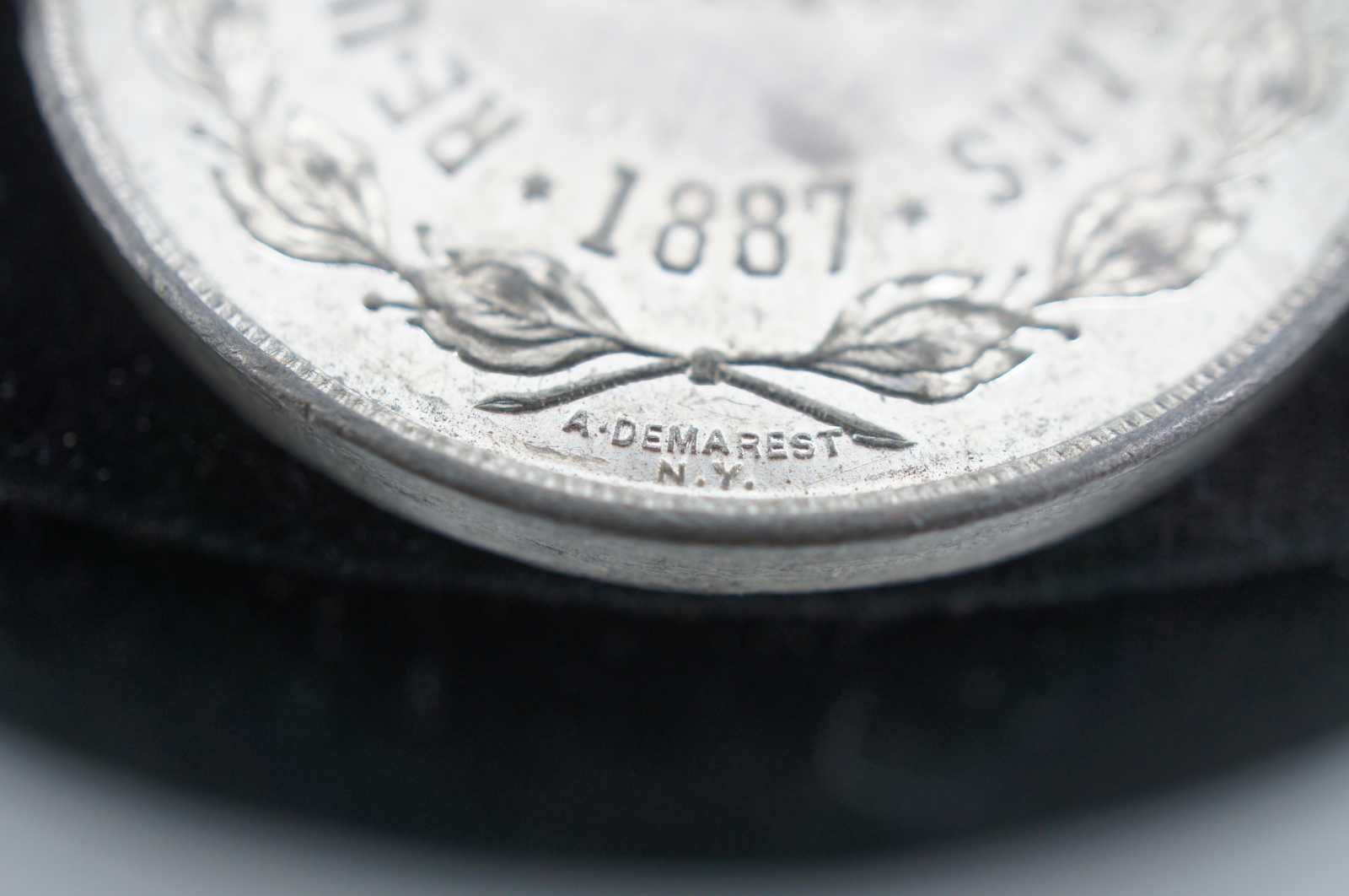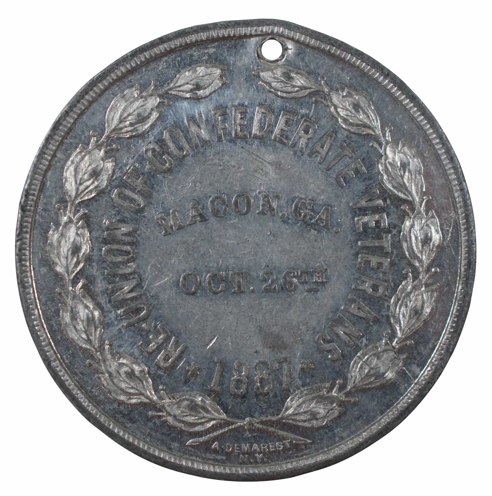 Antique Confederate veterans re-union token. Obverse – portrait of Jefferson Davis, facing right; the words “Jefferson Davis Ex President CSA 1861-65” around the outside edge; hole centered at the top for use as a pendant on a necklace. Reverse: Leafy wreath around the outside edge; the words “Macon, GA. Oct 26th” in the center, “Re-Union of Confederate Veterans 1887” encircling the center; “A. Demarest N.Y.” makers mark centered at the bottom edge.