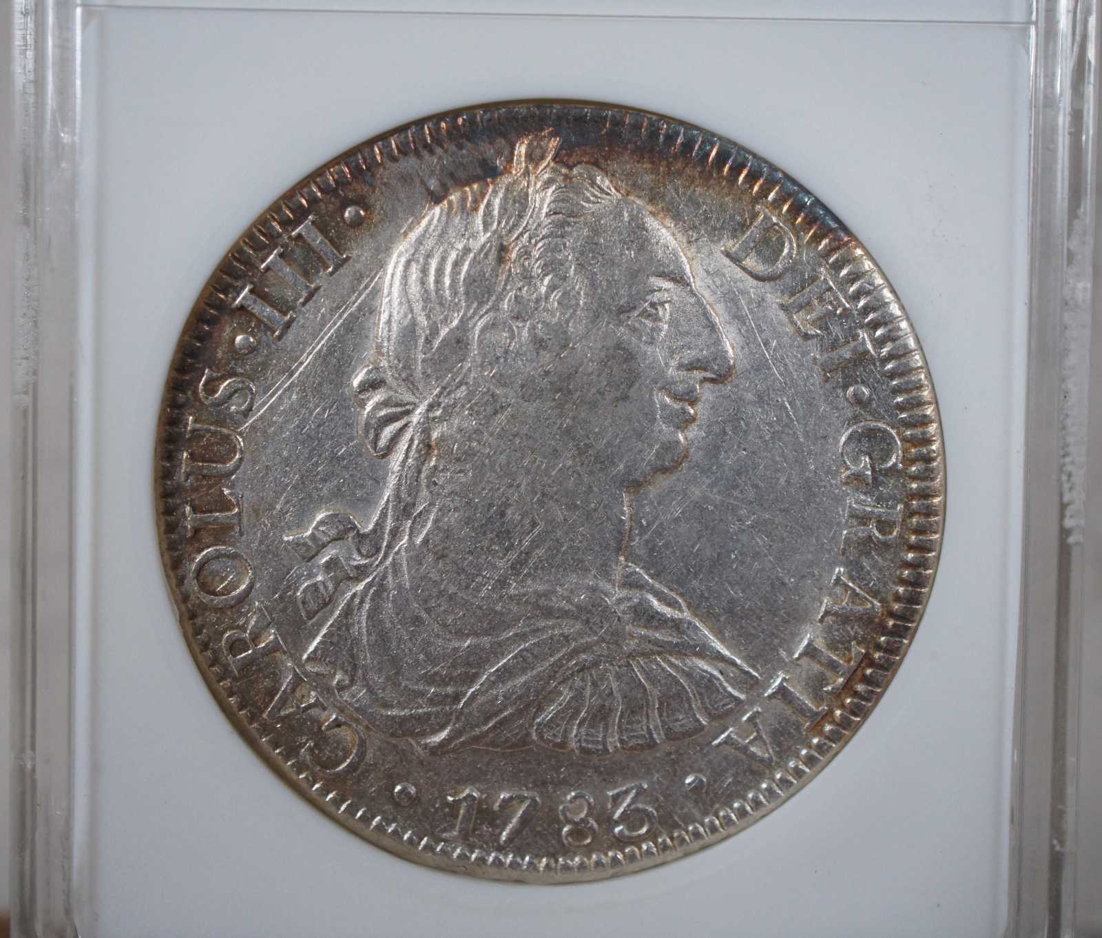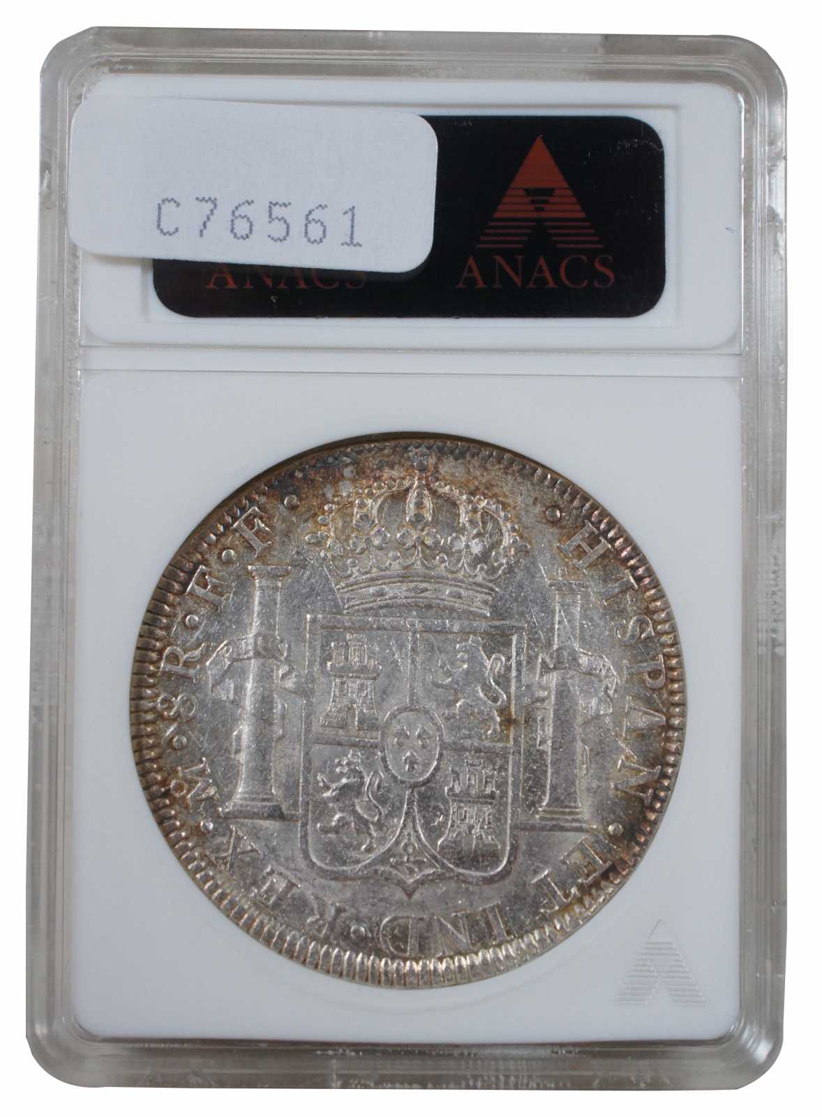 Antique 1783 Mexican 8 reales coin. Obverse: the head of King Carolus III of Spain, facing right, dressed like an ancient Roman emperor; the words “Carolus III” along the left edge, “Dei Gratia” along the right edge, and the year centered along the bottom edge. Reverse: crowned coat of arms flanked by two ribbon wrapped pillars; the words “Hispan Et Ind Rex Mo (Mexico City’s mint mark) 8R FF (assayer’s initials)” along the bottom three quarters of the edge and separated by dots. Graded by The American Numismatic Association Certification Service. Coin grade AU 53 – About Uncirculated. The coin has very light wear or maybe only a trace of friction on the highest points. It has nearly full mint luster.