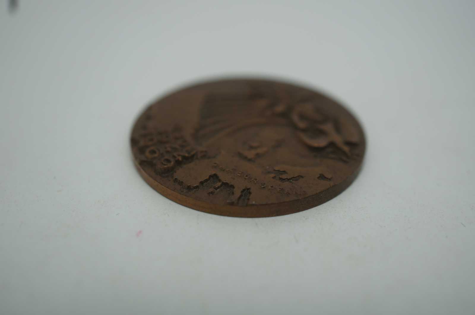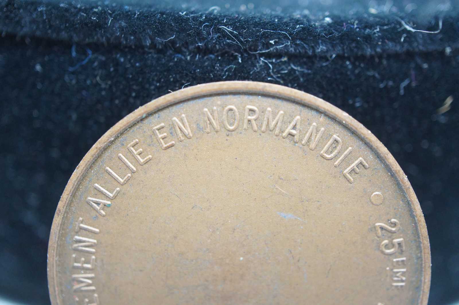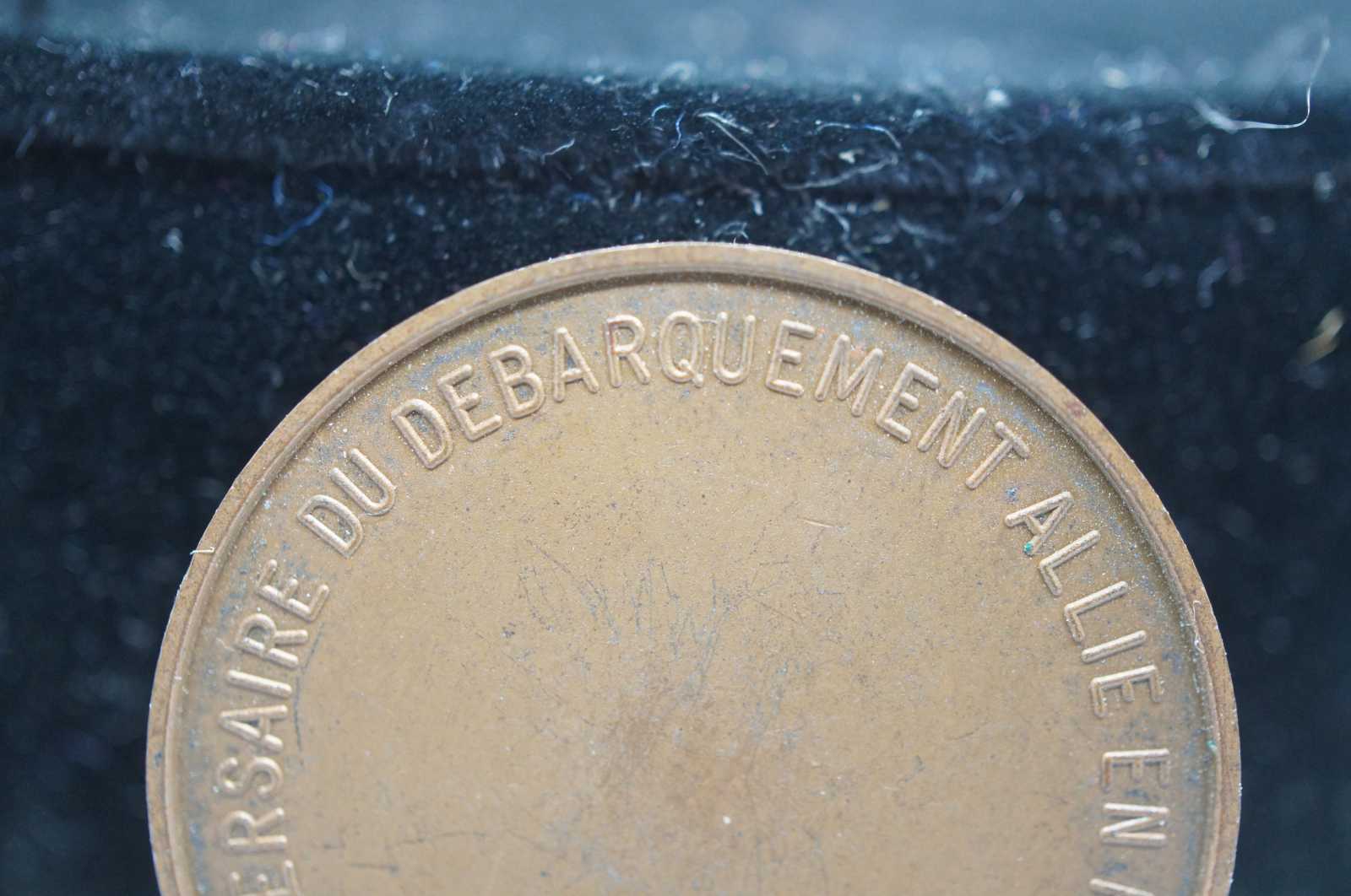 Vintage French bronze medal or coin commemorating the 25th anniversary of the World War II Invasion of Normandy. Obverse: Star spangled shape of the United States next to a map of Europe with the words “Pax Europeana” across it; “^ Juin 1944 1969” centered at the bottom; above, a flying dive holding an olive branch, trailing stripes, and a bald eagle with wings outstretched, holding arrows and olive branch in its talons, stars and stripes shield on its chest, ribbon behind, circular wreath above head; artist’s signature to left of US. Reverse: the words “25eme Anniversaire du Debarquement Allie en Normandie” around the edge .