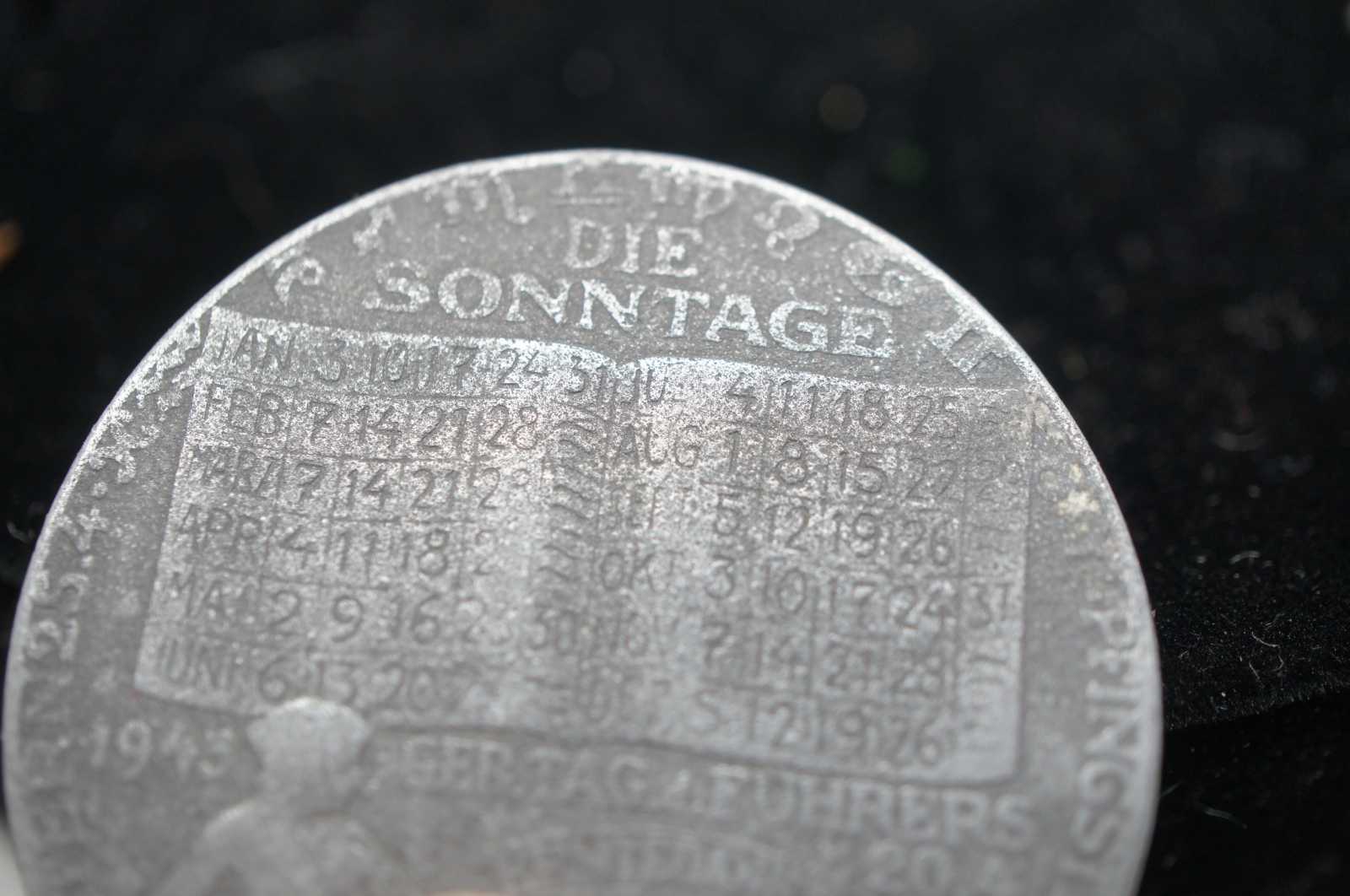 Antique 1943 The Sundays calendar coin by Degussa metalworks of Germany. Obverse: the words “Die Sonntage” across the top center; an open book printed with the months and days above a reclining nude figure; 1943 to the left of the figure; “Gertag Fuhrers 20.4” and something on a banner to the right of the figure; astroligical symbols bordering the top edge; words bordering bottom edge. Reverse: “Deutsche Gold- und Silber-Scheideanstalt vormals Roessler” (German Gold and Silver Refinery formerly Roessler) around the outside edge; a sun and moon logo in a diamond centered above the word “Degussa” above a city skyline. “The history of former Degussa began in the half of the 19 century, when the head of the Frankfurt Mint, Friedrich Ernst Roessler, established a gold and silver separation factory at the city’s request in 1843. Furthermore, Roessler initiated the construction of a chemical-technical laboratory close to the Mint, on the premises of today’s Evonik site. This laboratory processed the byproducts of sulfuric acid separation, namely silver nitrate and cyanide salts. When Frankfurt lost its political independence in 1866 as a consequence of the Prussian-Austrian War, Friedrich Ernst Roessler became a Prussian civil servant and withdrew from the separation business. His eldest sons, Hector and Heinrich, both chemists, took over operations. They transferred the separation factory to the chemical-technical laboratory and continued both activities as the company Friedrich Roessler Söhne. When the German Empire was formally established in 1871, a standard currency was introduced: mark and pfennig. They replaced all other currencies used in the former German states. Because of the large volume of coins that then had to be refined, the government demanded security guarantees from the Roessler brothers, which could be met only by incorporating the precious metal refinery.