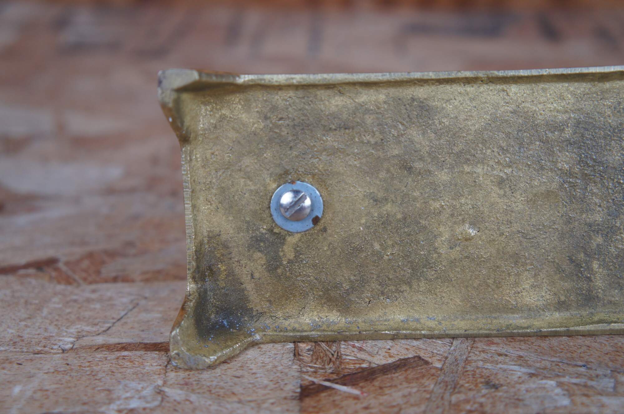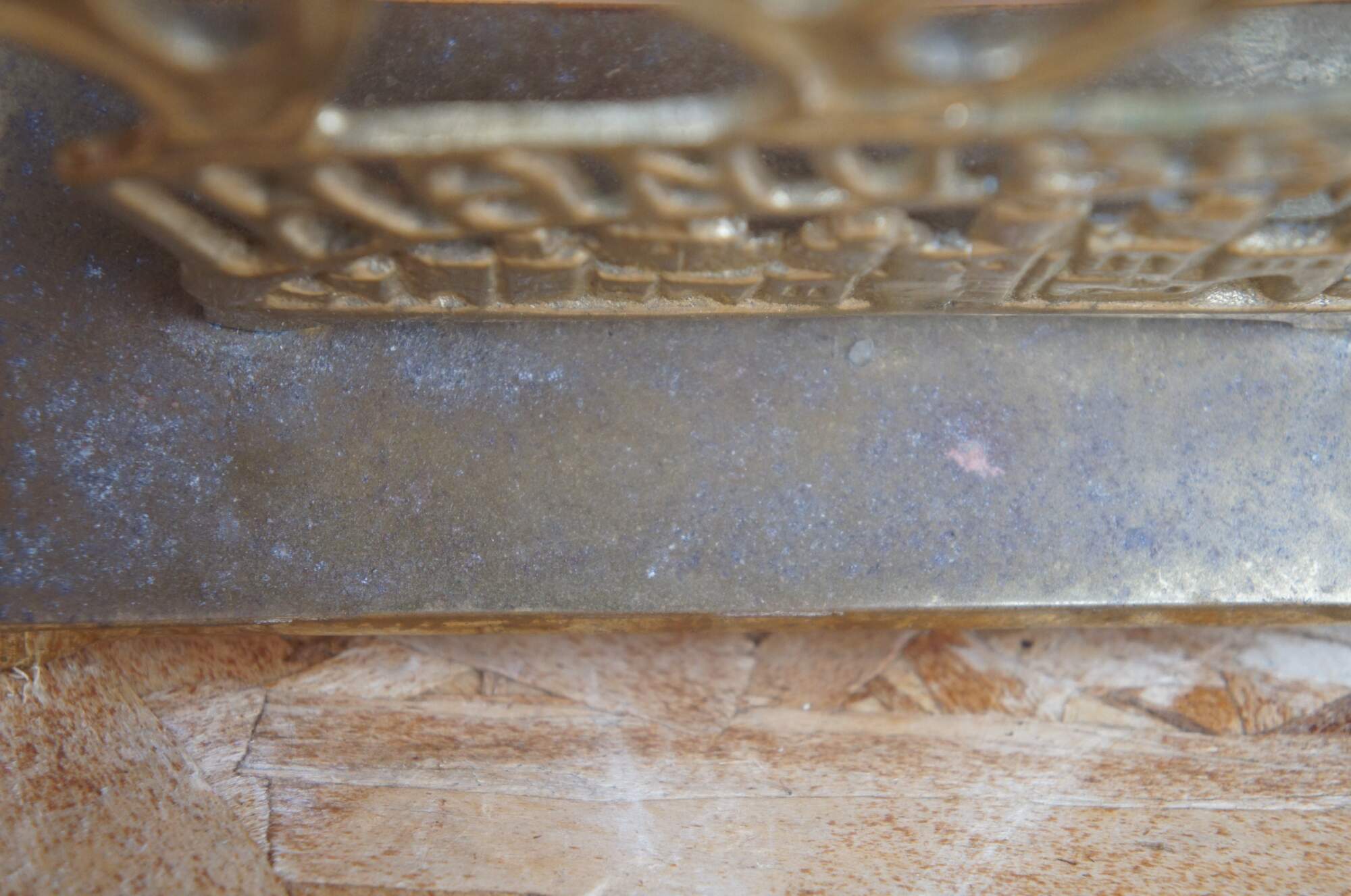 Small vintage brass menorah with the word Hanukah and delicate candle holders.