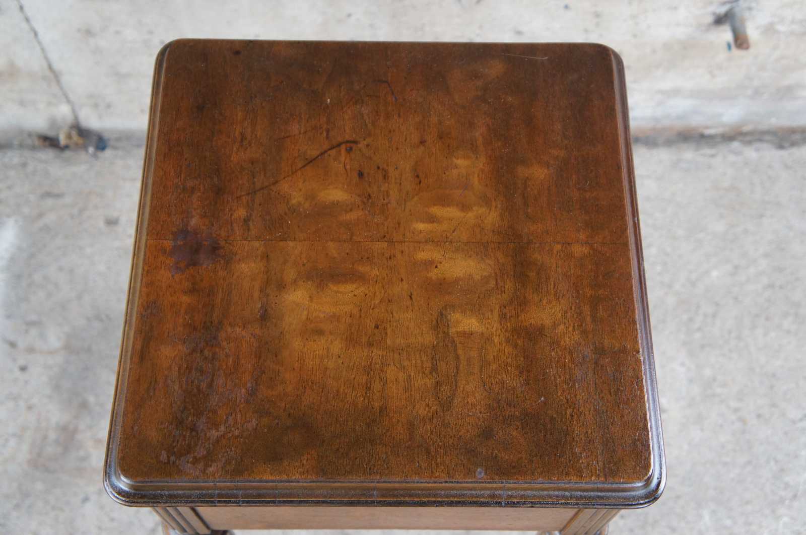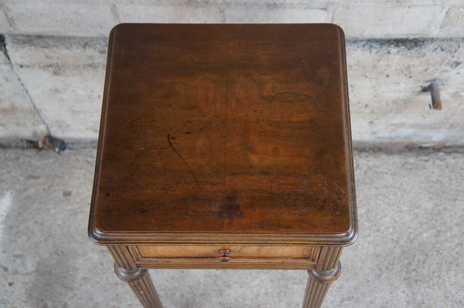 Early 20th century Louis XVI style walnut nightstand / bedside table or stand featuring beaded, fluted and tapered design.