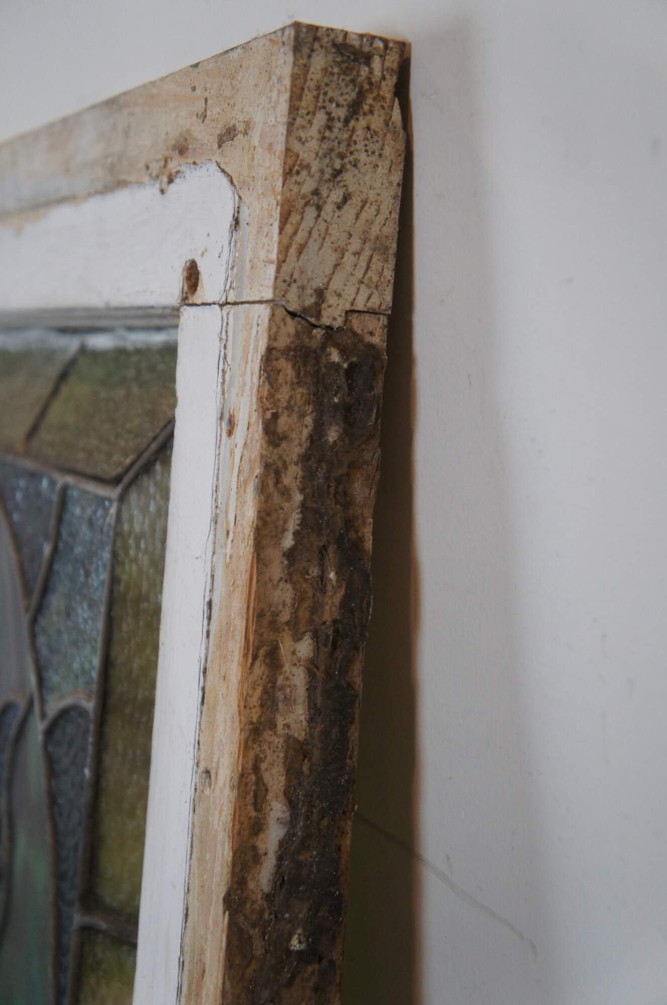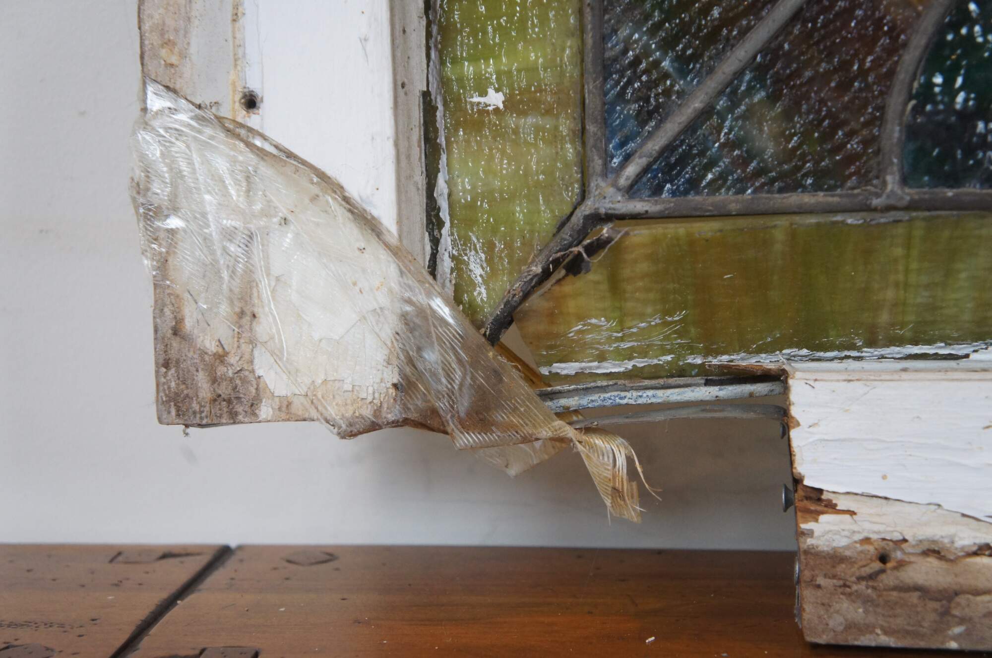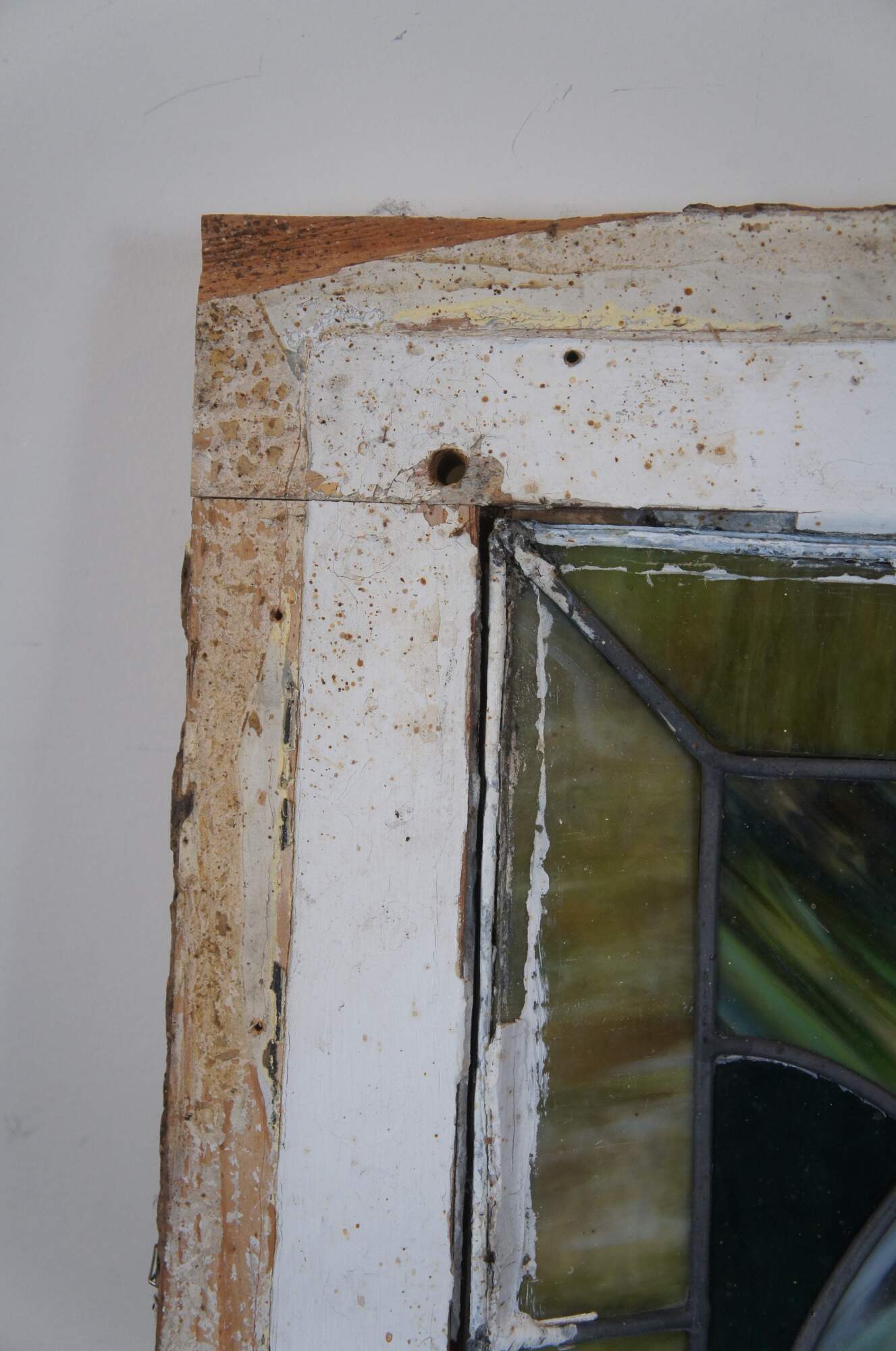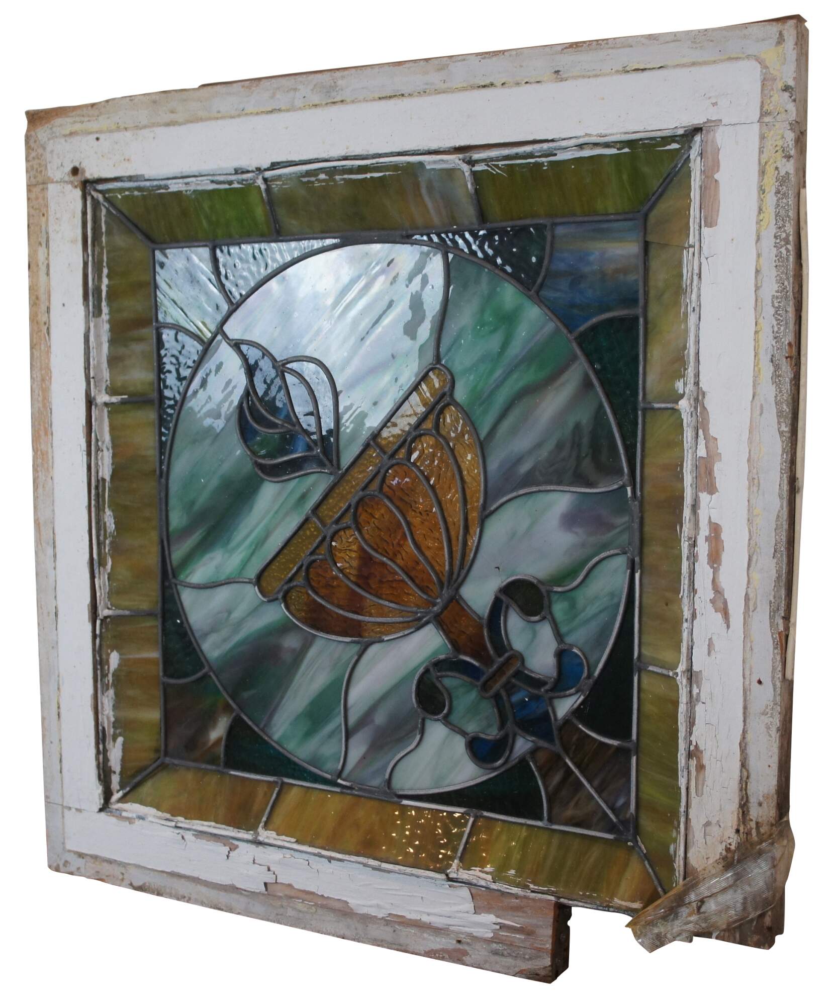 Repurposed salvaged antique stained glass window, features multifaceted color panes on the shape of a goblet with fire.
