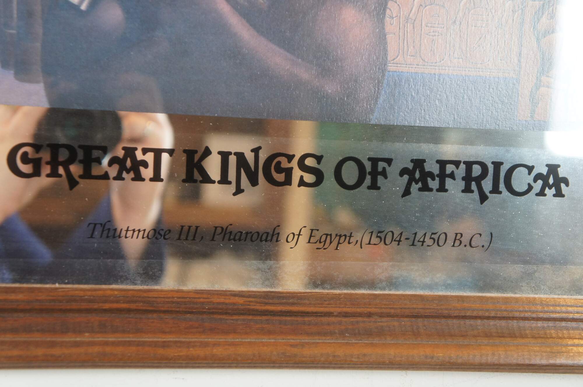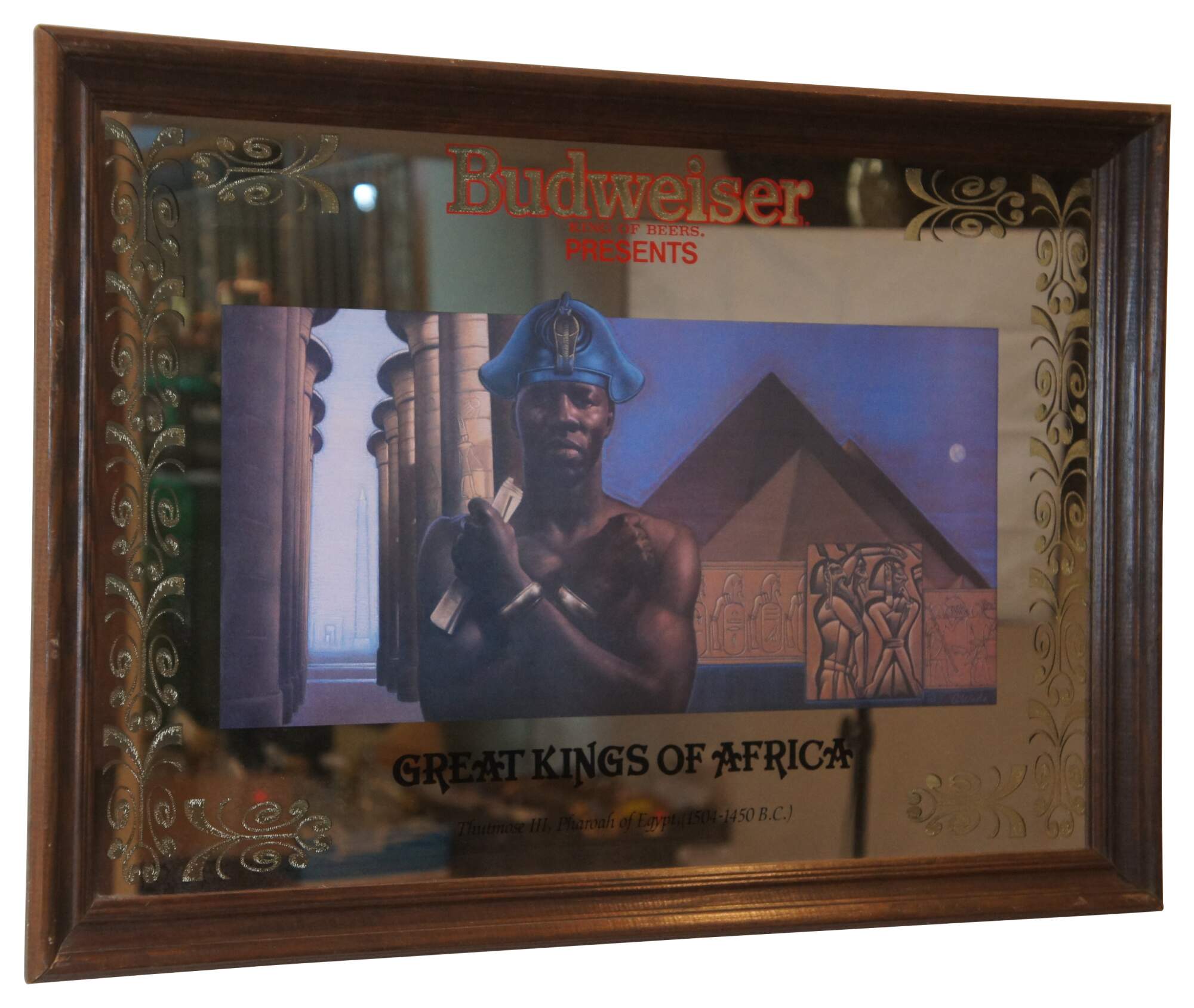 Framed ‘Great Kings of Africa’ mirror advertisement made by Budweiser featuring Egyptian Pharaoh Thutmose III.