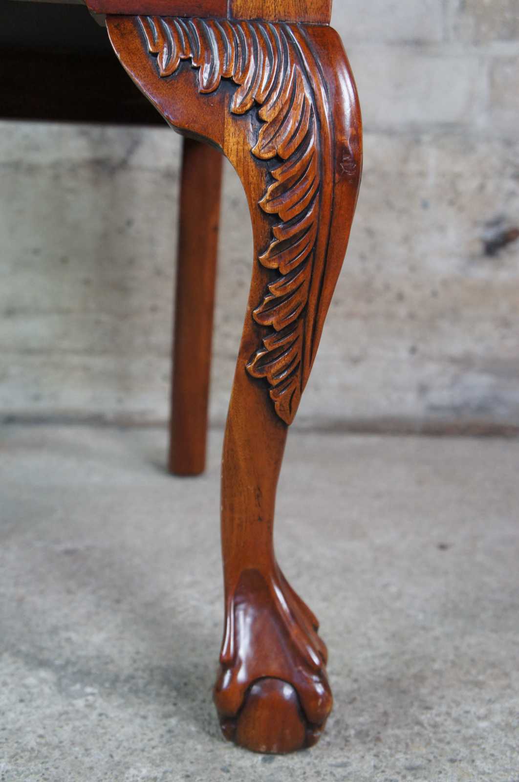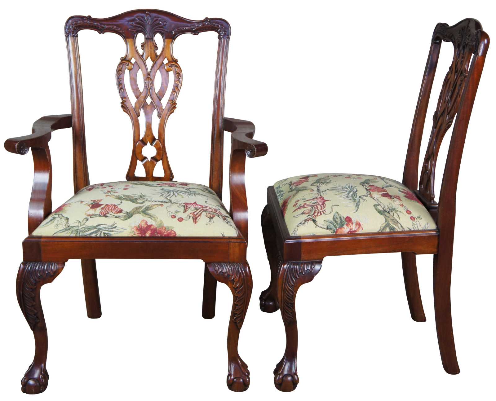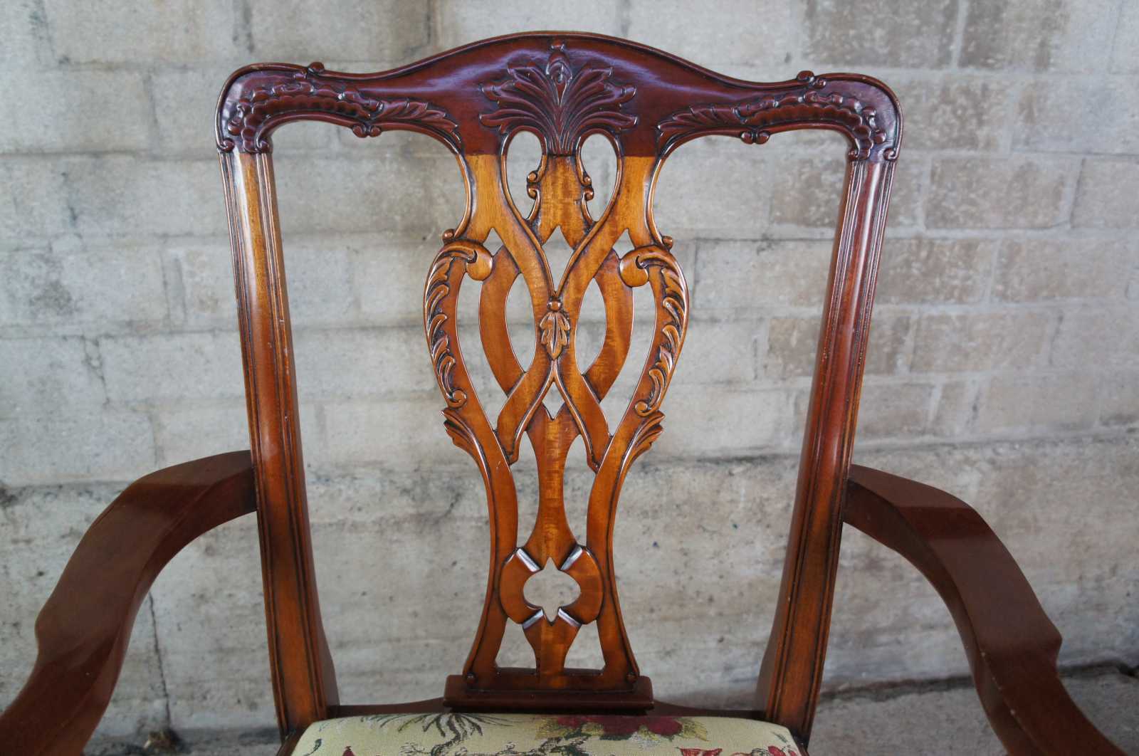 Set of ten chippendale dining chairs. Made of mahogany featuring serpentine form with a woven pretzel style back, acanthus carvings, and New York ball and claw feet. Upholstered seat featuring tapestry scene with climbing monkeys in asian hats picking apples. Made for Paramount Antiques, Inc of New York, circa 1980s.