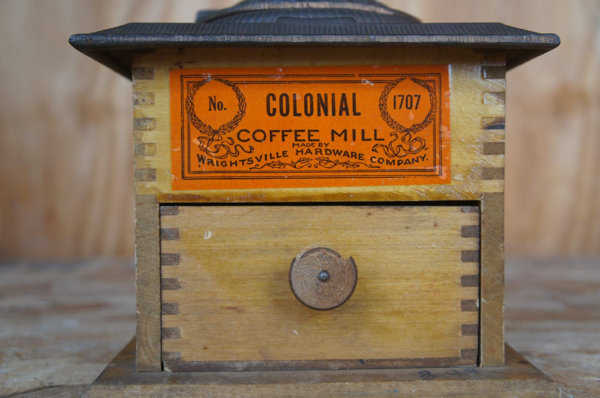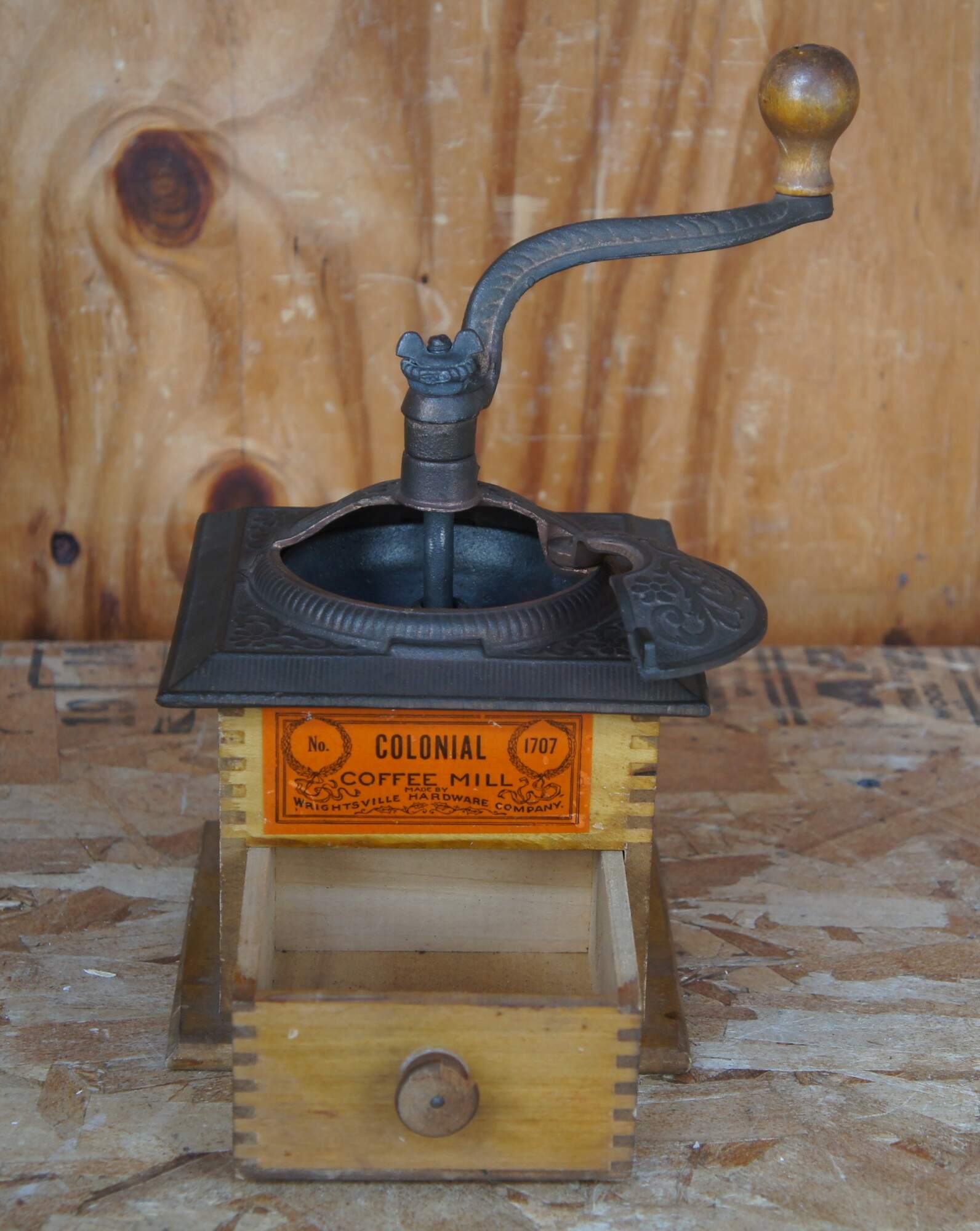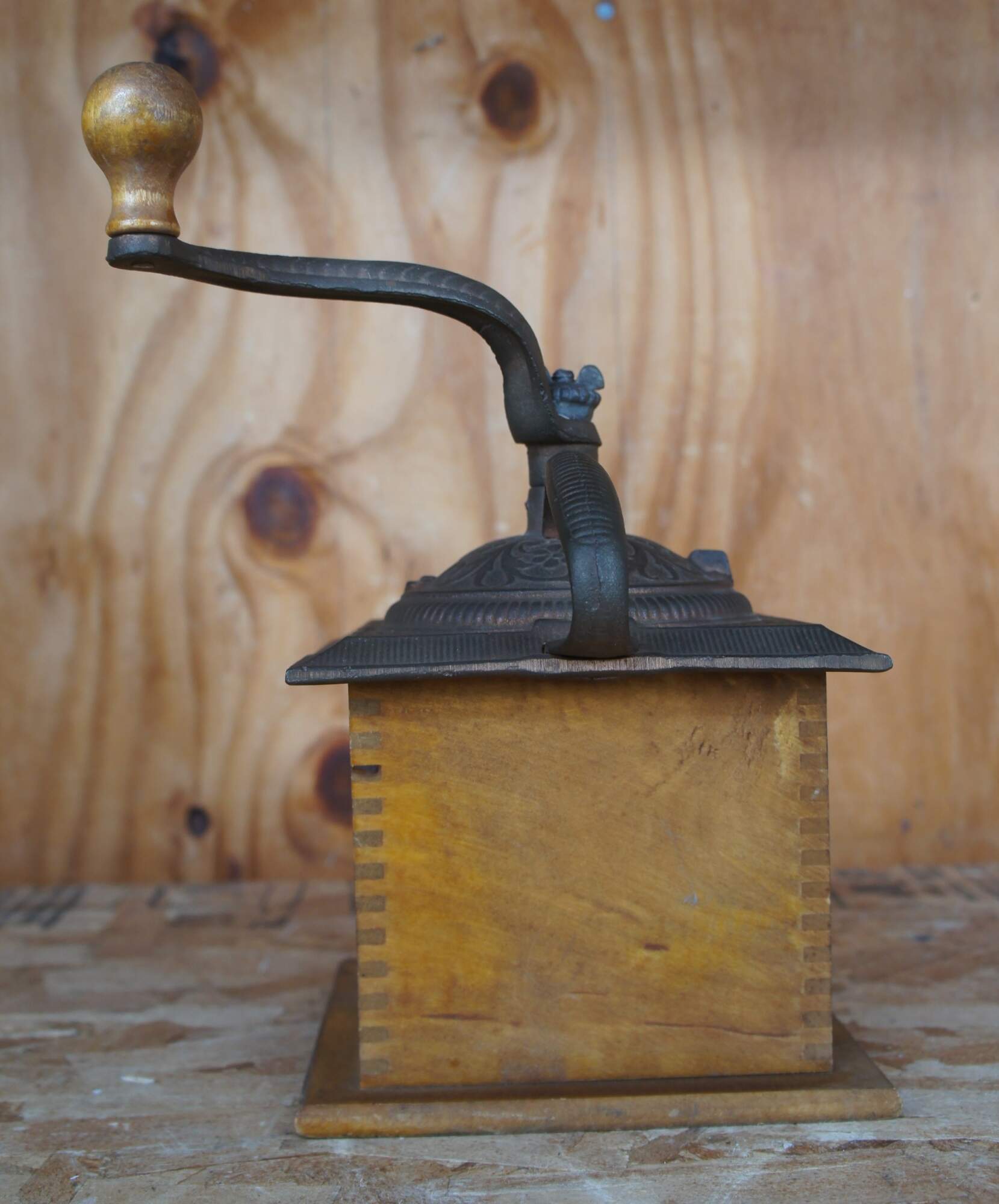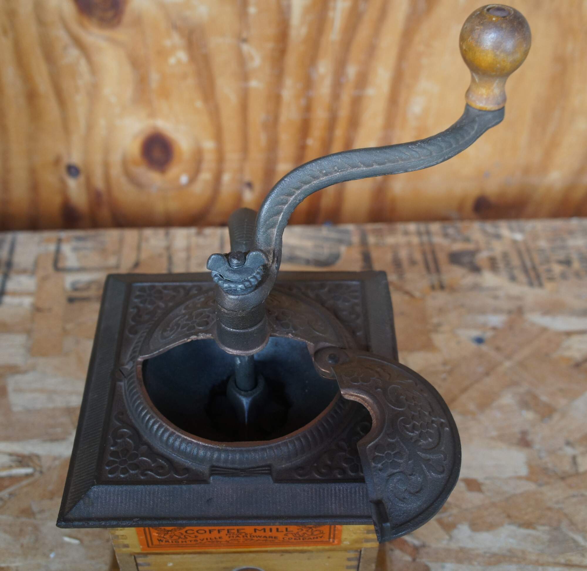 A vintage coffee grinder or mill made of wood with a cast iron top and hand crank.