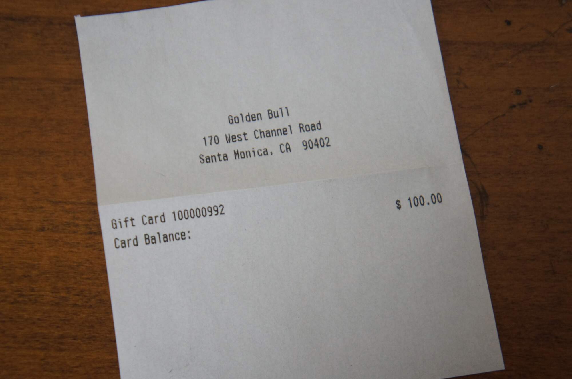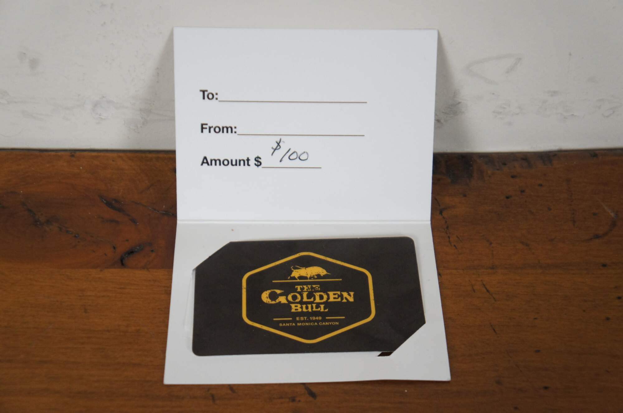 Un-used $100 gift card for The Golden Bull restaurant in Santa Monica, California.