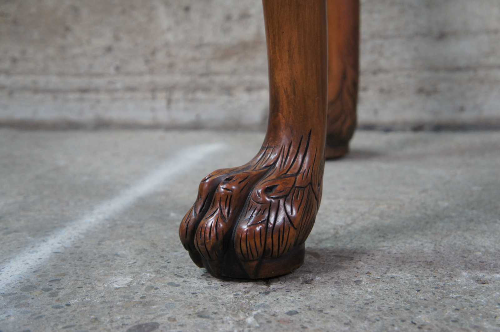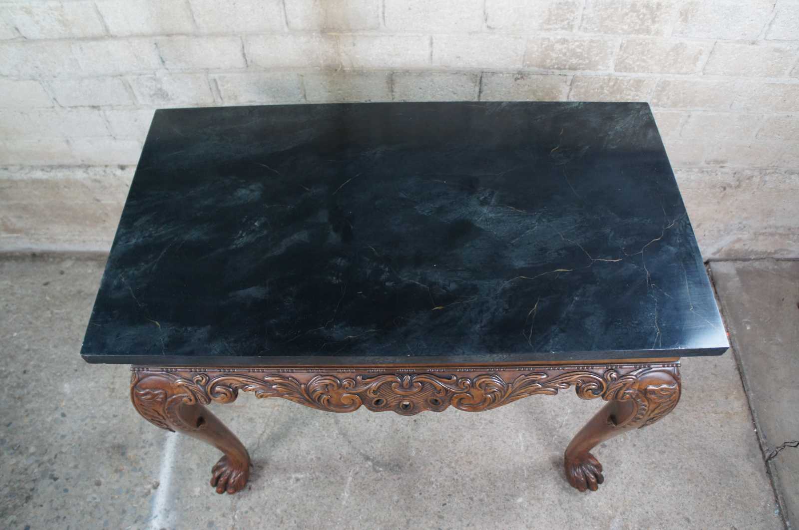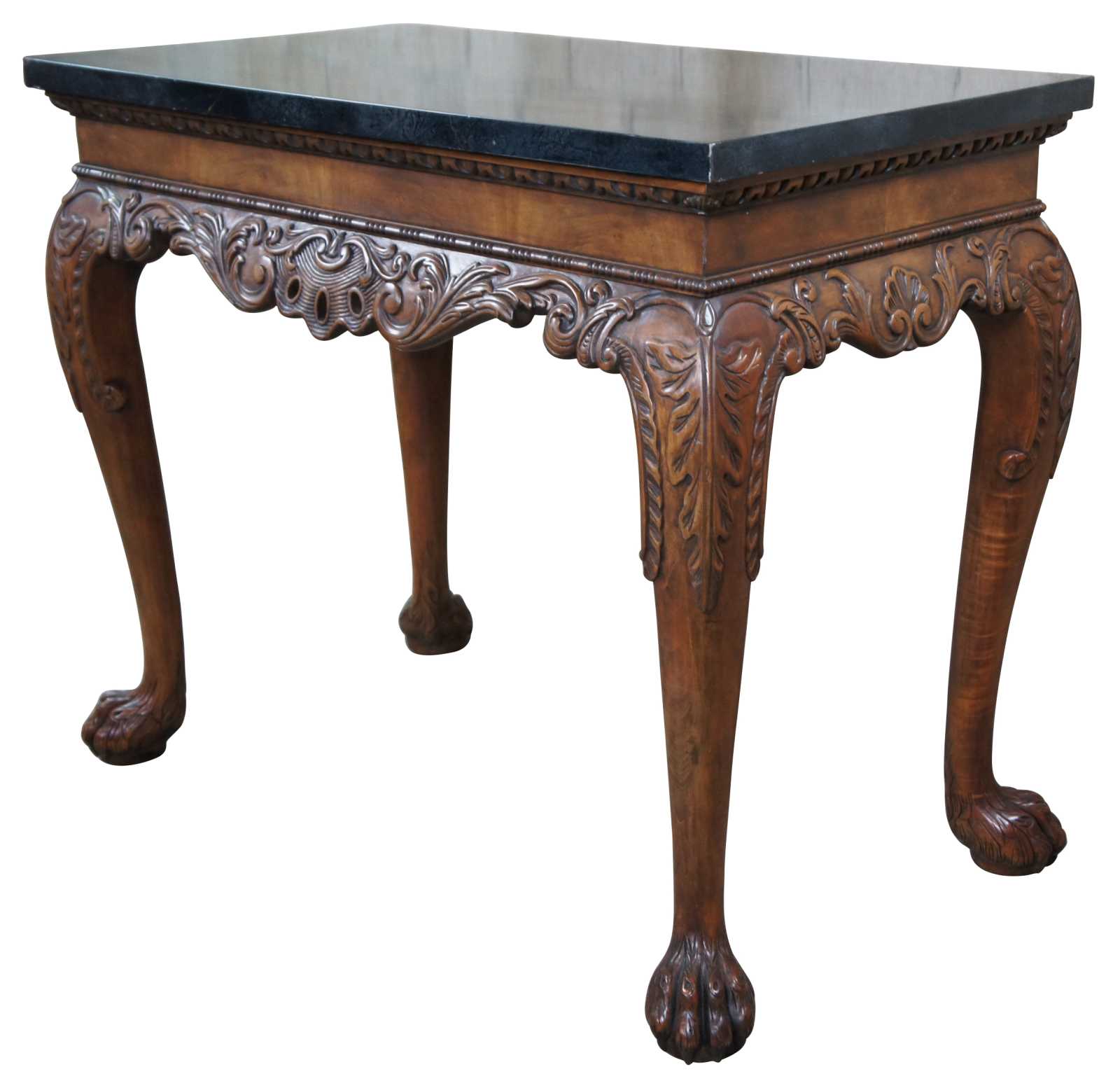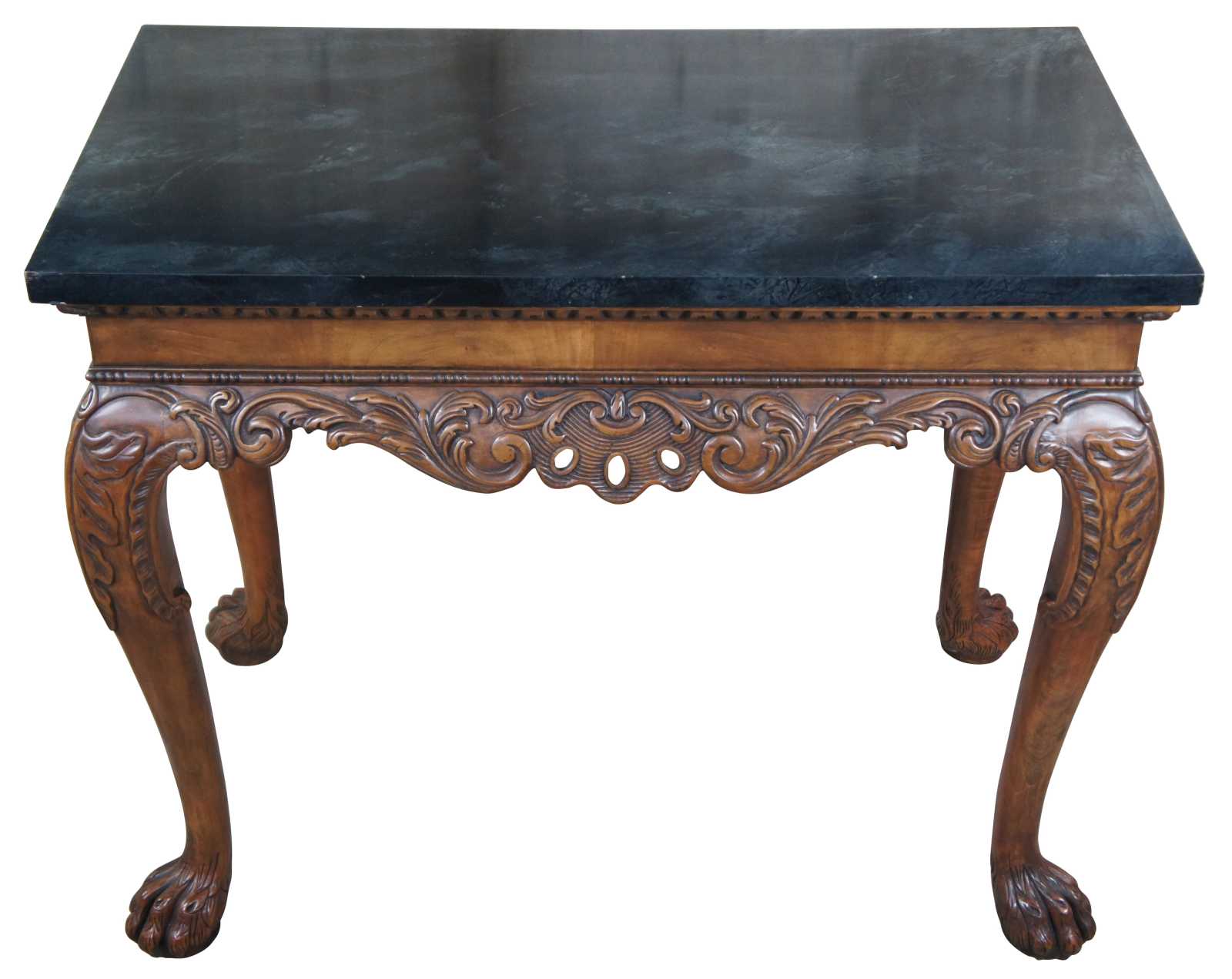 An elegant Baker Stately Homes drybar or server, circa last quarter 20th century. A rectangular form made from mahogany with dark green faux marble top. Features a beaded frieze with gadrooning over an acanthus carved and scrolled apron. Supported by long cabriole legs leading to hairy paw feet. Inspired by English, Georgian and Chippendale designs.