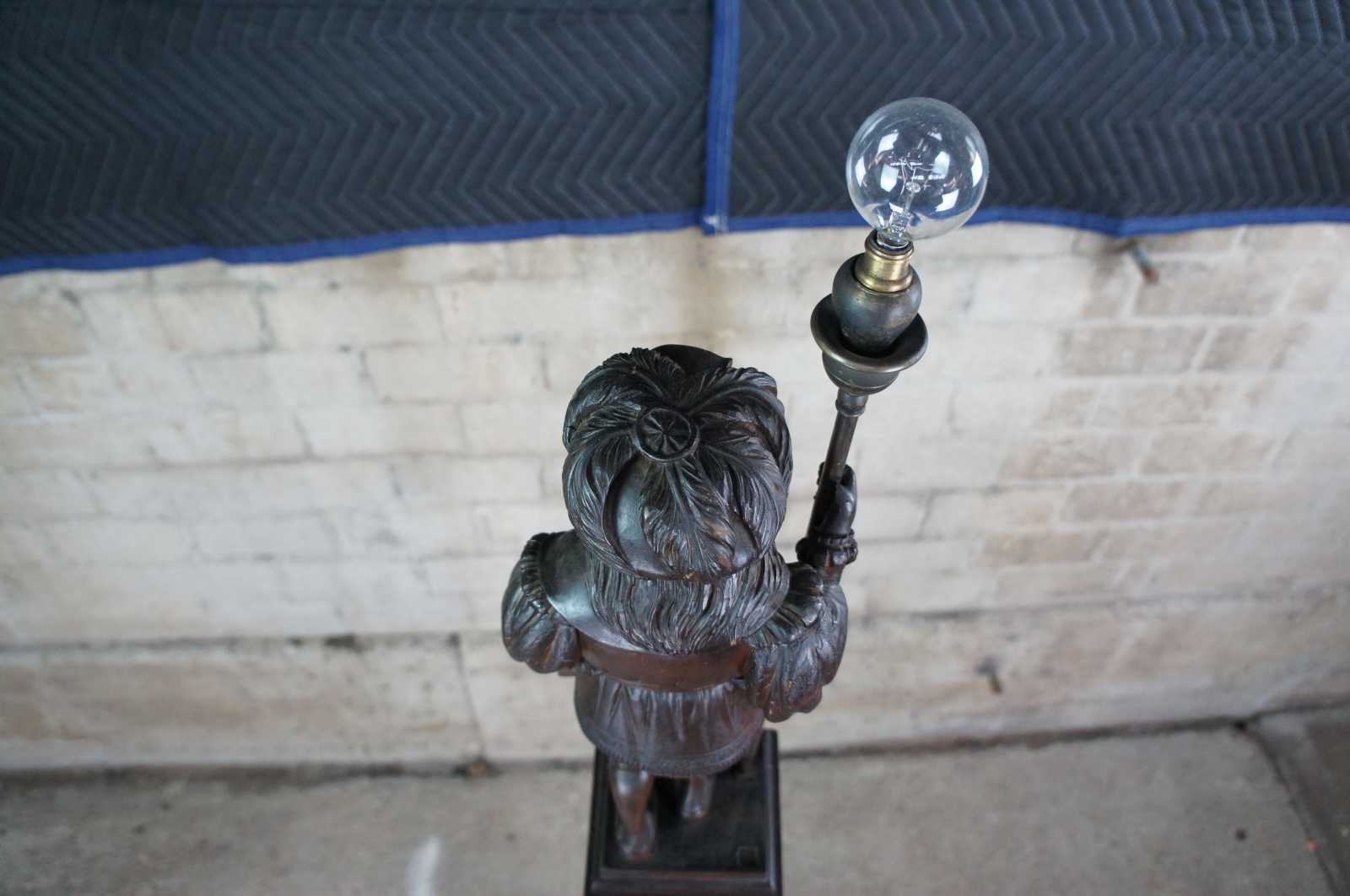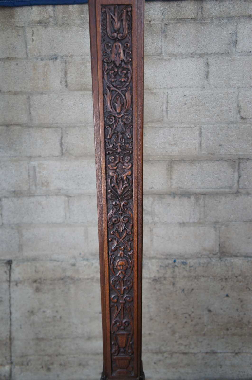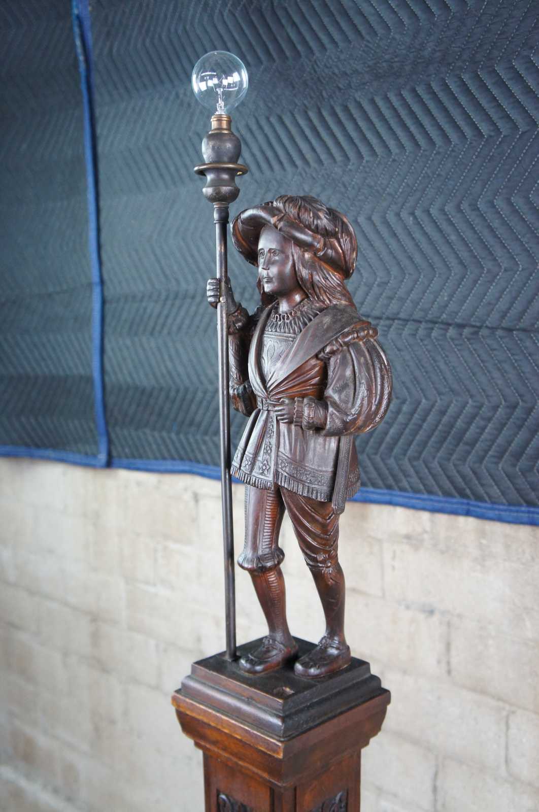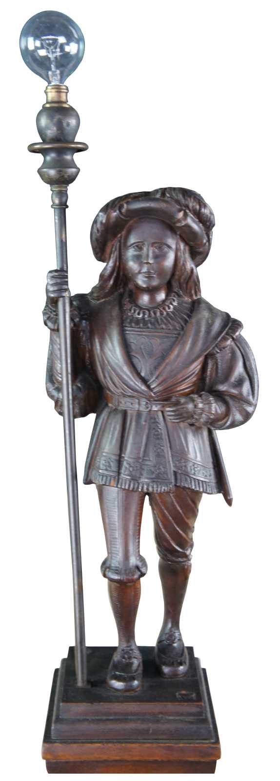 A rare and one of a kind antique figural carved oak floor lamp, circa 1920s. Meticulously carved with amazing detail throughout. Features a Swiss guard with torchiere staff atop a square tapered heraldic column leading to dolphin base. Columnar sides include trophy urns, scrollwork, flowers, faces and cherubs. Lamp illuminates via switch along rear.