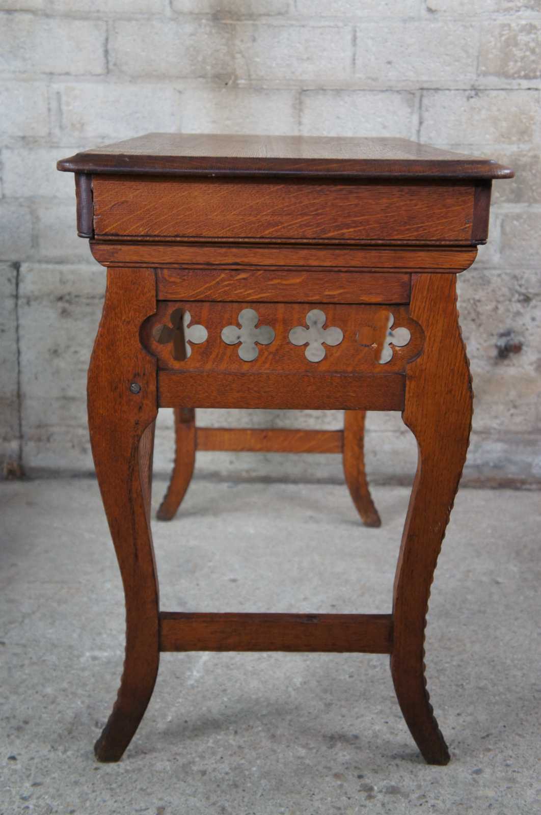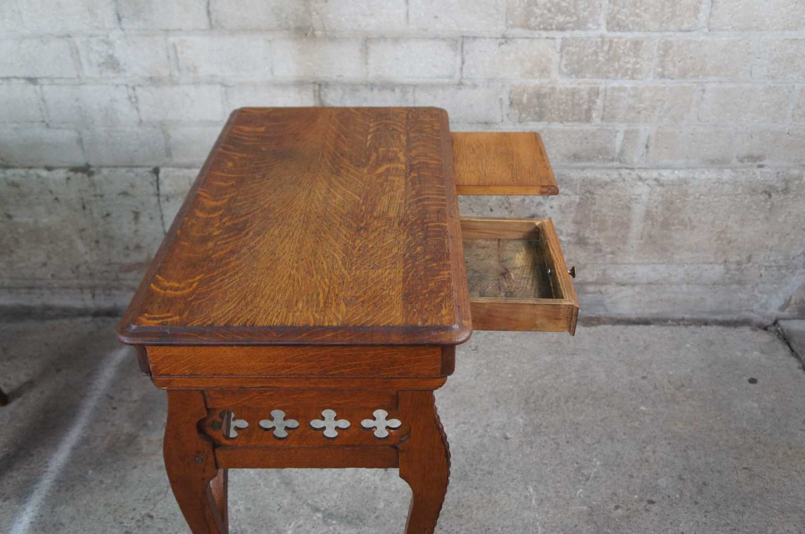 Pair of antique Civil War Era folding Campaign desks. Made of quartersawn oak featuring Gothic quatrefoil and beaded carved accents with drawer and pull out writing surface. Neatly folds for travel.