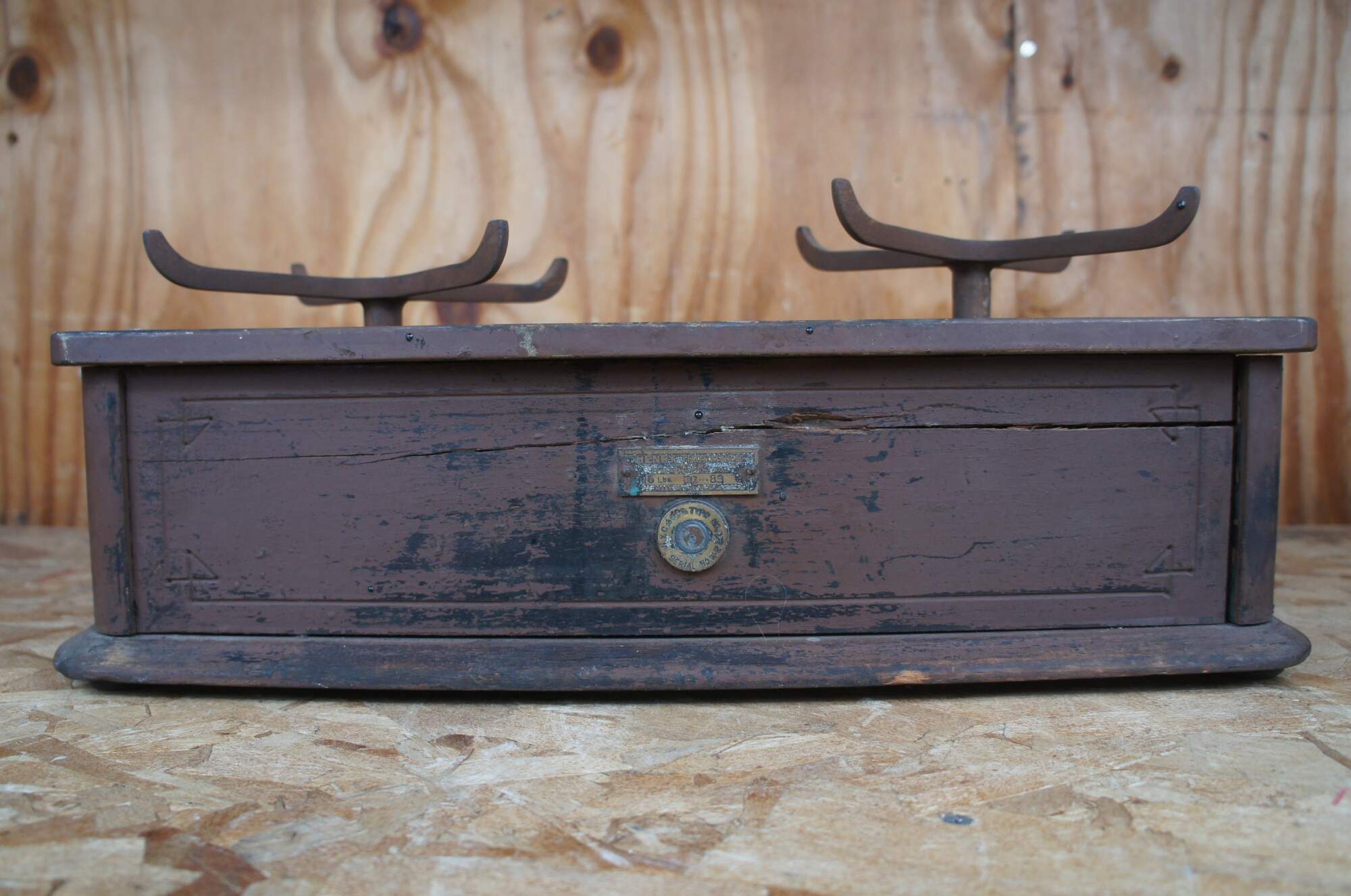 Antique Victorian mechanical apothecary or pharmacy balance scale with wood construction featuring Eastlake styling. Includes two cast iron 1 kilo weights.