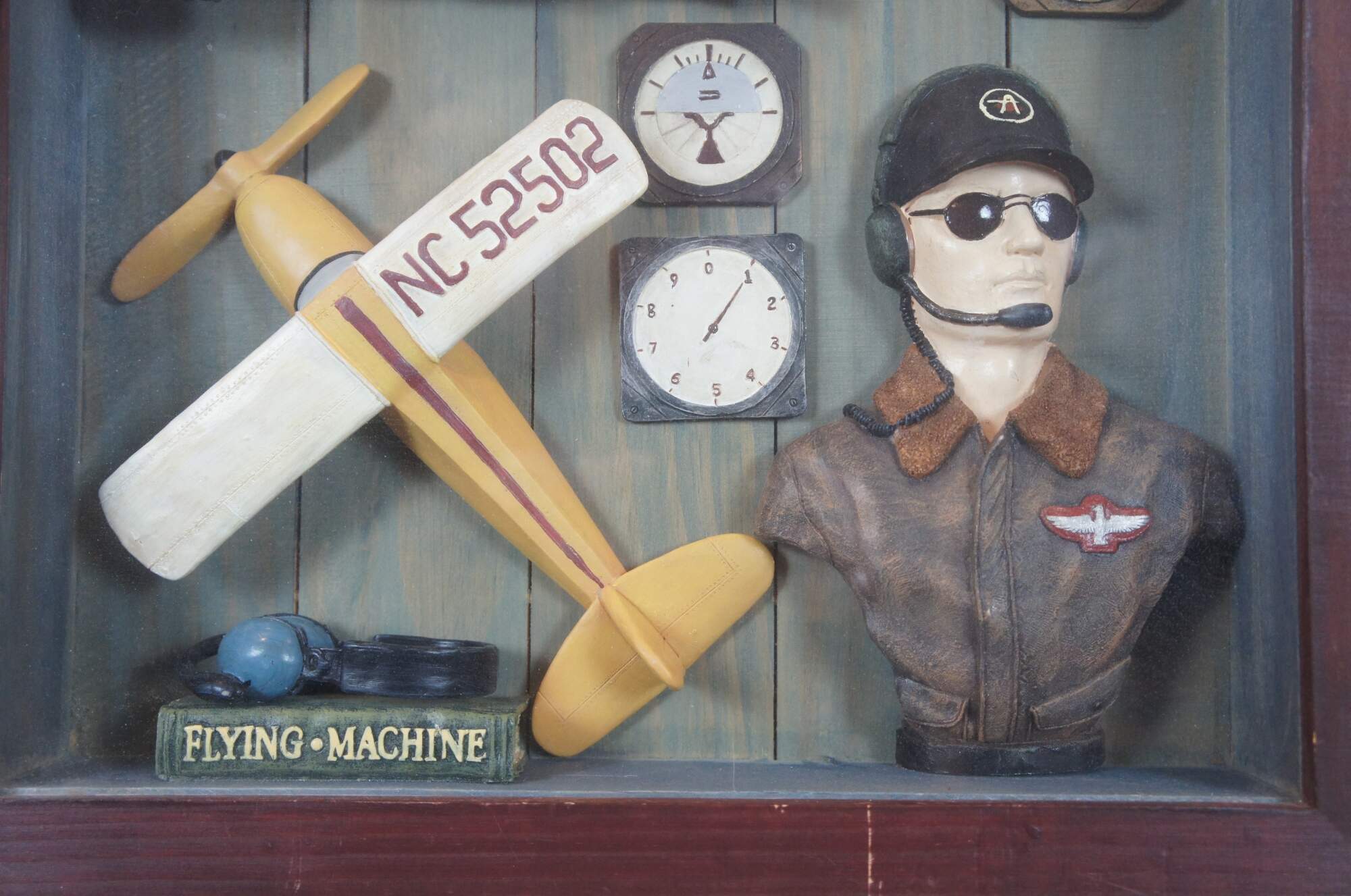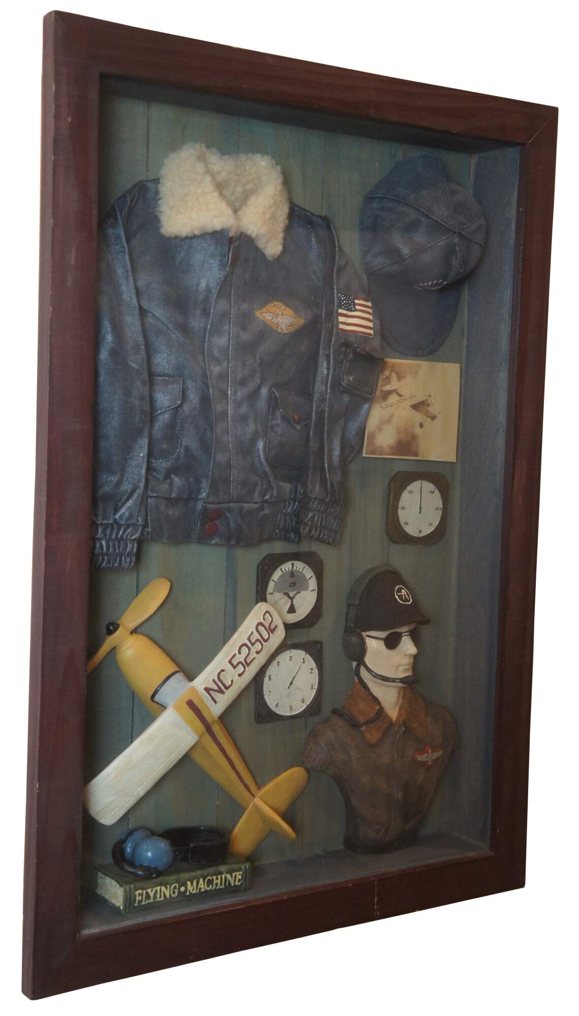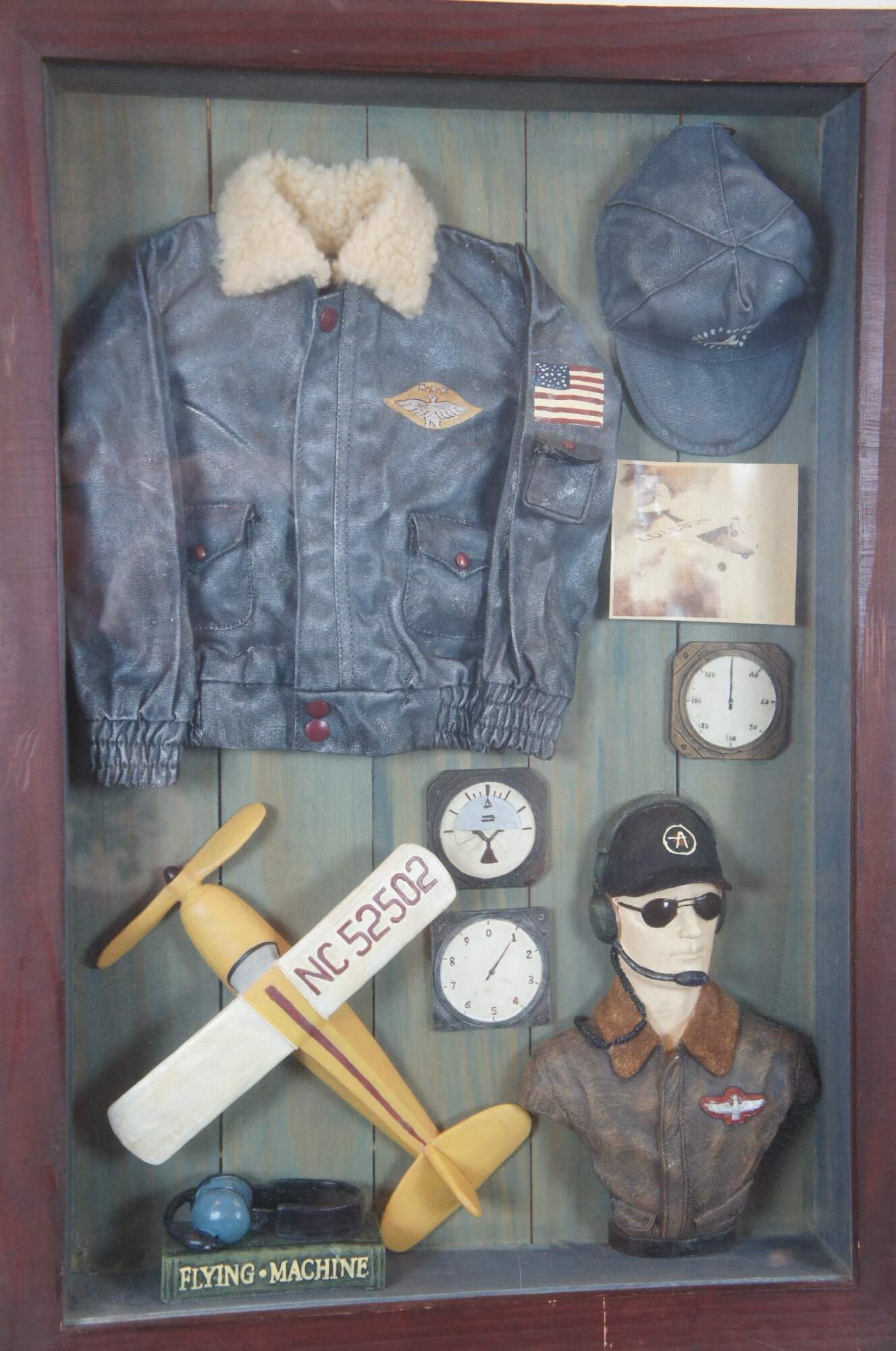 Vintage aeronaut shadow box or display featuring pilot, aviator / bomber jacket, hat, NC 52502 plane / aircraft (most likely a piper cub), Flying Machine book, head gear, and other collectible items.