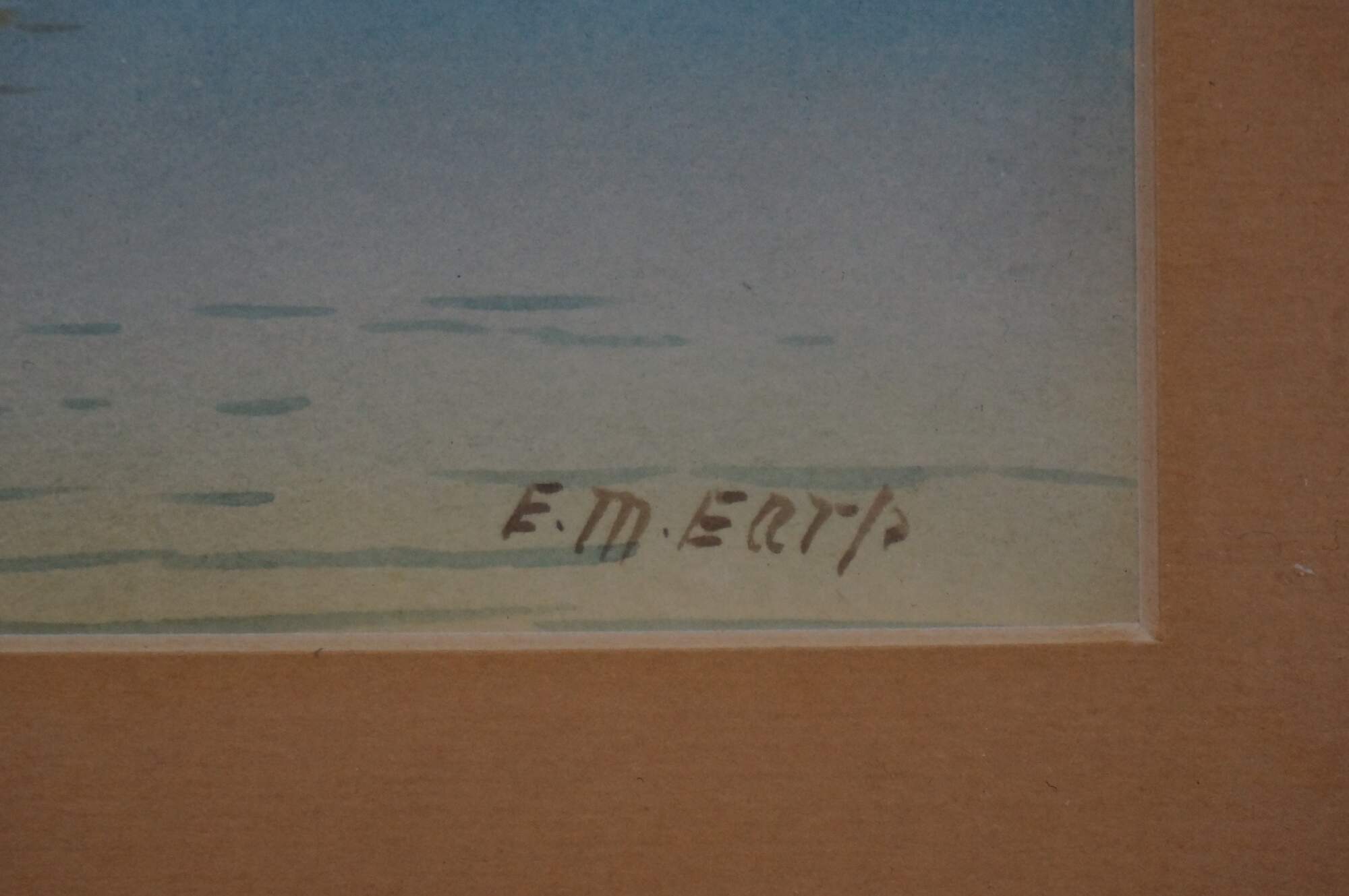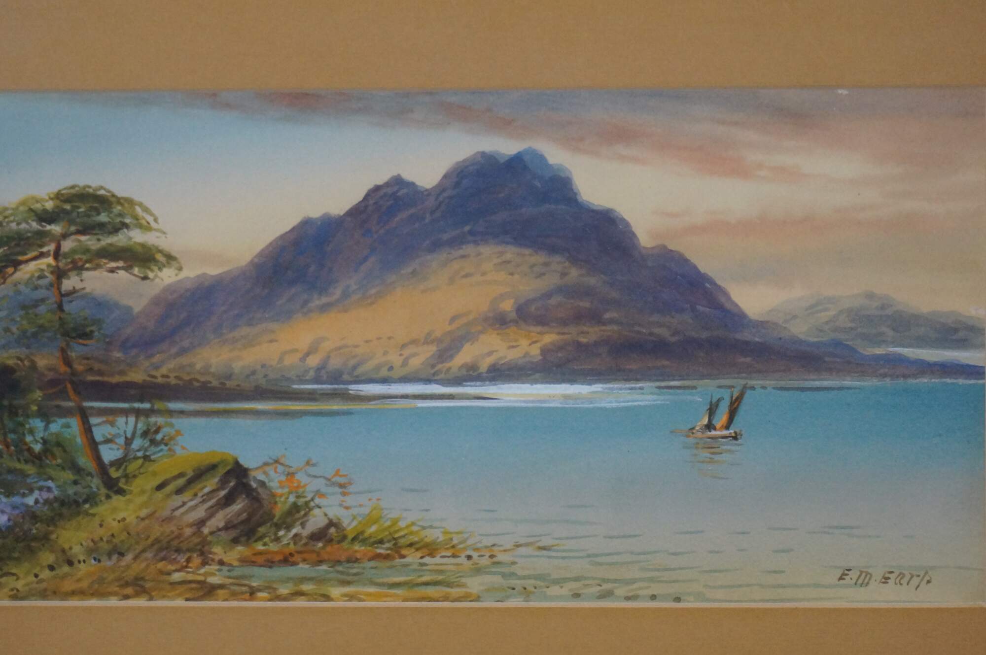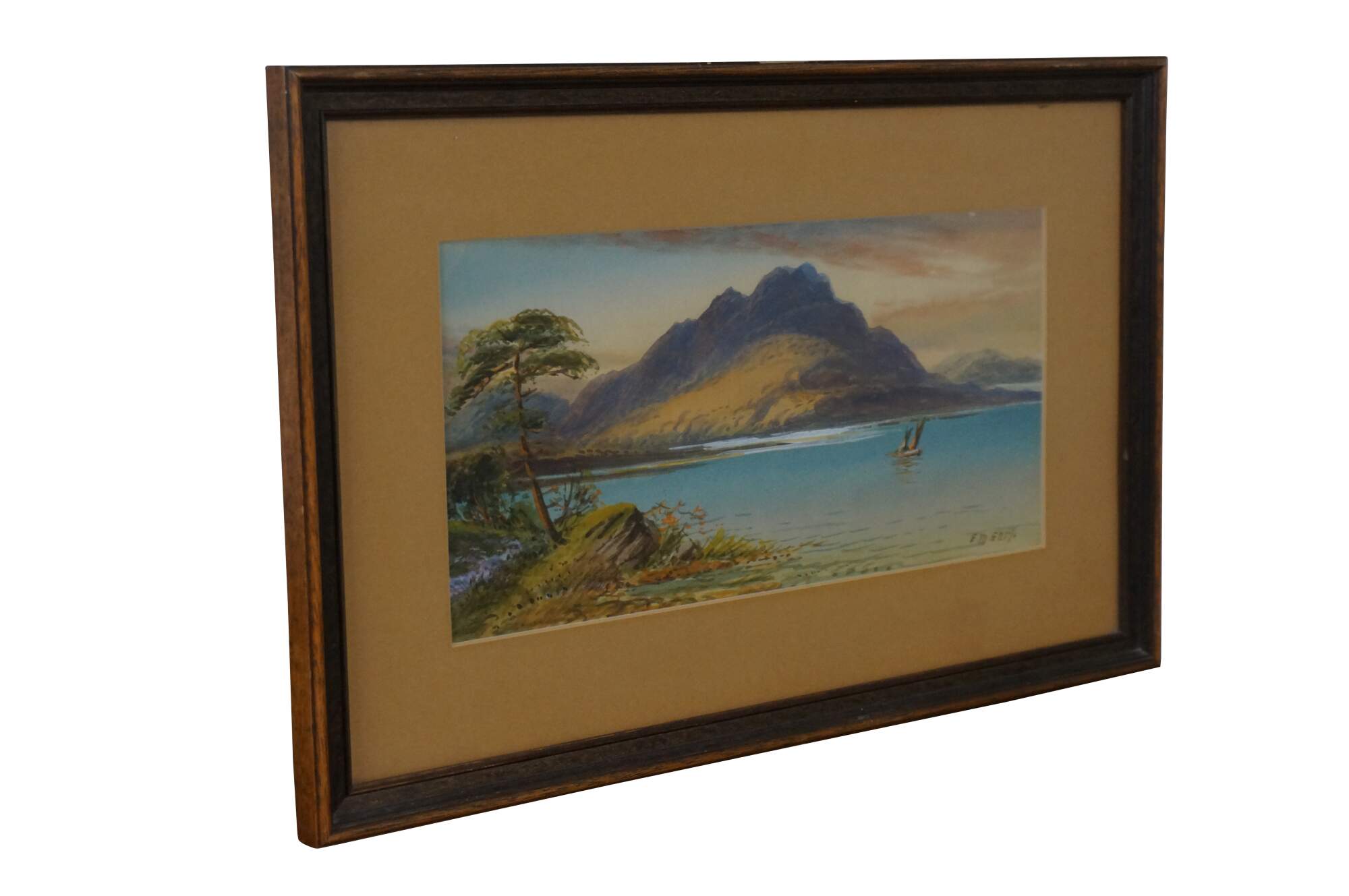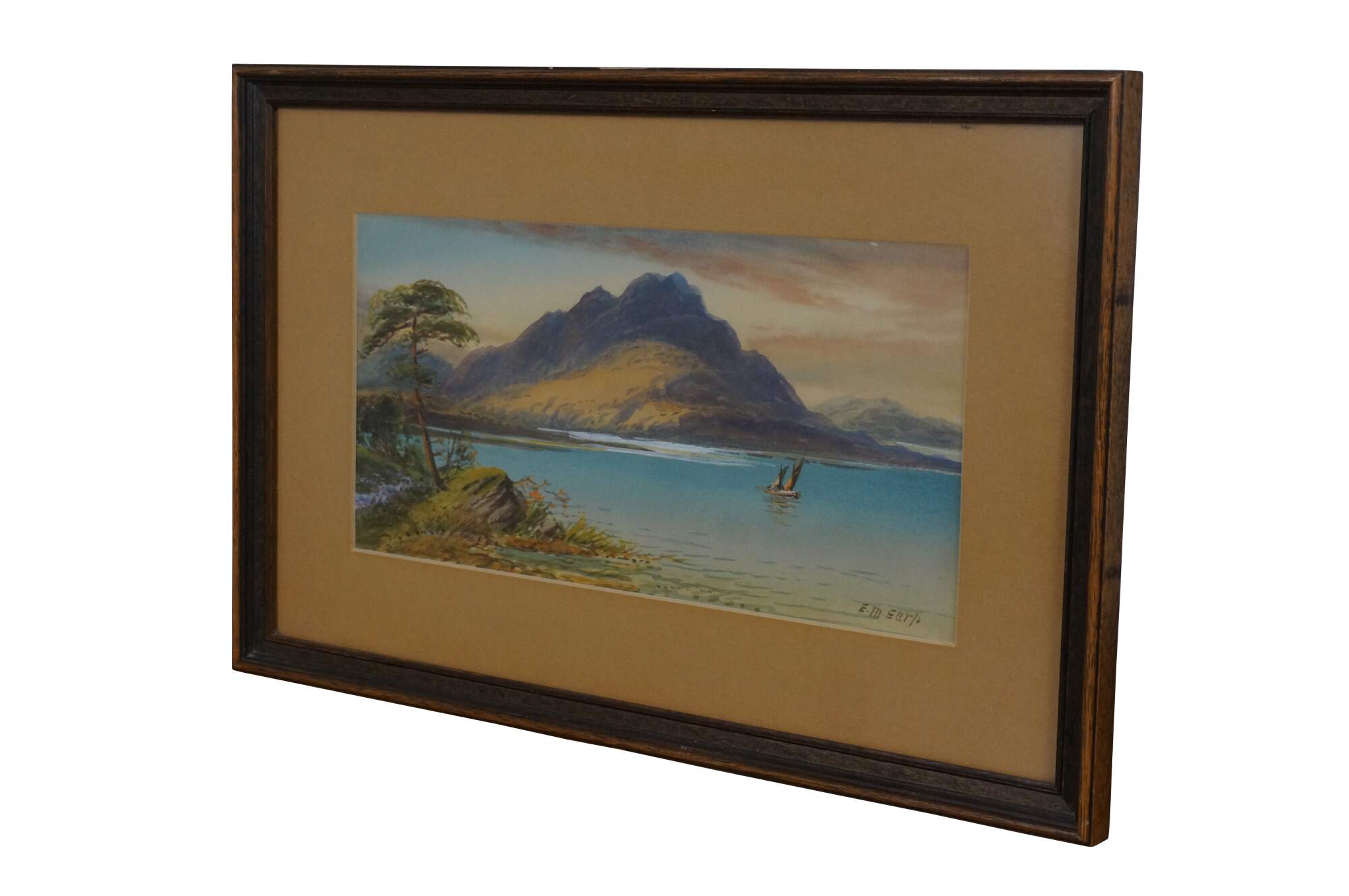 Signed watercolor seascape painting by Edwin Earp featuring a calm landscape with a mountain / tree / lake / ocean / river scene and boat. Attributed location Loch Tay Scotland.