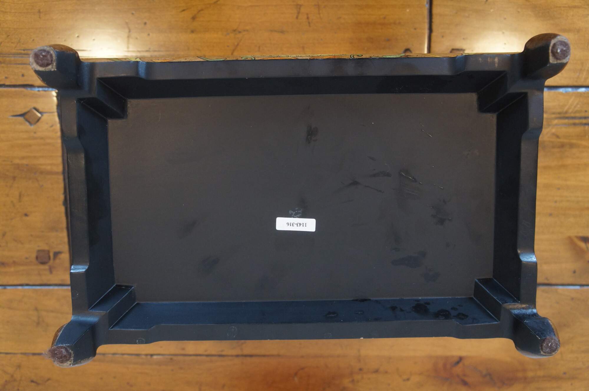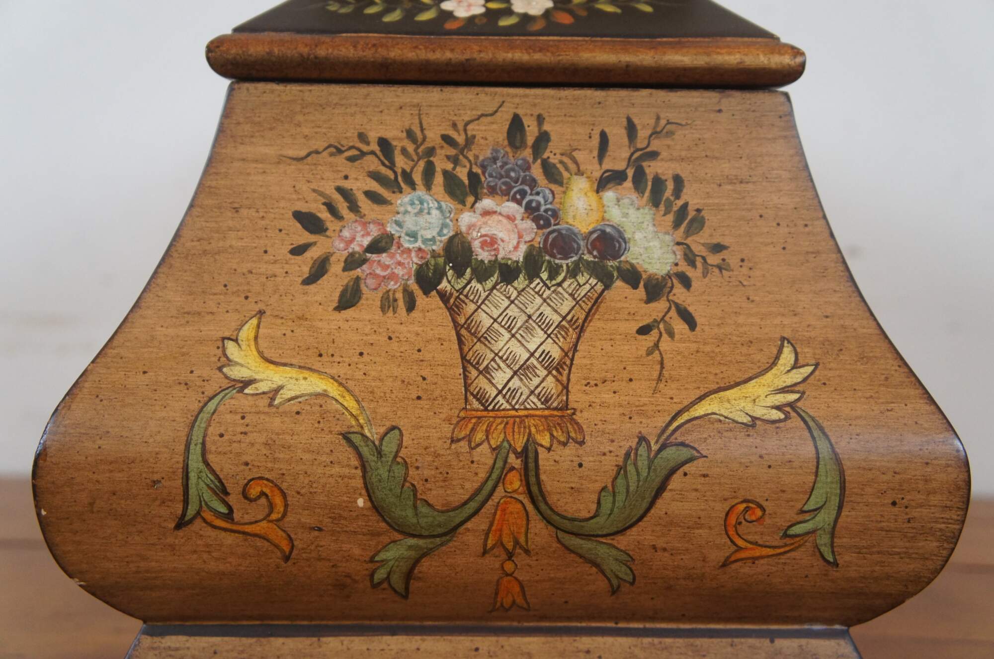 Vintage lidded and footed storage box, chest or caddy featuring bombe form with painted still life design of fruits, florals, and geometric accents.