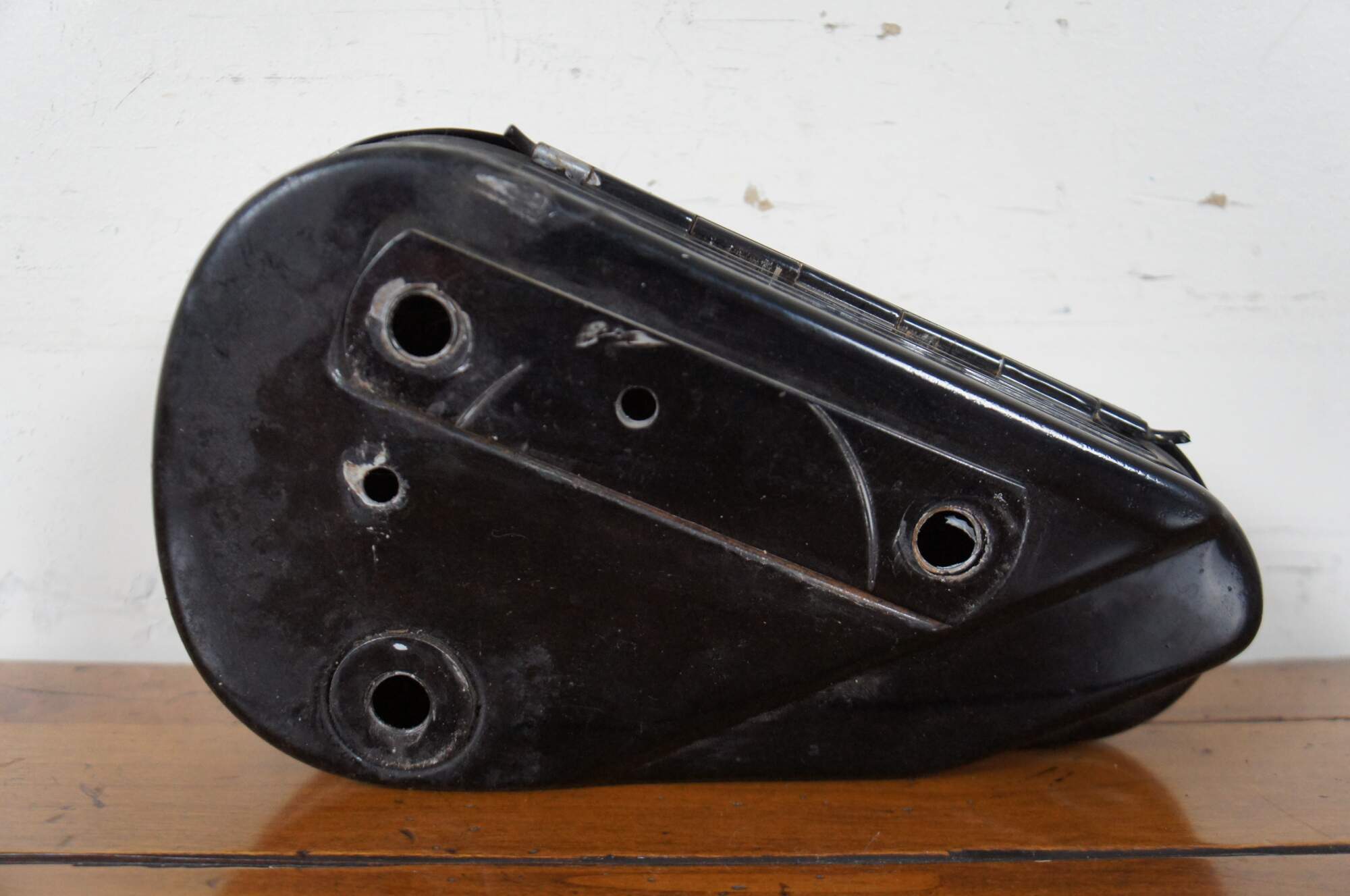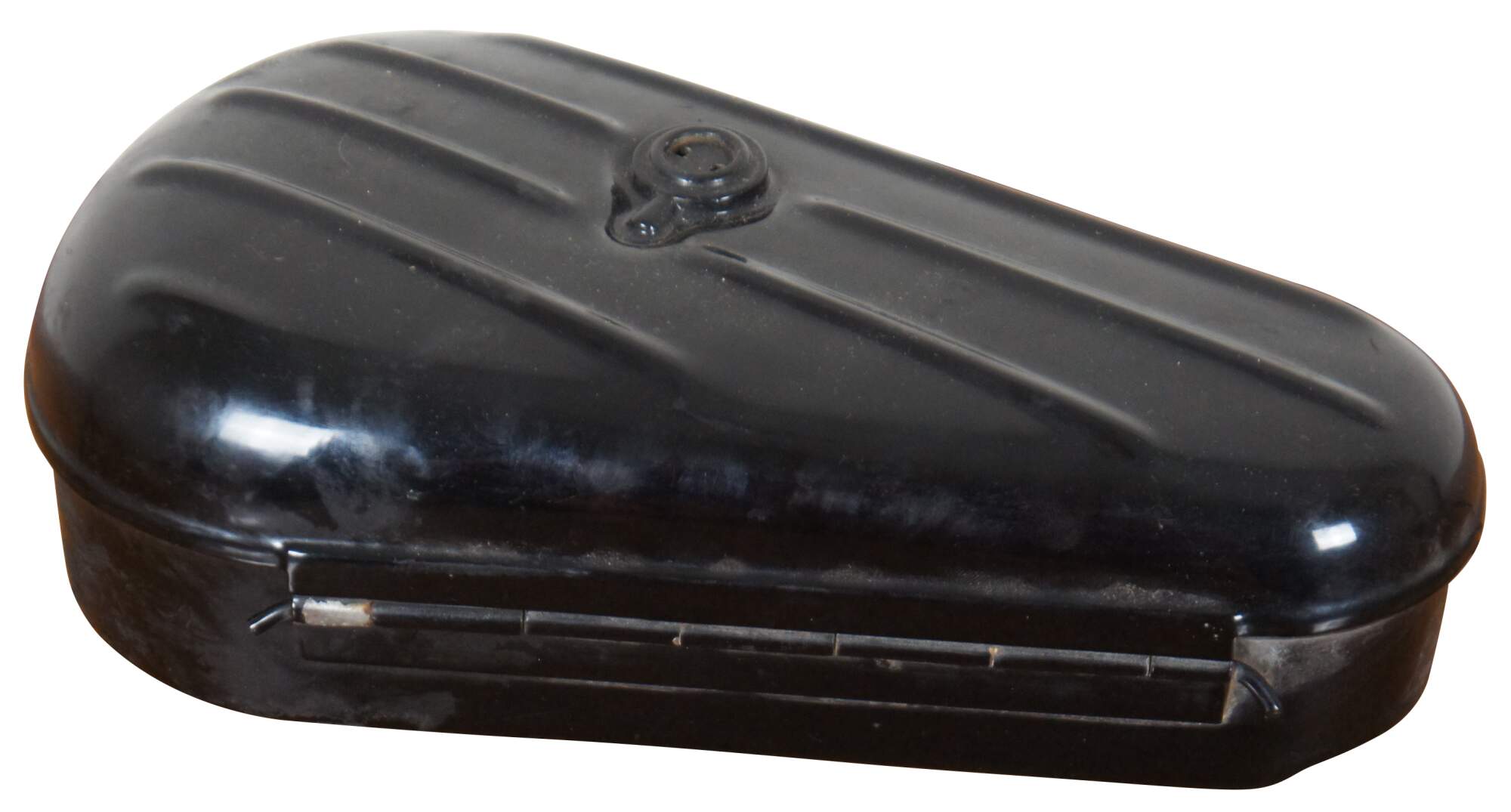 1950s Rare Vintage Harley-Davidson black ribbed kidney shaped OEM Hydraglide metal tool box for all Panhead motorcycles from 1940-1964. Originally purchased in the 1980s from the Pennsylvania warehouse where a cache of old Harley parts were discovered.